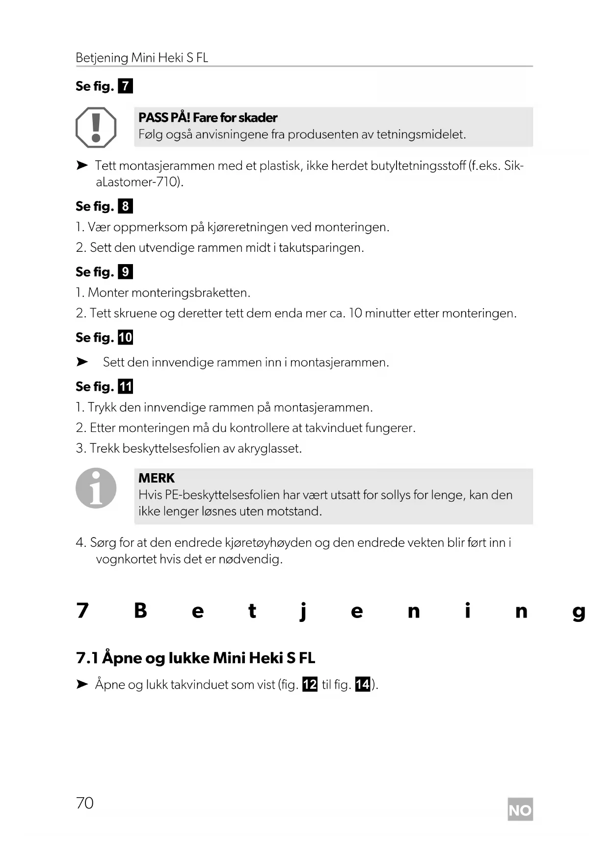 Se fig. 5 ➤ Kontroller at takvinduet har tilstrekkelig avstand (ca.1 til 2 mm) til takutsparingen hele veien rundt. Se fig. 6 ➤ Rengjør hullet i montasjeområdet. PASS PÅ! Fare for skader Hvis du ikke har nok teknisk kunnskap om montering av komponenter i kjøretøy, må du få fagfolk til å montere takvinduet. DometicMiniHeki-S-FL_IOM_4445104092_EMEA24_202x-xx-xx.book Page 69 Thursday, July 6, 2023 2:00 PMNO Betjening Mini Heki S FL