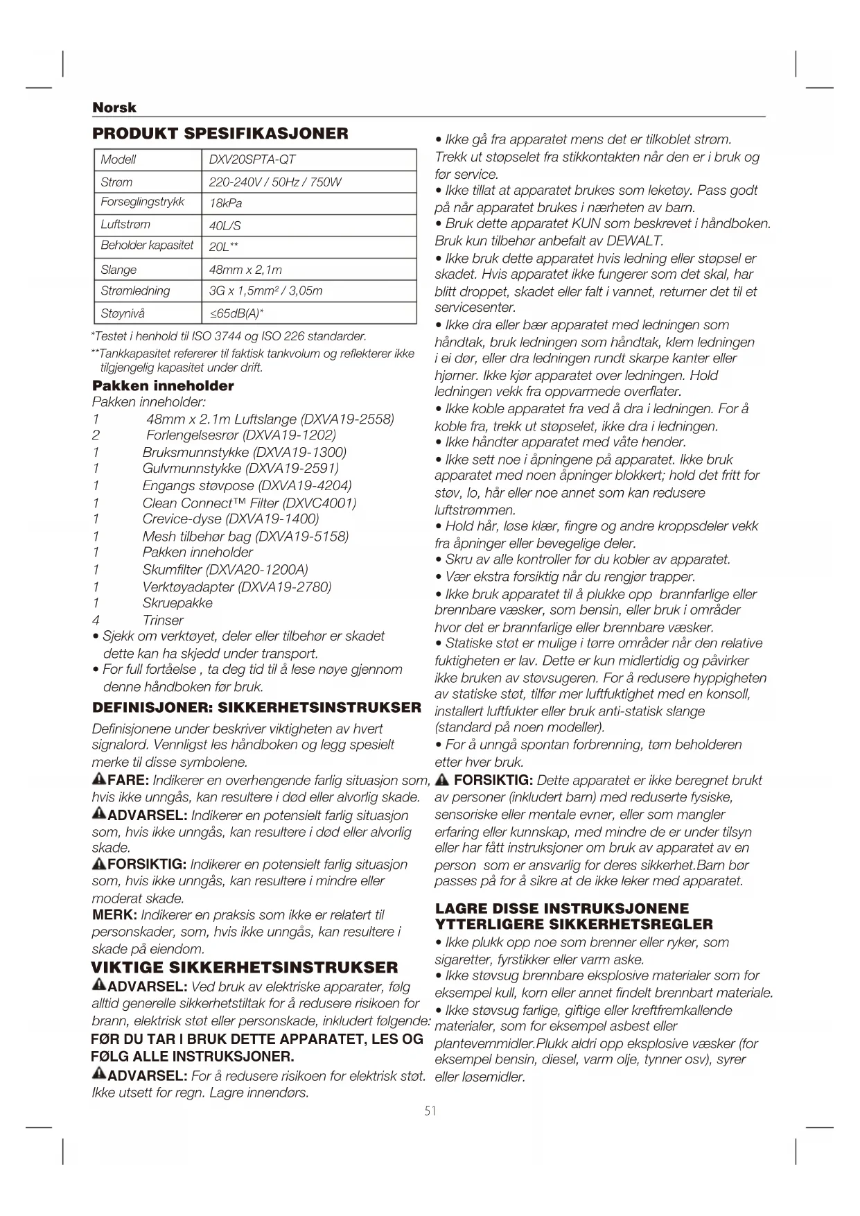 - For å unngå spontan forbrenning, tøm beholderen etter hver bruk. FØR DU TAR I BRUK DETTE APPARATET, LES OG FØLG ALLE INSTRUKSJONER. Modell 220-240V / 50Hz / 750W 18kPa 20L** 48mm x 2,1m 3G x 1,5mm² / 3,05m ≤65dB(A)* *Testet i henhold til ISO 3744 og ISO 226 standarder. **Tankkapasitet refererer til faktisk tankvolum og reekterer ikke tilgjengelig kapasitet under drift. 40L/S Støynivå DXV20SPTA-QT