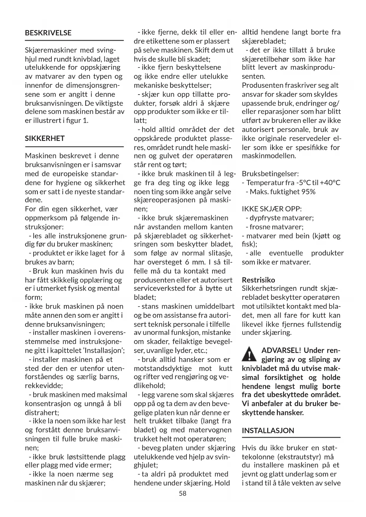 Fig. 158 BESKRIVELSE Skjæremaskiner med sving- hjul med rundt knivblad, laget utelukkende for oppskjæring av matvarer av den typen og innenfor de dimensjonsgren- sene som er angitt i denne bruksanvisningen. De viktigste delene som maskinen består av er illustrert i gur 1. SIKKERHET Maskinen beskrevet i denne bruksanvisningen er i samsvar med de europeiske standar- dene for hygiene og sikkerhet som er satt i de nyeste standar- dene. For din egen sikkerhet, vær oppmerksom på følgende in- struksjoner: - les alle instruksjonene grun- dig før du bruker maskinen; - produktet er ikke laget for å brukes av barn; - Bruk kun maskinen hvis du har fått skikkelig opplæring og er i utmerket fysisk og mental form; - ikke bruk maskinen på noen måte annen den som er angitt i denne bruksanvisningen; - installer maskinen i overens- stemmelse med instruksjone- ne gitt i kapittelet ’Installasjon’; - installer maskinen på et sted der den er utenfor uten- forståendes og særlig barns, rekkevidde; - bruk maskinen med maksimal konsentrasjon og unngå å bli distrahert; - ikke la noen som ikke har lest og forstått denne bruksanvi- sningen til fulle bruke maski- nen; - ikke bruk løstsittende plagg eller plagg med vide ermer; - ikke la noen nærme seg maskinen når du skjærer; - ikke fjerne, dekk til eller en- dre etikettene som er plassert på selve maskinen. Skift dem ut hvis de skulle bli skadet; - ikke fjern beskyttelsene og ikke endre eller utelukke mekaniske beskyttelser; - skjær kun opp tillatte pro- dukter, forsøk aldri å skjære opp produkter som ikke er til- latt; - hold alltid området der det oppskårede produktet plasse- res, området rundt hele maski- nen og gulvet der operatøren står rent og tørt; - ikke bruk maskinen til å leg- ge fra deg ting og ikke legg noen ting som ikke angår selve skjæreoperasjonen på maski- nen; - ikke bruk skjæremaskinen når avstanden mellom kanten på skjærebladet og sikkerhet- sringen som beskytter bladet, som følge av normal slitasje, har oversteget 6 mm. I så til- felle må du ta kontakt med produsenten eller et autorisert serviceverksted for å bytte ut bladet; - stans maskinen umiddelbart og be om assistanse fra autori- sert teknisk personale i tilfelle av unormal funksjon, mistanke om skader, feilaktige bevegel- ser, uvanlige lyder, etc.; - bruk alltid hansker som er motstandsdyktige mot kutt og rifter ved rengjøring og ve- dlikehold; - legg varene som skal skjæres opp på og ta dem av den beve- gelige platen kun når denne er helt trukket tilbake (langt fra bladet) og med matervognen trukket helt mot operatøren; - beveg platen under skjæring utelukkende ved hjelp av svin- ghjulet; - ta aldri på produktet med hendene under skjæring. Hold alltid hendene langt borte fra skjærebladet; - det er ikke tillatt å bruke skjæretilbehør som ikke har blitt levert av maskinprodu- senten. Produsenten fraskriver seg alt ansvar for skader som skyldes upassende bruk, endringer og/ eller reparasjoner som har blitt utført av brukeren eller av ikke autorisert personale, bruk av ikke originale reservedeler el- ler som ikke er spesikke for maskinmodellen. Bruksbetingelser: - Temperatur fra -5°C til +40°C - Maks. fuktighet 95% IKKE SKJÆR OPP: - dypfryste matvarer; - frosne matvarer; - matvarer med bein (kjøtt og sk); - alle eventuelle produkter som ikke er matvarer. Restrisiko Sikkerhetsringen rundt skjæ- rebladet beskytter operatøren mot utilsiktet kontakt med bla- det, men all fare for kutt kan likevel ikke fjernes fullstendig under skjæring. ADVARSEL! Under ren- gjøring av og sliping av knivbladet må du utvise mak- simal forsiktighet og holde hendene lengst mulig borte fra det ubeskyttede området. Vi anbefaler at du bruker be- skyttende hansker. INSTALLASJON Hvis du ikke bruker en støt- tekolonne (ekstrautstyr) må du installere maskinen på et jevnt og glatt underlag som er i stand til å tåle vekten av selve !59 maskinen pluss varene som skal skjæres opp. Kontroller at det ikke er noen hindringer for bevegelse av svinghjulet, for banen til matervognen eller for lasting av varer som skal skjæ- res opp. Anbefalt høyde på arbeidsbenken er cirka 80 cm. Løft maskinen forsiktig og sett inn gummiføttene på plassene sine i sokkelen. På enkelte mo- deller kan de fremre føttene løsnes og krus i ønsket posisjon på bakgrunn av dybden på ar- beidsbenken. For å unngå skader er enkelte modeller pakket med svinghju- let for seg, ikke montert. Hvis du har mottatt en maskin med svinghjulet demontert, gjør som følger: - sett svinghjulet inn på aksen og kontroller at det er plas- sert riktig i forhold til hullene på hylsen svinghjul-akse (Fig. 3-A). - sett en kjegleformede plug- gen inn i hylsen, men den smale enden (minst diameter) vendt mot selve hylsen (Fig. 3-B) ADVARSEL! Hvis plug- gen er riktig plassert skal den kunne føres nesten helt inn, uten at du må tvinge den. - dunk på pluggen for å sette den helt inn. BRUK - Kontroller at skjæreblad- et er beskyttet av dekselet: bruk spaken som blokkerer skjærebladdekselet, hvis den nnes (g. 4); kontroller at bryteren som regulerer tykkel- sen på skiven er i sikkerhetspo- sisjon (i posisjon “0” ) (13); - Hvis håndtaket er bøyd mot svinghjulet løfter du det i ar- beidsposisjon, perpendikulært i forhold til svinghjulet; - Bruk svinghjulet (7) til å beve- ge matervognen (5) helt foro- ver (mot operatøren); - trekk produktholderpla- ten (4) helt tilbake (langt fra skjærebladet) ved bruk av systemet for hurtig framdrift (12); - legg produktet som skal skjæres opp på produktholder- platen; - grip tak i håndtaket for ver- tikal ytting av produktsky- veren og trykk den mot pro- duktet; - grip tak i håndtaket på armen av produktskyveren og skyv den bestemt mot produktet for å blokkere dette; - still inn ønsket tykkelse på skiven ved å dreie håndtaket og samtidig velge tykkelse; - ytt produktholderplaten (mot skjærebladet) ved hjelp av systemet for hurtig framdri
