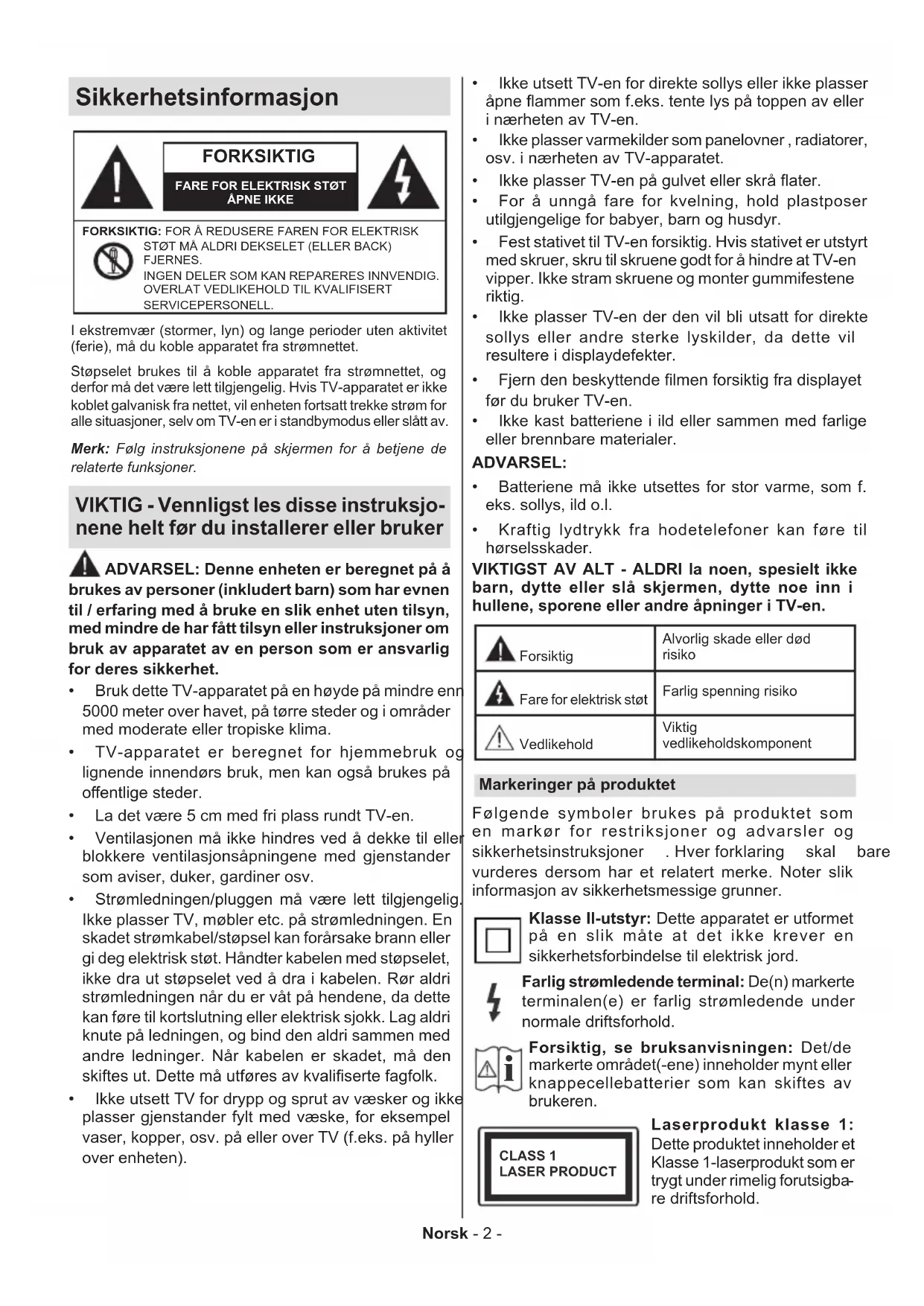 før du bruker TV-en. Ikke kast batteriene i ild eller sammen med farlige eller brennbare materialer. ADVARSEL: Batteriene må ikke utsettes for stor varme, som f. eks. sollys, ild o.l. Kraftig lydtrykk fra hodetelefoner kan føre til hørselsskader. VIKTIGST AV ALT - ALDRI la noen, spesielt ikke barn, dytte eller slå skjermen, dytte noe inn i hullene, sporene eller andre åpninger i TV-en. ForsiktigAlvorlig skade eller død risiko Fare for elektrisk støtFarlig spenning risiko VedlikeholdViktig vedlikeholdskomponent Markeringer på produktet Følgende symboler brukes på produktet som en markør for restriksjoner og advarsler og
