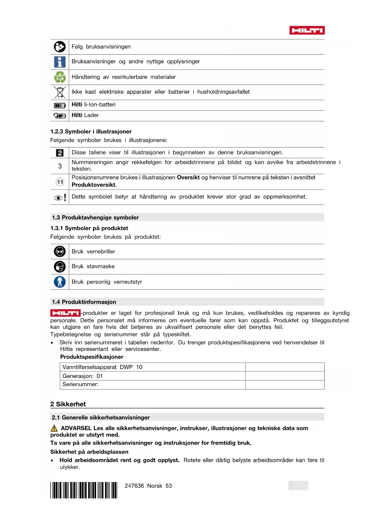 -produkter er laget for profesjonell bruk og må kun brukes, vedlikeholdes og repareres av kyndig personale. Dette personalet må informeres om eventuelle farer som kan oppstå. Produktet og tilleggsutstyret kan utgjøre en fare hvis det betjenes av ukvalifisert personale eller det benyttes feil. Typebetegnelse og serienummer står på typeskiltet. ▶ Skriv inn serienummeret i tabellen nedenfor. Du trenger produktspesifikasjonene ved henvendelser til Hiltis representant eller servicesenter. Produktspesifikasjoner Vanntilførselsapparat DWP 10 Generasjon: 01 Serienummer: 2 Sikkerhet