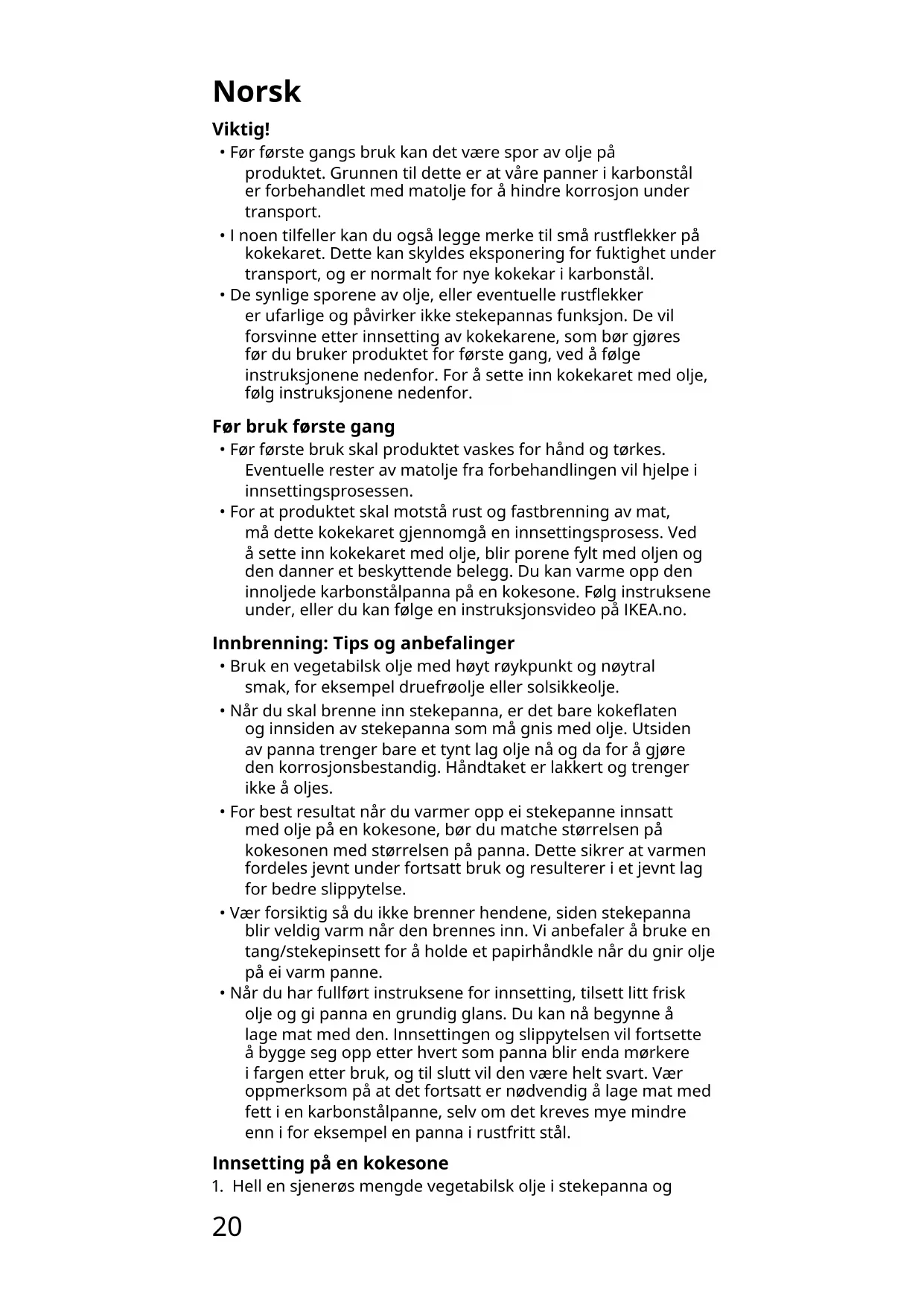 - For at produktet skal motstå rust og fastbrenning av mat, må dette kokekaret gjennomgå en innsettingsprosess. Ved å sette inn kokekaret med olje, blir porene fylt med oljen og den danner et beskyttende belegg. Du kan varme opp den innoljede karbonstålpanna på en kokesone. Følg instruksene under, eller du kan følge en instruksjonsvideo på IKEA.no. Innbrenning: Tips og anbefalinger