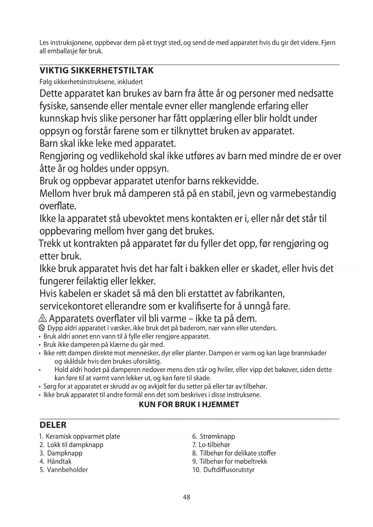 AE48 Les instruksjonene, oppbevar dem på et trygt sted, og send de med apparatet hvis du gir det videre. Fjern all emballasje før bruk. VIKTIG SIKKERHETSTILTAK Følg sikkerhetsinstruksene, inkludert Dette apparatet kan brukes av barn fra åtte år og personer med nedsatte fysiske, sansende eller mentale evner eller manglende erfaring eller kunnskap hvis slike personer har fått opplæring eller blir holdt under oppsyn og forstår farene som er tilknyttet bruken av apparatet. Barn skal ikke leke med apparatet. Rengjøring og vedlikehold skal ikke utføres av barn med mindre de er over åtte år og holdes under oppsyn. Bruk og oppbevar apparatet utenfor barns rekkevidde. Mellom hver bruk må damperen stå på en stabil, jevn og varmebestandig overate. Ikke la apparatet stå ubevoktet mens kontakten er i, eller når det står til oppbevaring mellom hver gang det brukes. Trekk ut kontrakten på apparatet før du fyller det opp, før rengjøring og etter bruk. Ikke bruk apparatet hvis det har falt i bakken eller er skadet, eller hvis det fungerer feilaktig eller lekker. Hvis kabelen er skadet så må den bli erstattet av fabrikanten, servicekontoret ellerandre som er kvaliserte for å unngå fare. h Apparatets overater vil bli varme – ikke ta på dem. b Dypp aldri apparatet i væsker, ikke bruk det på baderom, nær vann eller utendørs.