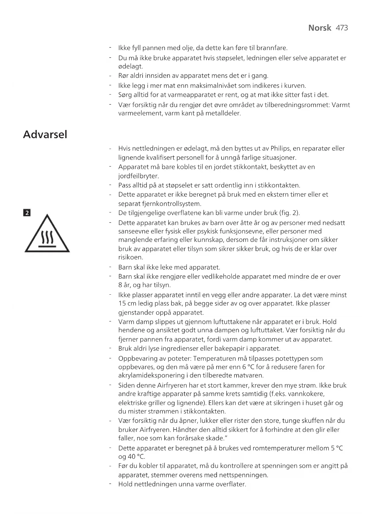 Varm damp slippes ut gjennom luftuttakene når apparatet er i bruk. Hold hendene og ansiktet godt unna dampen og luftuttaket. Vær forsiktig når du fjerner pannen fra apparatet, fordi varm damp kommer ut av apparatet.
