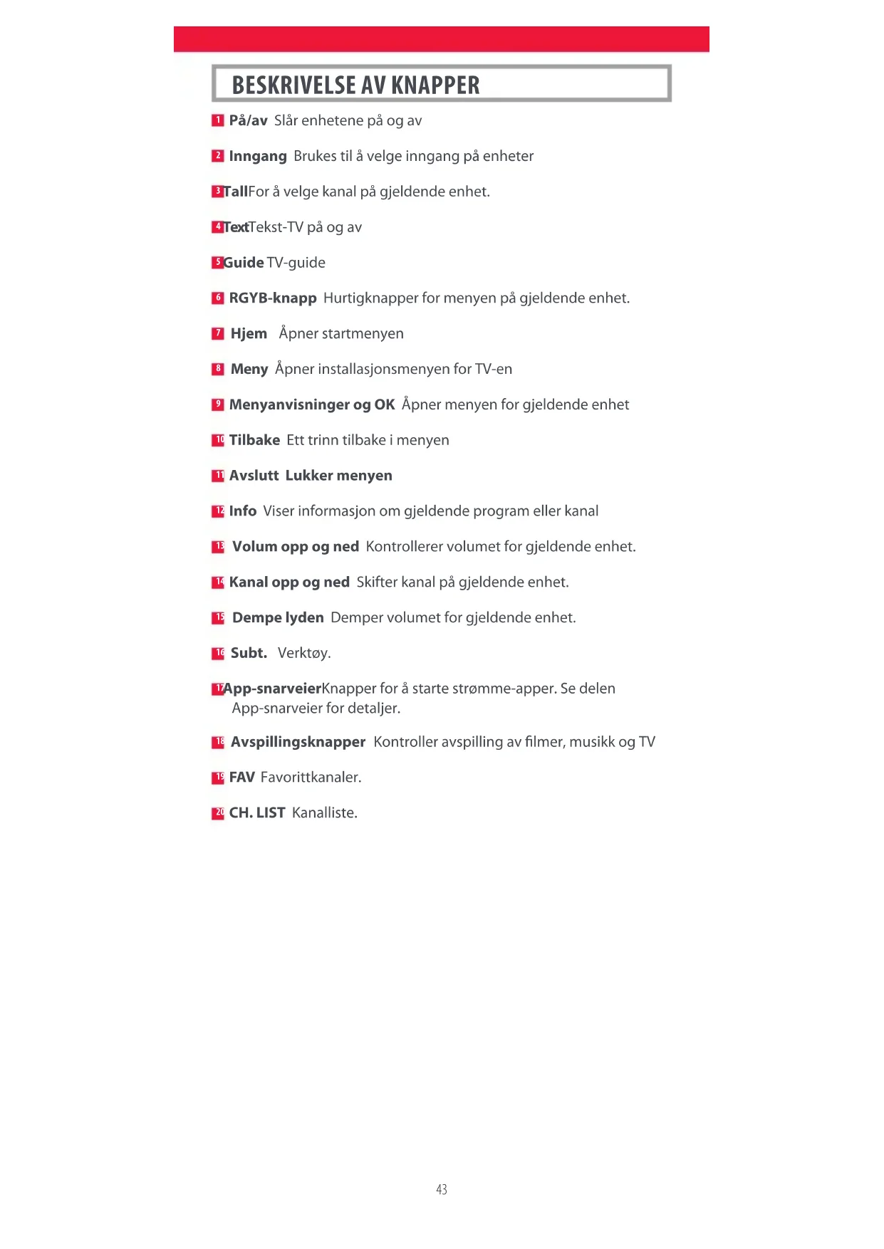 Kodene er oppført i rekkefølge etter popularitet fra topp til bunn, og det er 4 kolonner fra venstre til høyre. De fleste TV-er fungerer med en kode fra de første kodene i kolonne 1. (Kodeliste, side 107).