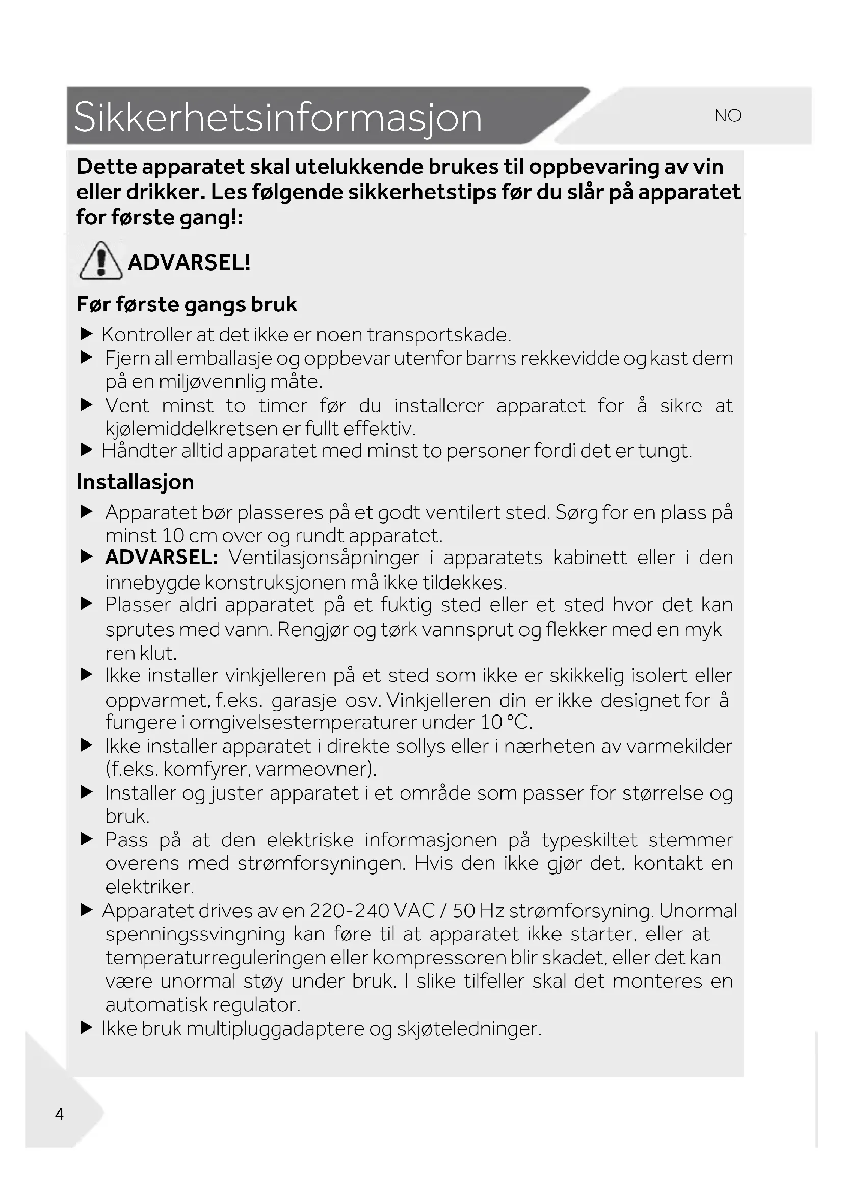 ADVARSEL! Før første gangs bruk Kontroller at det ikke er noen transportskade. Fjern all emballasje og oppbevar utenfor barns rekkevidde og kast dem på en miljøvennlig måte. Vent minst to timer før du installerer apparatet for å sikre at kjølemiddelkretsen er fullt effektiv. Håndter alltid apparatet med minst to personer fordi det er tungt. Installasjon Apparatet bør plasseres på et godt ventilert sted. Sørg for en plass på minst 10 cm over og rundt apparatet. ADVARSEL: Ventilasjonsåpninger i apparatets kabinett eller i den innebygde konstruksjonen må ikke tildekkes. Plasser aldri apparatet på et fuktig sted eller et sted hvor det kan sprutes med vann. Rengjør og tørk vannsprut og flekker med en myk ren klut. Ikke installer vinkjelleren på et sted som ikke er skikkelig isolert eller oppvarmet, f.eks. garasje osv. Vinkjelleren din er ikke designet for å fungere i omgivelsestemperaturer under 10 °C. Ikke installer apparatet i direkte sollys eller i nærheten av varmekilder (f.eks. komfyrer, varmeovner). Installer og juster apparatet i et område som passer for størrelse og bruk. Pass på at den elektriske informasjonen på typeskiltet stemmer overens med strømforsyningen. Hvis den ikke gjør det, kontakt en elektriker. Apparatet drives av en 220-240 VAC / 50 Hz strømforsyning. Unormal spenningssvingning kan føre til at apparatet ikke starter, eller at temperaturreguleringen eller kompressoren blir skadet, eller det kan være unormal støy under bruk. I slike tilfeller skal det monteres en automatisk regulator. Ikke bruk multipluggadaptere og skjøteledninger.5