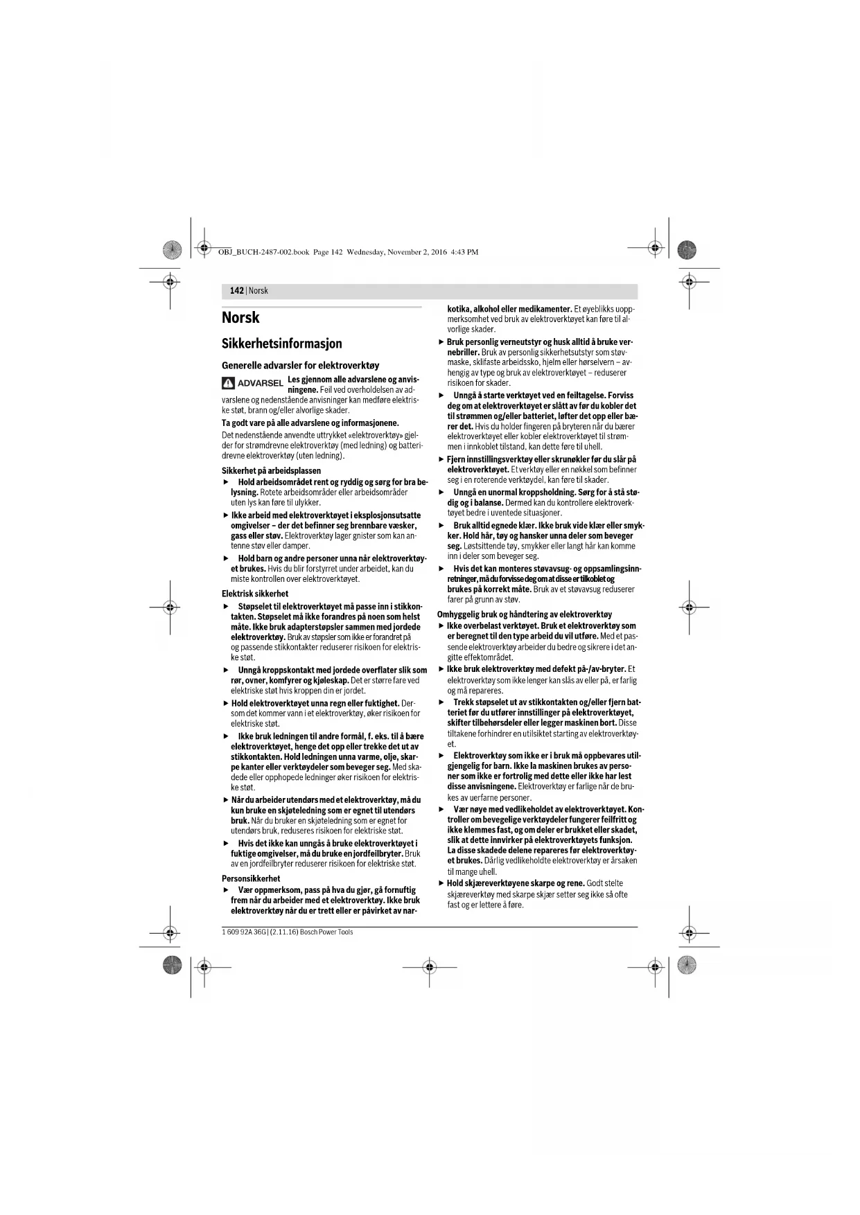 OBJ_BUCH-2487-002.book Page 149 Wednesday, November 2, 2016 4:43 PM150 | Norsk 1 609 92A 36G | (2.11.16) Bosch Power Tools Vibrasjonsnivået som er angitt i disse anvisningene, er målt iht. en målemetode som er standardisert i EN 60745 og kan brukes til sammenligning av elektroverktøy med hverandre. Det egner seg også til en foreløpig vurdering av vibrasjonsbe- lastningen. Det angitte vibrasjonsnivået representerer de hovedsakelige anvendelsene til elektroverktøyet. Men hvis elektroverktøyet brukes til andre anvendelser, med forskjellig tilbehør eller utilstrekkelig vedlikehold, kan vibrasjonsnivået avvike. Dette kan føre til en tydelig øking av vibrasjonsbelastningen over he- le arbeidstidsrommet. Til en nøyaktig vurdering av vibrasjonsbelastningen skal det også tas hensyn til de tidene maskinen er slått av eller går, men ikke virkelig brukes. Dette kan tydelig redusere vibra- sjonsbelastningen over hele arbeidstidsrommet. Bestem ekstra sikkerhetstiltak til beskyttelse av brukeren mot vibrasjonenes virkning, som for eksempel: Vedlikehold av elektroverktøy og innsatsverktøy, holde hendene varme, or- ganisere arbeidsforløpene. Samsvarserklæring Vi erklærer under eneansvar at produktet som er beskrevet under «Tekniske data» er i overensstemmelse med alle rele- vante bestemmelser i direktivene 2011/65/EU, 2014/30/EU, 2006/42/EC inkludert endringer, og følgende standarder: EN 60745-1, EN 60745-2-3, EN 50581. Tekniske data (2006/42/EC) hos: Robert Bosch Power Tools GmbH, PT/ECS, 70538 Stuttgart, GERMANY Robert Bosch Power Tools GmbH 70538 Stuttgart, GERMANY Stuttgart, 01.01.2017 Montering Montering av beskyttelsesinnretninger Generelle informasjoner Avbryt energitilførselen før du utfører innstillinger på verktøyet, skifter tilbehørsdeler eller legger bort elek- troverktøyet. Disse tiltakene forhindrer en utilsiktet star- ting av elektroverktøyet. Totale svingningsverdier a