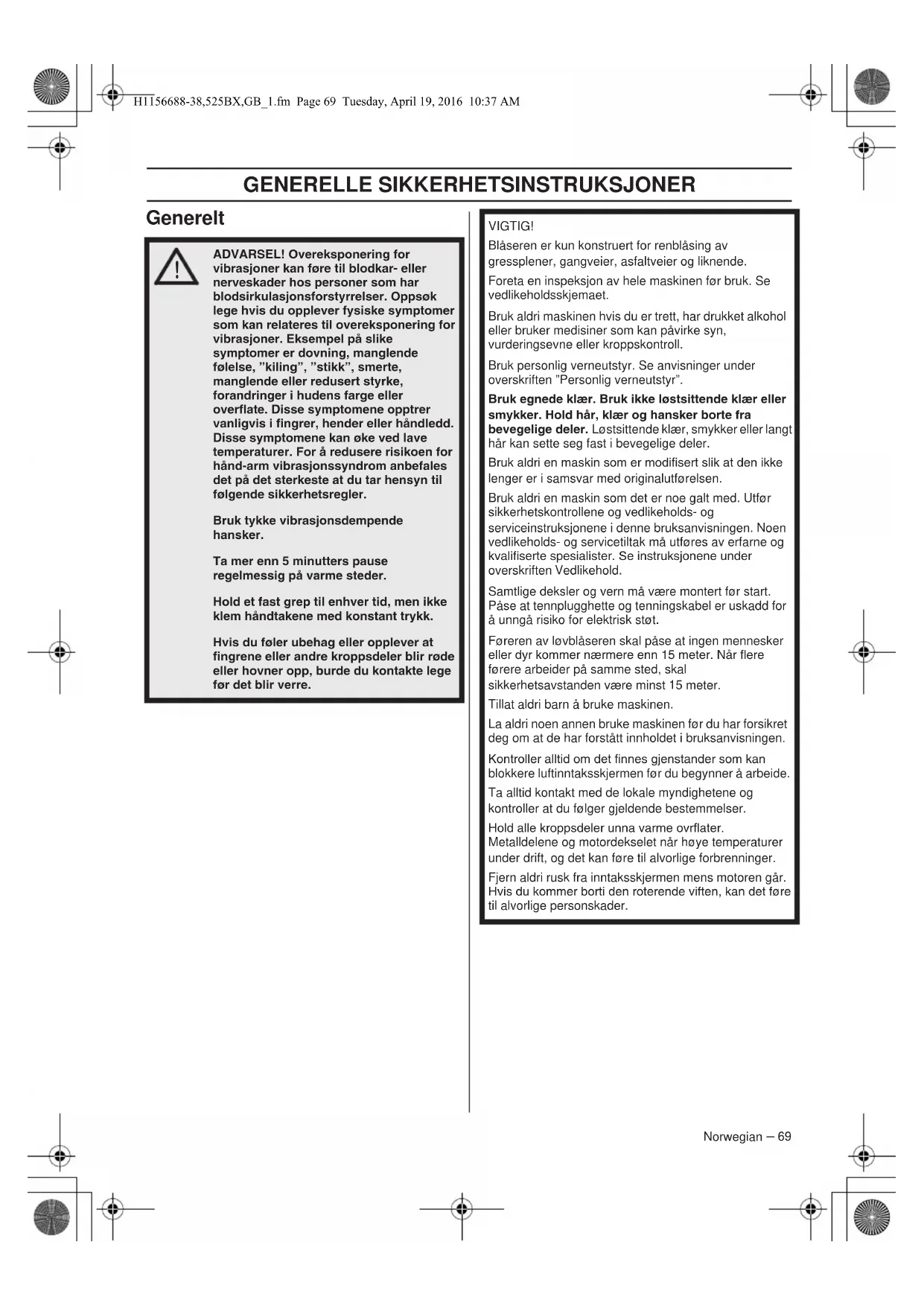ADVARSEL! Overeksponering for vibrasjoner kan føre til blodkar- eller nerveskader hos personer som har blodsirkulasjonsforstyrrelser. Oppsøk lege hvis du opplever fysiske symptomer som kan relateres til overeksponering for vibrasjoner. Eksempel på slike symptomer er dovning, manglende følelse, ”kiling”, ”stikk”, smerte, manglende eller redusert styrke, forandringer i hudens farge eller overate. Disse symptomene opptrer vanligvis i ngrer, hender eller håndledd. Risikoen kan øke ved lave temperaturer. H1156688-38,525BX,GB_1.fm Page 72 Tuesday, April 19, 2016 10:37 AMSIKKERHETSINSTRUKSJONER Norwegian – 73 NOTE! Pass på at gnistfangeren skrus riktig på plass. Luftlter Bruk aldri løvblåseren uten luftlter eller med skadet eller deformert lter. Ultrert, støvholdig luft kan raskt ødelegge motoren.