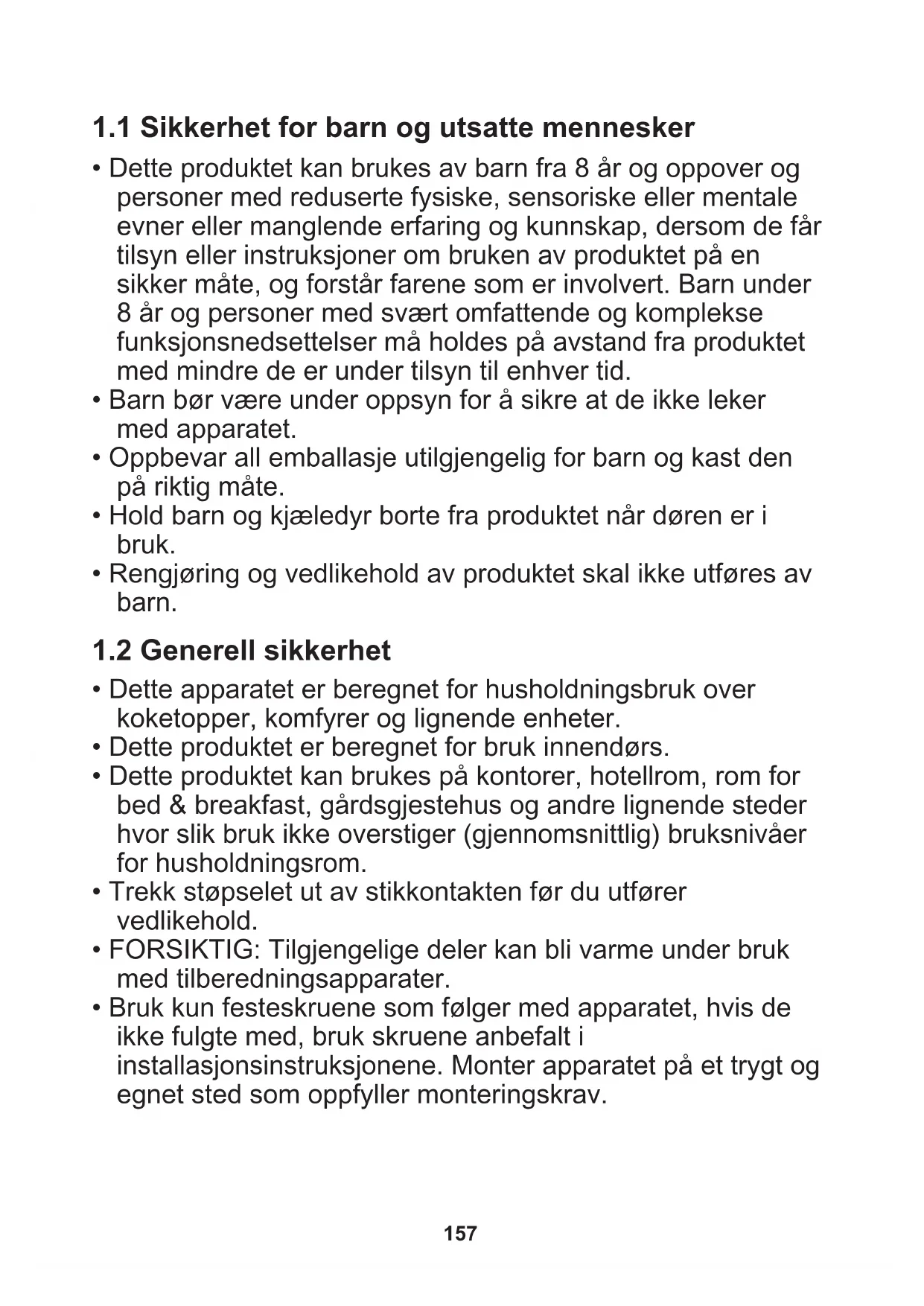 Les medfølgende instruksjoner grundig før du installerer og bruker apparatet. Produsenten er ikke ansvarlig for personskader eller andre skader som følge av feilaktig montering eller bruk. Hold alltid instruksjonene på et trygt og tilgjengelig sted for fremtidig referanse. 1561.1 Sikkerhet for barn og utsatte mennesker