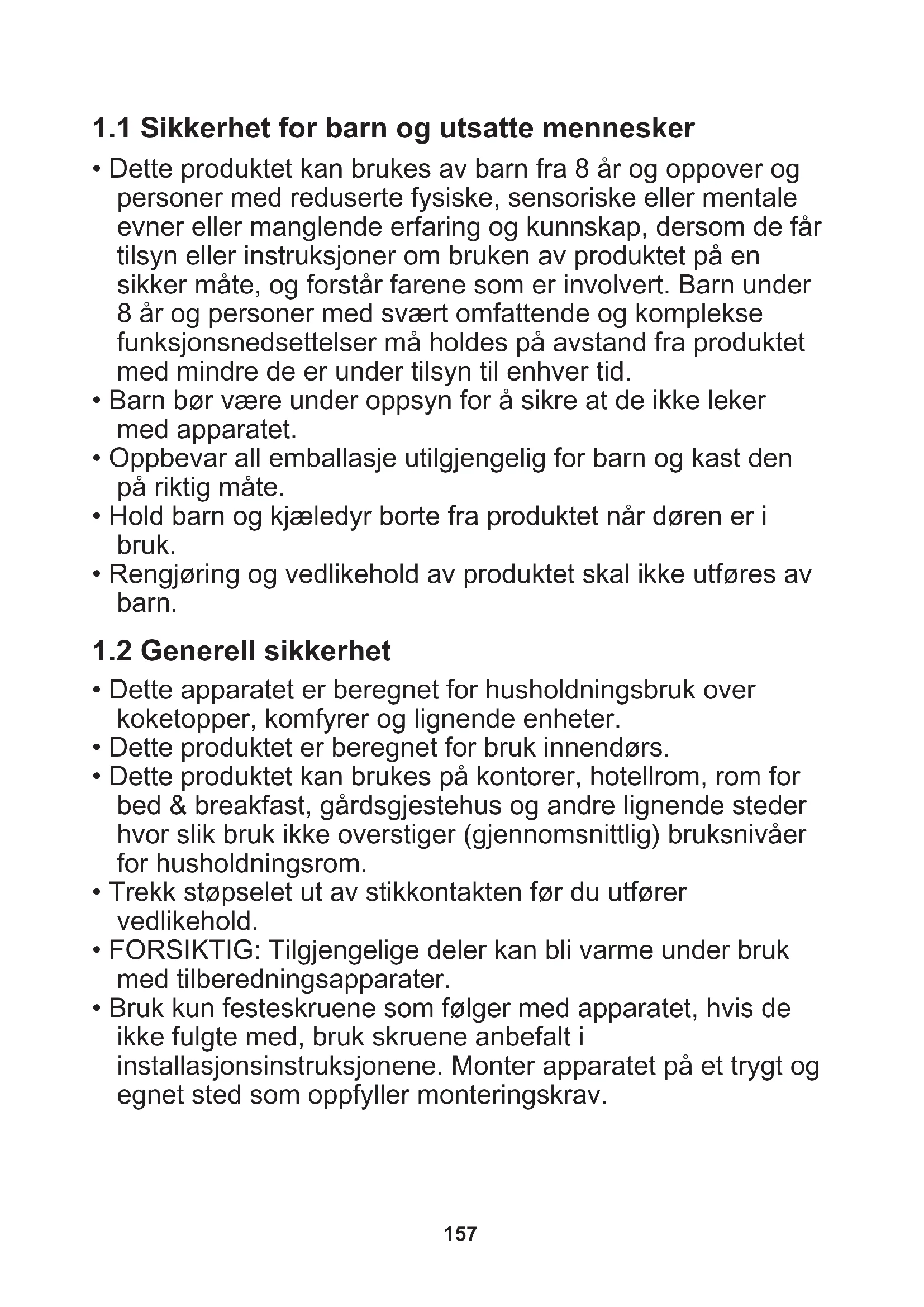 - Dette produit kanBrukes av barn fra 8 ar og oppover og personer med reduserte fysiske, sensoriske erler mentale evner ellmanglende erfaring og kunnskap,dersom de farr tilsyn eller instruksjoner ombruken av produit pa en sikker mate,og forstar farene som er involvert.Barn under 8 ar og personer med svert omfattende og komplekse funksjonsnedsettelser ma holds pa avstand fra produit med mindede er under tilsyn til enhver tid.