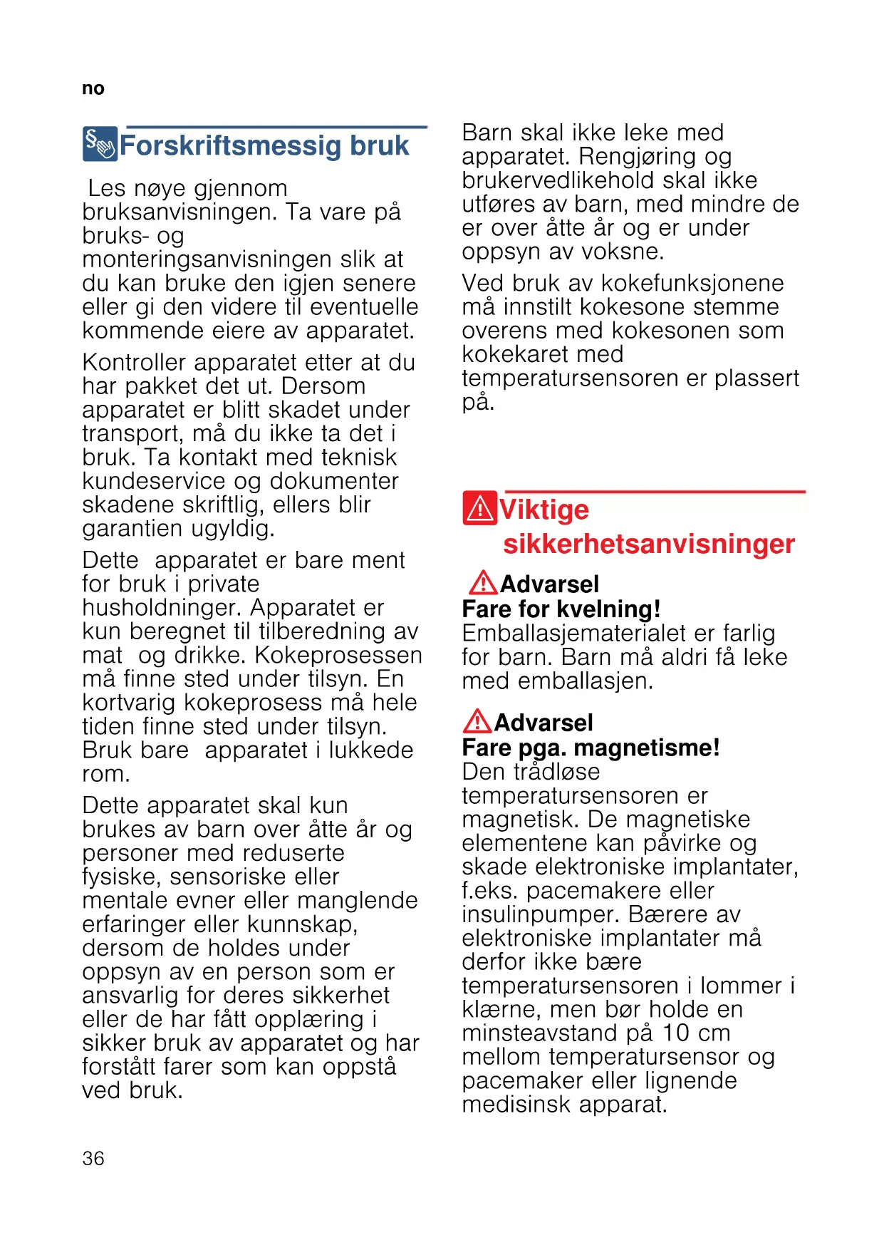 8 Forskriftsmessig bruk For s k r i f t s mes s i g br uk Les nøye gjennom bruksanvisningen. Ta vare på bruks- og monteringsanvisningen slik at du kan bruke den igjen senere eller gi den videre til eventuelle kommende eiere av apparatet. Kontroller apparatet etter at du har pakket det ut. Dersom apparatet er blitt skadet under transport, må du ikke ta det i bruk. Ta kontakt med teknisk kundeservice og dokumenter skadene skriftlig, ellers blir garantien ugyldig. Dette apparatet er bare ment for bruk i private husholdninger. Apparatet er kun beregnet til tilberedning av mat og drikke. Kokeprosessen må finne sted under tilsyn. En kortvarig kokeprosess må hele tiden finne sted under tilsyn. Bruk bare apparatet i lukkede rom. Dette apparatet skal kun brukes av barn over åtte år og personer med reduserte fysiske, sensoriske eller mentale evner eller manglende erfaringer eller kunnskap, dersom de holdes under oppsyn av en person som er ansvarlig for deres sikkerhet eller de har fått opplæring i sikker bruk av apparatet og har forstått farer som kan oppstå ved bruk. Barn skal ikke leke med apparatet. Rengjøring og brukervedlikehold skal ikke utføres av barn, med mindre de er over åtte år og er under oppsyn av voksne. Ved bruk av kokefunksjonene må innstilt kokesone stemme overens med kokesonen som kokekaret med temperatursensoren er plassert på. ( Viktige sikkerhetsanvisninger Vi k t i ge s i kker het sanv i sni nger :Advarsel Fare for kvelning! Emballasjematerialet er farlig for barn. Barn må aldri få leke med emballasjen. :Advarsel Fare pga. magnetisme! Den trådløse temperatursensoren er magnetisk. De magnetiske elementene kan påvirke og skade elektroniske implantater, f.eks. pacemakere eller insulinpumper. Bærere av elektroniske implantater må derfor ikke bære temperatursensoren i lommer i klærne, men bør holde en minsteavstand på 10 cm mellom temperatursensor og pacemaker eller lignende medisinsk apparat.no