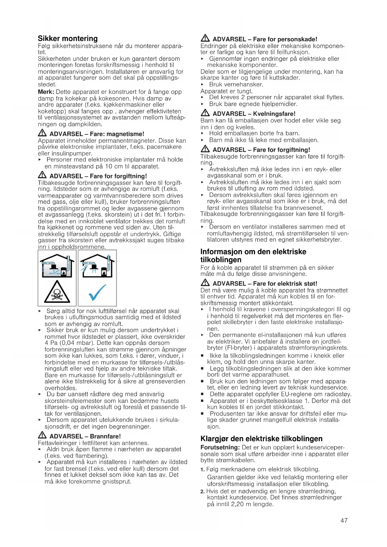 Generell informasjon ¡ Les nøye gjennom denne anvisningen. ¡ Apparatet skal kun installeres av autori- serte fagfolk. ¡ Slå alltid av strømtilførselen før det skal gjennomføres arbeider. ¡ Dette apparatet må aldri brukes i båter el- ler kjøretøy. ¡ Følg anbefalingene fra produsenten av benkeplaten.47 Sikker montering Følg sikkerhetsinstruksene når du monterer appara- tet. Sikkerheten under bruken er kun garantert dersom monteringen foretas forskriftsmessig i henhold til monteringsanvisningen. Installatøren er ansvarlig for at apparatet fungerer som det skal på oppstillings- stedet. Merk:Dette apparatet er konstruert for å fange opp damp fra kokekar på kokesonen. Hvis damp av andre apparater (f.eks. kjøkkenmaskiner eller koketopp) skal fanges opp , avhenger effektiviteten til ventilasjonssystemet av avstanden mellom lufteåp- ningen og dampkilden. ADVARSEL‒Fare: magnetisme! Apparatet inneholder permanentmagneter. Disse kan påvirke elektroniske implantater, f.eks. pacemakere eller insulinpumper. ▶ Personer med elektroniske implantater må holde en minsteavstand på 10cm til apparatet. ADVARSEL‒Fare for forgiftning! Tilbakesugde forbrenningsgasser kan føre til forgift- ning. Ildsteder som er avhengige av romluft (f.eks. varmeapparater og varmtvannsberedere som drives med gass, olje eller kull), bruker forbrenningsluften fra oppstillingsrommet og leder avgassene gjennom et avgassanlegg (f.eks. skorstein) ut i det fri. I forbin- delse med en innkoblet ventilator trekkes det romluft fra kjøkkenet og rommene ved siden av. Uten til- strekkelig tilførselsluft oppstår et undertrykk. Giftige gasser fra skorstein eller avtrekkssjakt suges tilbake inn i oppholdsrommene. ▶ Sørg alltid for nok lufttilførsel når apparatet skal brukes i utluftingsmodus samtidig med et ildsted som er avhengig av romluft. ▶ Sikker bruk er kun mulig dersom undertrykket i rommet hvor ildstedet er plassert, ikke overskrider 4Pa (0,04mbar). Dette kan oppnås dersom forbrenningsluften kan strømme gjennom åpninger som ikke kan lukkes, som f.eks. i dører, vinduer, i forbindelse med en murkasse for tilførsels-/utblås- ningsluft eller ved hjelp av andre tekniske tiltak. Bare en murkasse for tilførsels-/utblåsningsluft er alene ikke tilstrekkelig for å sikre at grenseverdien overholdes. ▶ Du bør uansett rådføre deg med ansvarlig skorsteinsfeiemester som kan bedømme husets tilførsels- og avtrekksluft og foreslå et passende til- tak for ventilasjonen. ▶ Dersom apparatet utelukkende brukes i sirkula- sjonsdrift, er det ingen begrensninger. ADVARSEL‒Brannfare! Fettavleiringer i fettfilteret kan antennes. ▶ Aldri bruk åpen flamme i nærheten av apparatet (f.eks. ved flambering). ▶ Apparatet må kun installeres i nærheten av ildsted for fast brensel (f.eks. ved eller kull) dersom det finnes et lukket deksel som ikke kan tas av. Det må ikke forekomme gnistsprut. ADVARSEL‒Fare for personskade! Endringer på elektriske eller mekaniske komponen- ter er farlige og kan føre til feilfunksjon. ▶ Gjennomfør ingen endringer på elektriske eller mekaniske komponenter. Deler som er tilgjengelige under montering, kan ha skarpe kanter og føre til kuttskader. ▶ Bruk vernehansker. Apparatet er tungt. ▶ Det kreves 2 personer når apparatet skal flyttes. ▶ Bruk bare egnede hjelpemidler. ADVARSEL‒Kvelningsfare! Barn kan få emballasjen over hodet eller vikle seg inn i den og kveles. ▶ Hold emballasjen borte fra barn. ▶ Barn må ikke få leke med emballasjen. ADVARSEL‒Fare for forgiftning! Tilbakesugde forbrenningsgasser kan føre til forgift- ning. ▶ Avtrekksluften må ikke ledes inn i en røyk- eller avgasskanal som er i bruk. ▶ Avtrekksluften må ikke ledes inn i en sjakt som brukes til utlufting av rom med ildsted. ▶ Dersom avtrekksluften skal føres igjennom en røyk- eller avgasskanal som ikke er i bruk, må det først innhentes tillatelse fra brannvesenet. Tilbakesugde forbrenningsgasser kan føre til forgift- ning. ▶ Dersom en ventilator installeres sammen med et romluftavhengig ildsted, må strømtilførselen til ven- tilatoren utstyres med en egnet sikkerhetsbryter. Informasjon om den elektriske tilkoblingen For å koble apparatet til strømmen på en sikker måte må du følge disse anvisningene. ADVARSEL‒Fare for elektrisk støt! Det må være mulig å koble apparatet fra strømnettet til enhver tid. Apparatet må kun kobles til en for- skriftsmessig montert stikkontakt. ▶ I henhold til kravene i overspenningskategori III og i henhold til regelverket må det monteres en fler- polet skillebryter i den faste elektriske installasjo- nen. ▶ Den permanente el-installasjonen må kun utføres av elektriker. Vi anbefaler å installere en jordfeil- bryter (FI-bryter) i apparatets strømforsyningskrets. ¡ Ikke la tilkoblingsledningen komme i knekk eller klem, og hold den unna skarpe kanter. ¡ Legg tilkoblingsledningen slik at den ikke kommer borti det varme apparathuset. ¡ Bruk kun den ledningen som følger med appara- tet, eller en ledning levert av teknisk kundeservice. ¡ Dette apparatet oppfyller EU-reglene om radiostøy. ¡ Apparatet er i beskyttelsesklasse 1. Derfor må det kun kobles til en jordet stikkontakt. ¡ Produsenten tar ikke ansvar for driftsfeil eller mu- lige skader grunnet mangelfull elektrisk installa- sjon. Klargjør den elektriske tilkoblingen Forutsetning:Det er kun opplært kundeserviceper- sonale som skal utføre arbeider inne i apparatet eller bytte strømkabelen.