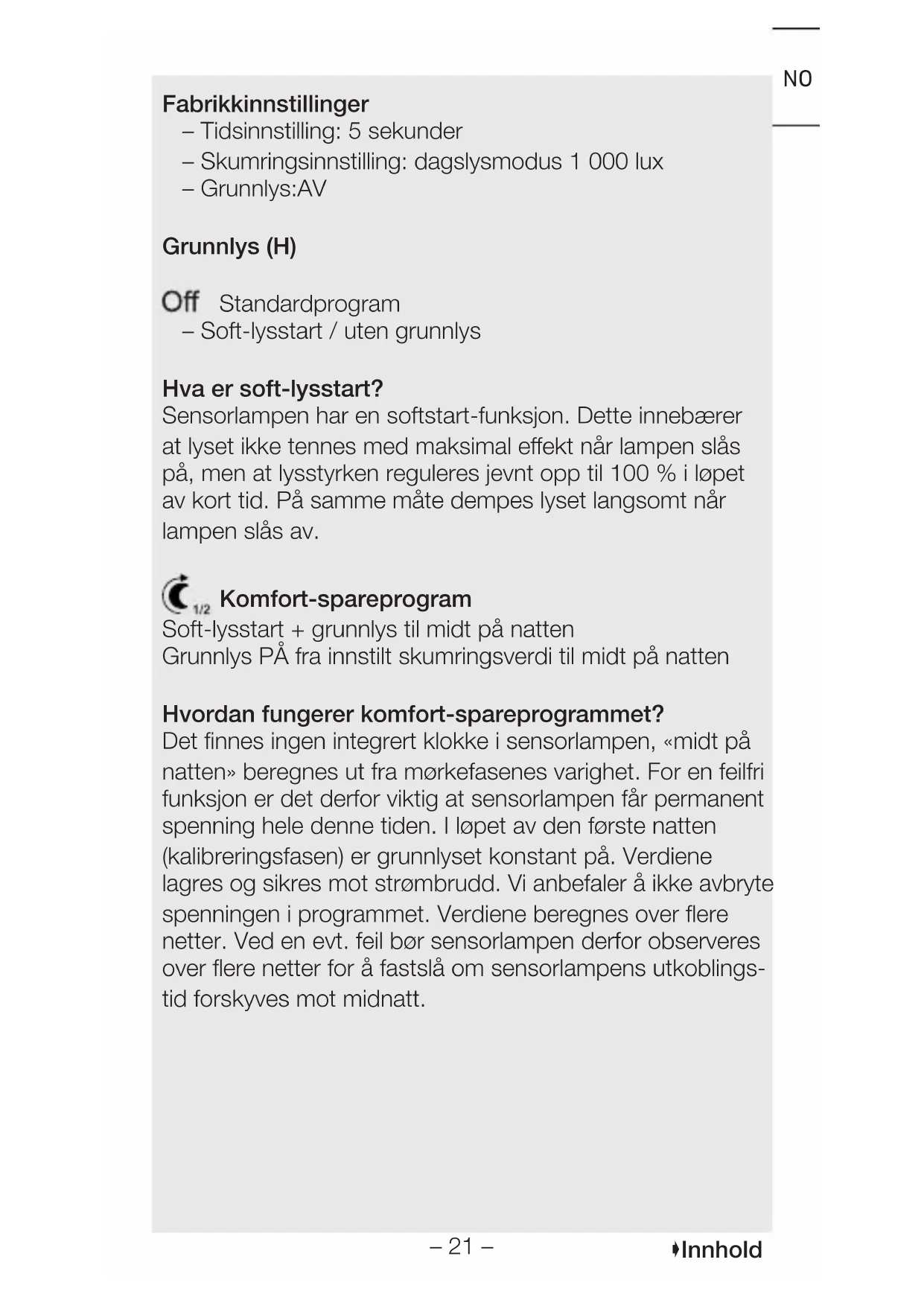 - Still inn.– 21 – Innhold NONO Fabrikkinnstillinger – Tidsinnstilling: 5sekunder – Skumringsinnstilling: dagslysmodus 1 000lux – Grunnlys: AV Grunnlys (H) Standardprogram – Soft-lysstart / uten grunnlys Hva er soft-lysstart? Sensorlampen har en softstart-funksjon. Dette innebærer at lyset ikke tennes med maksimal eekt når lampen slås på, men at lysstyrken reguleres jevnt opp til 100 % i løpet av kort tid. På samme måte dempes lyset langsomt når lampen slås av. Komfort-spareprogram Soft-lysstart + grunnlys til midt på natten Grunnlys PÅ fra innstilt skumringsverdi til midt på natten Hvordan fungerer komfort-spareprogrammet? Det finnes ingen integrert klokke i sensorlampen, «midt på natten» beregnes ut fra mørkefasenes varighet. For en feilfri funksjon er det derfor viktig at sensorlampen får permanent spenning hele denne tiden. I løpet av den første natten (kalibreringsfasen) er grunnlyset konstant på. Verdiene lagres og sikres mot strømbrudd. Vi anbefaler å ikke avbryte spenningen i programmet. Verdiene beregnes over flere netter. Ved en evt. feil bør sensorlampen derfor observeres over flere netter for å fastslå om sensorlampens utkoblings- tid forskyves mot midnatt.– 22 – Innhold