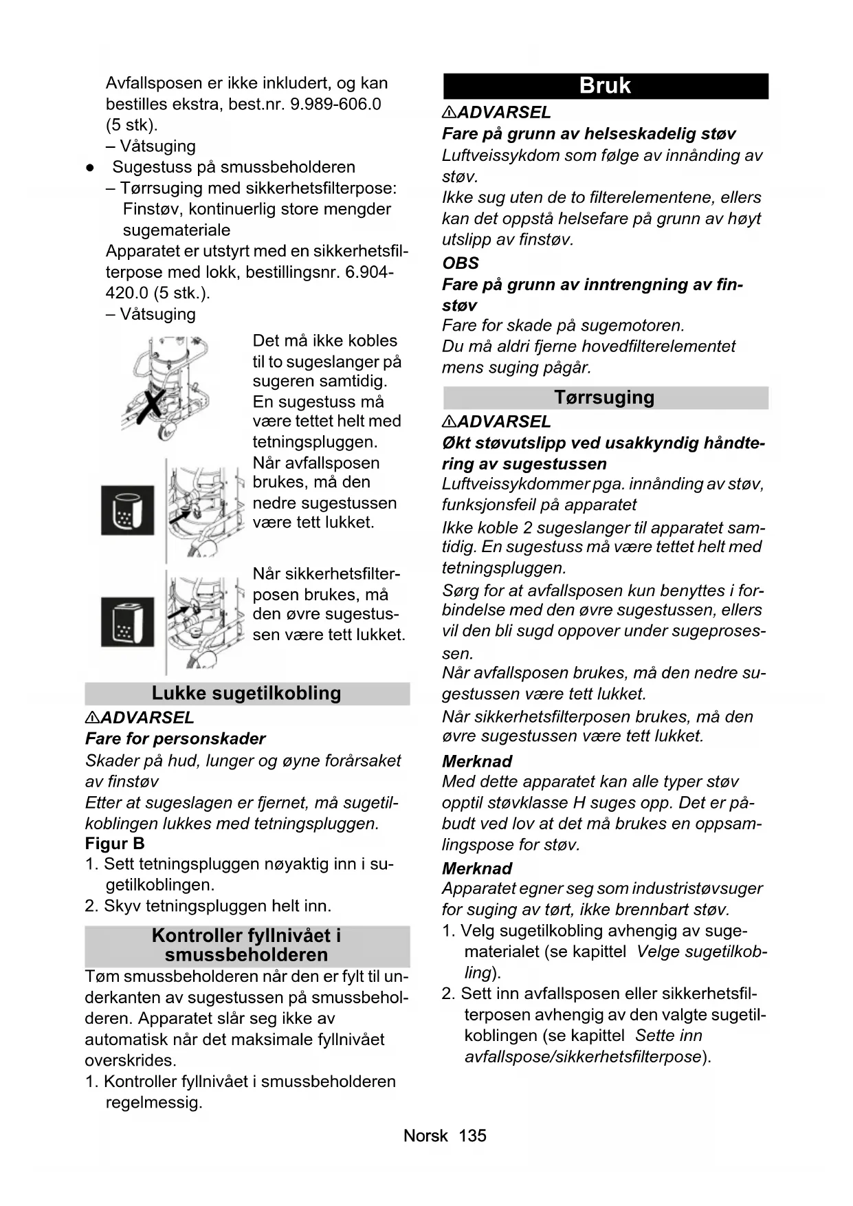 regelmessig. Bruk 몇 ADVARSEL Fare på grunn av helseskadelig støv Luftveissykdom som følge av innånding av støv. Ikke sug uten de to filterelementene, ellers kan det oppstå helsefare på grunn av høyt utslipp av finstøv. OBS Fare på grunn av inntrengning av fin- støv Fare for skade på sugemotoren. Du må aldri fjerne hovedfilterelementet mens suging pågår. Tørrsuging 몇 ADVARSEL Økt støvutslipp ved usakkyndig håndte- ring av sugestussen Luftveissykdommer pga. innånding av støv, funksjonsfeil på apparatet Ikke koble 2 sugeslanger til apparatet sam- tidig. En sugestuss må være tettet helt med tetningspluggen. Sørg for at avfallsposen kun benyttes i for- bindelse med den øvre sugestussen, ellers vil den bli sugd oppover under sugeproses- sen. Når avfallsposen brukes, må den nedre su- gestussen være tett lukket. Når sikkerhetsfilterposen brukes, må den øvre sugestussen være tett lukket. Merknad Med dette apparatet kan alle typer støv opptil støvklasse H suges opp. Det er på- budt ved lov at det må brukes en oppsam- lingspose for støv. Merknad Apparatet egner seg som industristøvsuger for suging av tørt, ikke brennbart støv.