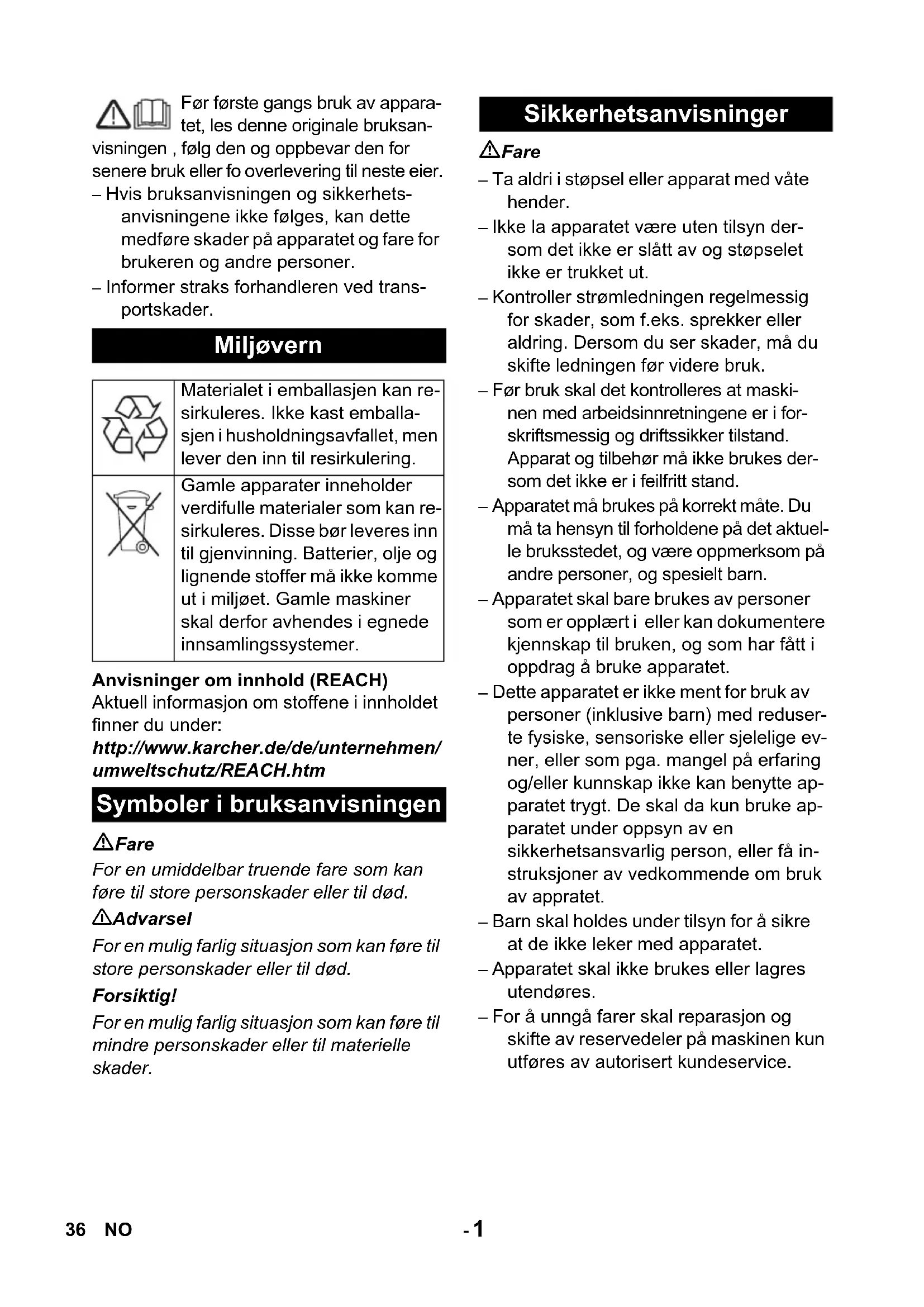 CEO Head of Approbation 35DA- 1 Før første gangs bruk av appara- tet, les denne originale bruksan- visningen , følg den og oppbevar den for senere bruk eller fo overlevering til neste eier. – Hvis bruksanvisningen og sikkerhets- anvisningene ikke følges, kan dette medføre skader på apparatet og fare for brukeren og andre personer. – Informer straks forhandleren ved trans- portskader. Anvisninger om innhold (REACH) Aktuell informasjon om stoffene i innholdet finner du under: http://www.karcher.de/de/unternehmen/ umweltschutz/REACH.htm Fare For en umiddelbar truende fare som kan føre til store personskader eller til død. 몇 Advarsel For en mulig farlig situasjon som kan føre til store personskader eller til død. Forsiktig! For en mulig farlig situasjon som kan føre til mindre personskader eller til materielle skader. Fare – Ta aldri i støpsel eller apparat med våte hender. – Ikke la apparatet være uten tilsyn der- som det ikke er slått av og støpselet ikke er trukket ut. – Kontroller strømledningen regelmessig for skader, som f.eks. sprekker eller aldring. Dersom du ser skader, må du skifte ledningen før videre bruk. – Før bruk skal det kontrolleres at maski- nen med arbeidsinnretningene er i for- skriftsmessig og driftssikker tilstand. Apparat og tilbehør må ikke brukes der- som det ikke er i feilfritt stand. – Apparatet må brukes på korrekt måte. Du må ta hensyn til forholdene på det aktuel- le bruksstedet, og være oppmerksom på andre personer, og spesielt barn. – Apparatet skal bare brukes av personer som er opplært i eller kan dokumentere kjennskap til bruken, og som har fått i oppdrag å bruke apparatet. – Dette apparatet er ikke ment for bruk av personer (inklusive barn) med reduser- te fysiske, sensoriske eller sjelelige ev- ner, eller som pga. mangel på erfaring og/eller kunnskap ikke kan benytte ap- paratet trygt. De skal da kun bruke ap- paratet under oppsyn av en sikkerhetsansvarlig person, eller få in- struksjoner av vedkommende om bruk av appratet. – Barn skal holdes under tilsyn for å sikre at de ikke leker med apparatet. – Apparatet skal ikke brukes eller lagres utendøres. – For å unngå farer skal reparasjon og skifte av reservedeler på maskinen kun utføres av autorisert kundeservice. Miljøvern Materialet i emballasjen kan re- sirkuleres. Ikke kast emballa- sjen i husholdningsavfallet, men lever den inn til resirkulering. Gamle apparater inneholder verdifulle materialer som kan re- sirkuleres. Disse bør leveres inn til gjenvinning. Batterier, olje og lignende stoffer må ikke komme ut i miljøet. Gamle maskiner skal derfor avhendes i egnede innsamlingssystemer. Symboler i bruksanvisningen Sikkerhetsanvisninger 36 NO- 2– Denne viften er ment for tørking av våtrengjorte tepper/teppegulv.– Dette apparatet er utelukkende medt for kommersiell bruk.All bruk ut over dette anses som ikke i tråd med hensikten med apparatet. Produsen-ten fraskriver seg ansvar for skader som skyldes slik bruk - denne risikoen hviler på brukeren alene.1 Transportgrep2 Feste transporthåndtak3 Nettledning4 Transporthjul5 Klemdel med kryssporgrep6Vifte7 Håndtak8 ApparatbryterÎ Montere transporthåndtak.Merk:Ved oppsett av maskinen, pass på at viftegitteret holdes fritt.Î Åpne dører og vinduer så langt som mulig for å forbedre ventilasjonen.Î Sett apparatet på teppet som skal tørkes.Î Løft teppet.Î Skyv teppet under klemdelen på appa-ratet så langt som mulig og fest det ved å vri på stjernegrepene.Î Sett i støpselet.Î Slå apparatet på.Î Slå av maskinen. Î Trekk ut nettstøpselet. Forskriftsmessig bruk Maskinorganer