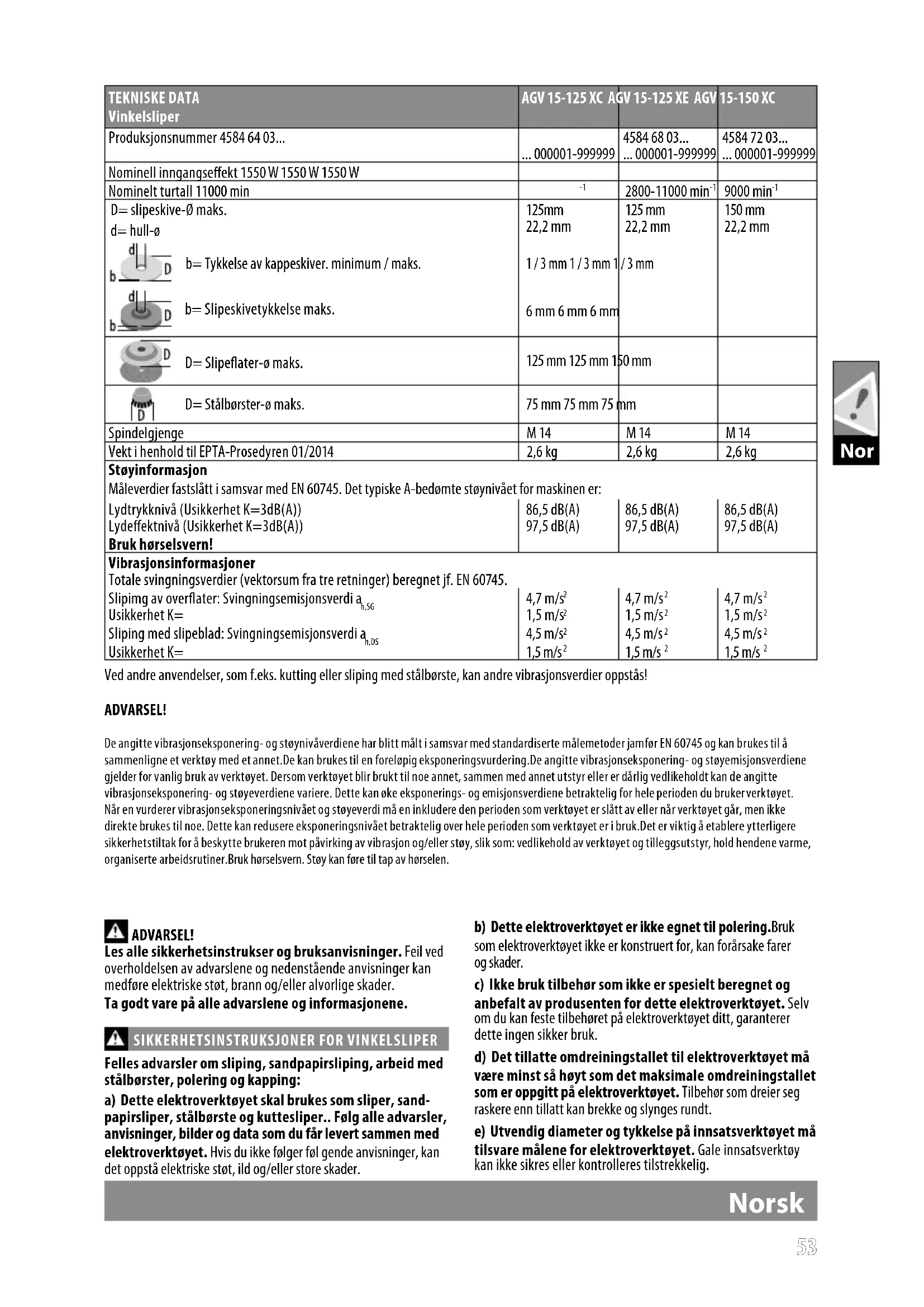 Felles advarsler om sliping, sandpapirsliping, arbeid med stålbørster, polering og kapping: a) Dette elektroverktøyet skal brukes som sliper, sand- papirsliper, stålbørste og kuttesliper.. Følg alle advarsler, anvisninger, bilder og data som du får levert sammen med elektroverktøyet. Hvis du ikke følger føl gende anvisninger, kan det oppstå elektriske støt, ild og/eller store skader. b) Dette elektroverktøyet er ikke egnet til polering.Bruk som elektroverktøyet ikke er konstruert for, kan forårsake farer og skader. c) Ikke bruk tilbehør som ikke er spesielt beregnet og anbefalt av produsenten for dette elektroverktøyet. Selv om du kan feste tilbehøret på elektroverktøyet ditt, garanterer dette ingen sikker bruk. d) Det tillatte omdreiningstallet til elektroverktøyet må være minst så høyt som det maksimale omdreiningstallet som er oppgitt på elektroverktøyet. Tilbehør som dreier seg raskere enn tillatt kan brekke og slynges rundt. e) Utvendig diameter og tykkelse på innsatsverktøyet må tilsvare målene for elektroverktøyet. Gale innsatsverktøy kan ikke sikres eller kontrolleres tilstrekkelig. TEKNISKE DATA Vinkelsliper AGV 15-125 XC AGV 15-125 XE AGV 15-150 XC Produksjonsnummer 4584 64 03... ... 000001-999999