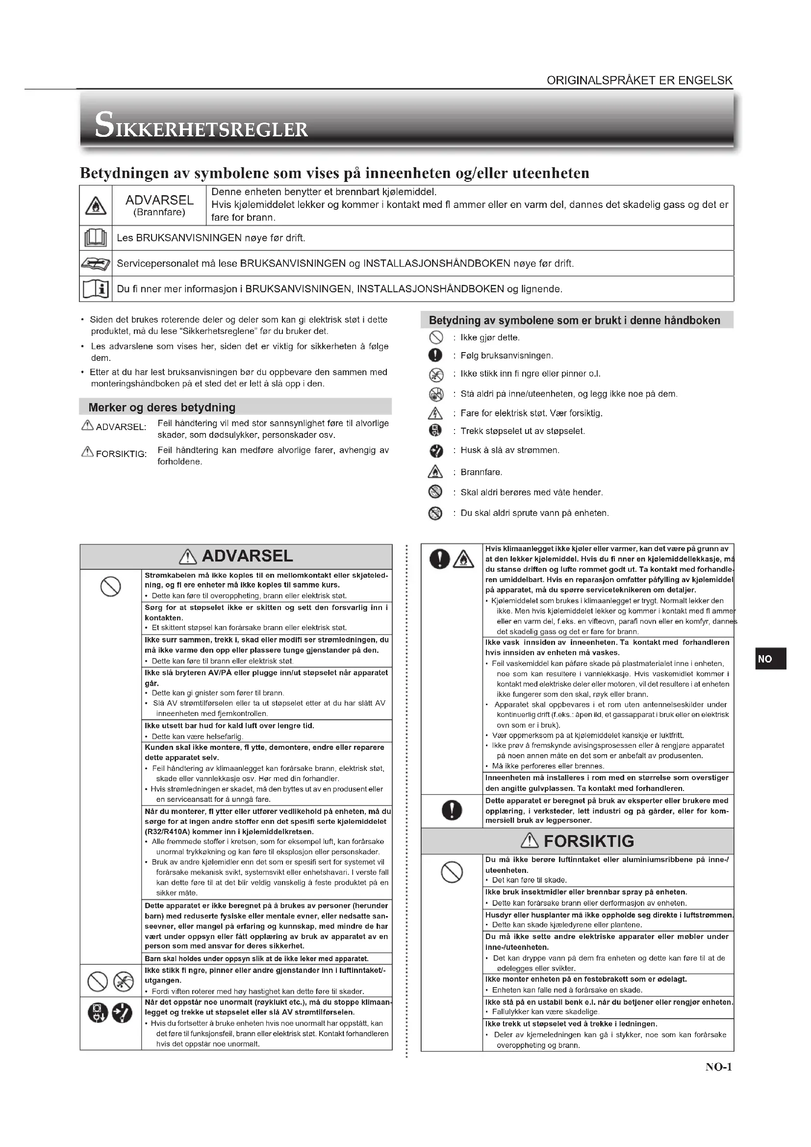 - Etter at du har lest bruksanvisningen bør du oppbevare den sammen med monteringshåndboken på et sted det er lett å slå opp i den. Merker og deres betydning ADVARSEL:Feil håndtering vil med stor sannsynlighet føre til alvorlige skader, som dødsulykker, personskader osv. FORSIKTIG:Feil håndtering kan medføre alvorlige farer, avhengig av forholdene. Betydning av symbolene som er brukt i denne håndboken : Ikke gjør dette. : Følg bruksanvisningen. : Ikke stikk inn fi ngre eller pinner o.l. : Stå aldri på inne/uteenheten, og legg ikke noe på dem. : Fare for elektrisk støt. Vær forsiktig. : Trekk støpselet ut av støpselet. : Husk å slå av strømmen. : Brannfare. : Skal aldri berøres med våte hender. : Du skal aldri sprute vann på enheten. SIKKERHETSREGLER Betydningen av symbolene som vises på inneenheten og/eller uteenheten ADVARSEL (Brannfare)Denne enheten benytter et brennbart kjølemiddel.Hvis kjølemiddelet lekker og kommer i kontakt med fl ammer eller en varm del, dannes det skadelig gass og det er fare for brann.Les BRUKSANVISNINGEN nøye før drift.Servicepersonalet må lese BRUKSANVISNINGEN og INSTALLASJONSHÅNDBOKEN nøye før drift.Du fi nner mer informasjon i BRUKSANVISNINGEN, INSTALLASJONSHÅNDBOKEN og lignende. ADVARSEL Strømkabelen må ikke koples til en mellomkontakt eller skjøteled-ning, og fl ere enheter må ikke koples til samme kurs.• Dette kan føre til overoppheting, brann eller elektrisk støt.Sørg for at støpselet ikke er skitten og sett den forsvarlig inn i kontakten.• Et skittent støpsel kan forårsake brann eller elektrisk støt.Ikke surr sammen, trekk i, skad eller modifi ser strømledningen, du må ikke varme den opp eller plassere tunge gjenstander på den. • Dette kan føre til brann eller elektrisk støt.Ikke slå bryteren AV/PÅ eller plugge inn/ut støpselet når apparatet går.