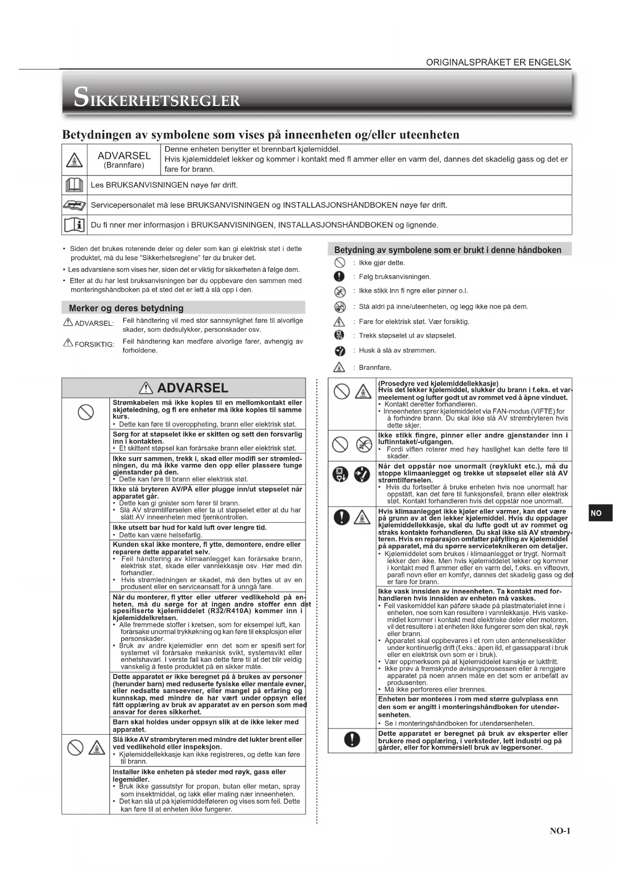 ADVARSEL Strømkabelen må ikke koples til en mellomkontakt eller skjøteledning, og fl ere enheter må ikke koples til samme kurs.• Dette kan føre til overoppheting, brann eller elektrisk støt.Sørg for at støpselet ikke er skitten og sett den forsvarlig inn i kontakten.• Et skittent støpsel kan forårsake brann eller elektrisk støt.Ikke surr sammen, trekk i, skad eller modifi ser strømled-ningen, du må ikke varme den opp eller plassere tunge gjenstander på den. • Dette kan føre til brann eller elektrisk støt.Ikke slå bryteren AV/PÅ eller plugge inn/ut støpselet når apparatet går.• Dette kan gi gnister som fører til brann.• Slå AV strømtilførselen eller ta ut støpselet etter at du har slått AV inneenheten med fjernkontrollen. Ikke utsett bar hud for kald luft over lengre tid.• Dette kan være helsefarlig.Kunden skal ikke montere, fl ytte, demontere, endre eller reparere dette apparatet selv.• Feil håndtering av klimaanlegget kan forårsake brann, elektrisk støt, skade eller vannlekkasje osv. Hør med din forhandler.• Hvis strømledningen er skadet, må den byttes ut av en produsent eller en serviceansatt for å unngå fare.Når du monterer, fl ytter eller utfører vedlikehold på en-heten, må du sørge for at ingen andre stoffer enn det spesifiserte kjølemiddelet (R32/R410A) kommer inn i kjølemiddelkretsen.• Alle fremmede stoffer i kretsen, som for eksempel luft, kan forårsake unormal trykkøkning og kan føre til eksplosjon eller personskader. • Bruk av andre kjølemidler enn det som er spesifi sert for systemet vil forårsake mekanisk svikt, systemsvikt eller enhetshavari. I verste fall kan dette føre til at det blir veldig vanskelig å feste produktet på en sikker måte.Dette apparatet er ikke beregnet på å brukes av personer (herunder barn) med reduserte fysiske eller mentale evner, eller nedsatte sanseevner, eller mangel på erfaring og kunnskap, med mindre de har vært under oppsyn eller fått opplæring av bruk av apparatet av en person som med ansvar for deres sikkerhet.Barn skal holdes under oppsyn slik at de ikke leker med apparatet. Slå ikke AV strømbryteren med mindre det lukter brent eller ved vedlikehold eller inspeksjon.• Kjølemiddellekkasje kan ikke registreres, og dette kan føre til brann.Installer ikke enheten på steder med røyk, gass eller legemidler.• Bruk ikke gassutstyr for propan, butan eller metan, spray som insektmiddel, og lakk eller maling nær inneenheten.• Det kan slå ut på kjølemiddelføleren og vises som feil. Dette kan føre til at enheten ikke fungerer.• Siden det brukes roterende deler og deler som kan gi elektrisk støt i dette produktet, må du lese “Sikkerhetsreglene” før du bruker det.• Les advarslene som vises her, siden det er viktig for sikkerheten å følge dem.• Etter at du har lest bruksanvisningen bør du oppbevare den sammen med monteringshåndboken på et sted det er lett å slå opp i den. Merker og deres betydning ADVARSEL:Feil håndtering vil med stor sannsynlighet føre til alvorlige skader, som dødsulykker, personskader osv. FORSIKTIG:Feil håndtering kan medføre alvorlige farer, avhengig av forholdene. (Prosedyre ved kjølemiddellekkasje)Hvis det lekker kjølemiddel, slukker du brann i f.eks. et var-meelement og lufter godt ut av rommet ved å åpne vinduet.• Kontakt deretter forhandleren.• Inneenheten sprer kjølemiddelet via FAN-modus (VIFTE) for å forhindre brann. Du skal ikke slå AV strømbryteren hvis dette skjer. Ikke stikk fingre, pinner eller andre gjenstander inn i luftinntaket/-utgangen.• Fordi viften roterer med høy hastighet kan dette føre til skader. Når det oppstår noe unormalt (røyklukt etc.), må du stoppe klimaanlegget og trekke ut støpselet eller slå AV strømtilførselen.• Hvis du fortsetter å bruke enheten hvis noe unormalt har oppstått, kan det føre til funksjonsfeil, brann eller elektrisk støt. Kontakt forhandleren hvis det oppstår noe unormalt. Hvis klimaanlegget ikke kjøler eller varmer, kan det være på grunn av at den lekker kjølemiddel. Hvis du oppdager kjølemiddellekkasje, skal du lufte godt ut av rommet og straks kontakte forhandleren. Du skal ikke slå AV strømbry-teren. Hvis en reparasjon omfatter påfylling av kjølemiddel på apparatet, må du spørre serviceteknikeren om detaljer.• Kjølemiddelet som brukes i klimaanlegget er trygt. Normalt lekker den ikke. Men hvis kjølemiddelet lekker og kommer i kontakt med fl ammer eller en varm del, f.eks. en vifteovn, parafi novn eller en komfyr, dannes det skadelig gass og det er fare for brann.Ikke vask innsiden av inneenheten. Ta kontakt med for-handleren hvis innsiden av enheten må vaskes.• Feil vaskemiddel kan påføre skade på plastmaterialet inne i enheten, noe som kan resultere i vannlekkasje. Hvis vaske-midlet kommer i kontakt med elektriske deler eller motoren, vil det resultere i at enheten ikke fungerer som den skal, røyk eller brann.• Apparatet skal oppbevares i et rom uten antennelseskilder under kontinuerlig drift (f.eks.: åpen ild, et gassapparat i bruk eller en elektrisk ovn som er i bruk).• Vær oppmerksom på at kjølemiddelet kanskje er luktfritt.• Ikke prøv å fremskynde avisingsprosessen eller å rengjøre apparatet på noen annen måte en det som er anbefalt av produsenten.• Må ikke perforeres eller brennes.Enheten bør monteres i rom med større gulvplass enn den som er angitt i monteringshåndboken for utendør-senheten.• Se i monteringshåndboken for utendørsenheten.Dette apparatet er beregnet på bruk av eksperter eller brukere med opplæring, i verksteder, lett industri og på gårder, eller for kommersiell bruk av legpersoner. Betydning av symbolene som er brukt i denne håndboken : Ikke gjør dette. : Følg bruksanvisningen. : Ikke stikk inn fi ngre eller pinner o.l. : Stå aldri på inne/uteenheten, og legg ikke noe på dem. : Fare for elektrisk støt. Vær forsiktig. : Trekk støpselet ut av støpselet. :