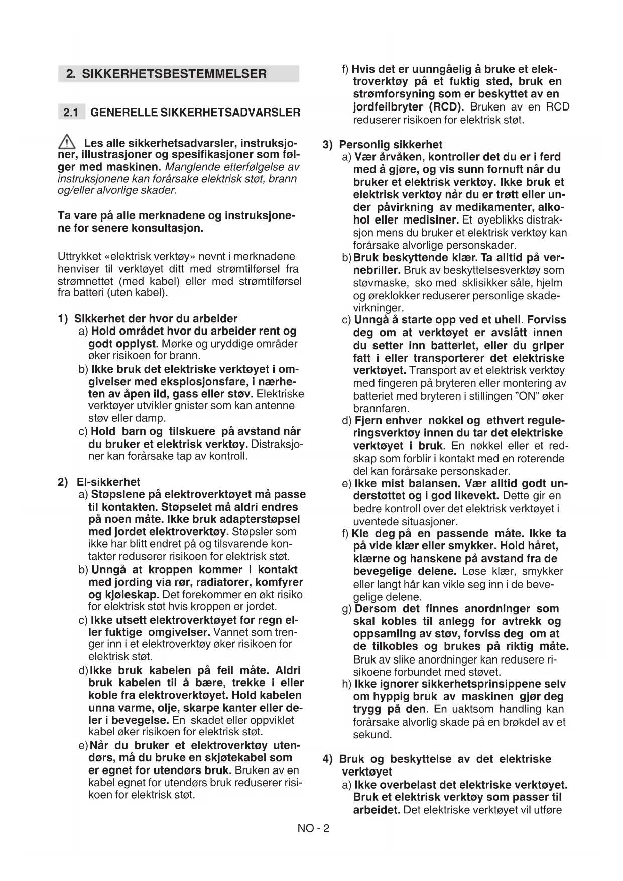 Les alle sikkerhetsadvarsler, instruksjo- ner, illustrasjoner og spesikasjoner som føl- ger med maskinen. Manglende etterfølgelse av instruksjonene kan forårsake elektrisk støt, brann og/eller alvorlige skader. Ta vare på alle merknadene og instruksjone- ne for senere konsultasjon. Uttrykket «elektrisk verktøy» nevnt i merknadene henviser til verktøyet ditt med strømtilførsel fra strømnettet (med kabel) eller med strømtilførsel fra batteri (uten kabel).