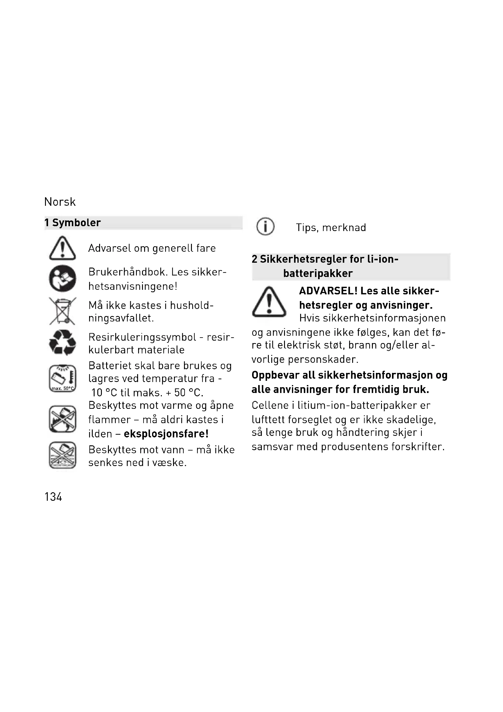 databeskyttelse El-værktøjet indeholder en chip, der automatisk gemmer maskin- og drifts data. De gemte data indeholder ingen direkte personoplysninger. Dataene kan udlæses kontaktløst med specielle apparater og anvendes ude lukkende af Festool med henblik på fejldiagnose, reparationer og håndte ring af garantikrav samt til kvalitetsfor Dansk 132bedring og videreudvikling af apparatet. Dataene anvendes ikke til andre formål uden kundens udtrykkelige tilladelse. Dansk 1331 Symboler Advarsel om generell fare Brukerhåndbok. Les sikker hetsanvisningene! Må ikke kastes i hushold ningsavfallet. Resirkuleringssymbol - resir kulerbart materiale max. 50°C Batteriet skal bare brukes og lagres ved temperatur fra - 10 °C til maks. + 50 °C. Beskyttes mot varme og åpne flammer – må aldri kastes i ilden – eksplosjonsfare! Beskyttes mot vann – må ikke senkes ned i væske. Tips, merknad 2 Sikkerhetsregler for li-ion- batteripakker ADVARSEL! Les alle sikker hetsregler og anvisninger. Hvis sikkerhetsinformasjonen og anvisningene ikke følges, kan det fø re til elektrisk støt, brann og/eller al vorlige personskader. Oppbevar all sikkerhetsinformasjon og alle anvisninger for fremtidig bruk. Cellene i litium-ion-batteripakker er lufttett forseglet og er ikke skadelige, så lenge bruk og håndtering skjer i samsvar med produsentens forskrifter. Norsk 134– Utladede batterier skal håndteres med forsiktighet. Batteripakker kan utgjøre en fare fordi de kan forårsa ke en veldig høy kortslutningsstrøm. Selv om det kan virke som om li-ion- batteripakkene er utladet, vil de aldri være fullstendig utladet. – Unngå fysiske slag/påvirkning. Slag fra gjenstander og gjenstander som trenger inn, kan skade batteriene. Dette kan føre til lekkasjer, varmeut vikling, røykutvikling, brann eller ek splosjoner i batteripakkene. – Når batteripakken ikke brukes, må du holde den unna metallgjenstander (f.eks. spiker, nøkler, binders o.l.) som kan kortslutte kontaktene. Kort slutning mellom batterikontaktene kan forårsake forbrenninger eller brann. – Beskytt batteriet mot varme, inklu dert ild og langvarig opphold i sollys. Ild og temperaturer over 130 °C kan føre til eksplosjon. – Ikke åpne batteripakken. Åpning el ler endring av batteripakkene kan skade sikkerhetsinnretningene. Det te kan føre til varmeutvikling, røykut vikling, brann eller eksplosjoner i bat teripakkene. – Ikke senk batteripakker ned i væ sker, som (salt-)vann eller drikke. Kontakt med væsker kan skade bat teripakkene. Dette kan føre til varme utvikling, røykutvikling, brann eller eksplosjoner i batteripakkene. Ikke Norsk 135bruk batteripakken. Kontakt et autori sert Festool-verksted. – Batteripakken må kun lades med la dere som er anbefalt av produsenten (se bildet). Ladere som er tiltenkt en bestemt type batteripakker, kan være brannfarlige hvis de brukes med an dre batteripakker. – Slukk aldri brennende li-ion-batteri er med vann! Bruk sand eller brann slukningsapparat. – Ved skader eller ikke forskriftsmes sig bruk av batteripakken kan det si ve ut damp. Dampen kan irritere luft veiene. Sørg for tilførsel av frisk luft og oppsøk lege ved ubehag. – Bruk batteripakken bare i kombina sjon med din Festool-enhet. Ellers vil ikke batteripakken være beskyttet mot farlig overbelastning. Bruk til an dre enheter kan medføre skader og brannfare. – Ved feilaktig bruk kan det lekke væ ske fra batteripakken. Unngå kontakt med slik væske. Ved utilsiktet kon takt må du skylle godt med vann. Dersom noen får batterivæske i øy nene, må du i tillegg kontakte lege. Batterivæskelekkasjer kan forårsake hudirritasjon eller forbrenninger. – Fra defekte batteripakker kan det renne ut væske som fukter gjenstan der i nærheten. Kontroller deler som dette gjelder. Delene rengjøres ved å tørke opp væsken med tørt kjøkken papir og skylle godt med rikelig med vann. Bruk beskyttelseshansker for å Norsk 136unngå kontakt med huden. Bytt ut de ler om nødvendig. – Ikke bruk skadde eller endrede bat teripakker. Skadde eller endrede bat teripakker kan ha uforutsigbare egen skaper, som igjen kan føre til brann, eksplosjoner eller personskader. – Ikke bruk skadde batteripakker. Slutt å bruke batteripakkene umid delbart dersom de viser tegn til unormale egenskaper, som luktut vikling, varme, misfarging eller de formasjoner. Ved fortsatt bruk kan batteripakkene utvikle varme og røyk, antennes eller eksplodere. – Batteripakken må ikke åpnes, tryk kes sammen, overopphetes (over 80 °C) eller brennes. Hvis ikke denne advarselen tas til følge, medfører det fare for forbrenning og brann. Følg anvisningene fra produsenten. 3 Tekniske data Batteripakke BP 18 Li Frekvens 2402– 2480 MHz Ekvivalent isotro pisk utstrålt effekt (EIRP) < 10 dBm Norsk 137Vekt BP 18 Li 3,1 Ergo I 0,4 kg BP 18 Li 3,1 CI 0,4 kg BP 18 Li 5,2 ASI 0,7 kg BP 18 Li 6,2 ASI 0,7 kg BP 18 Li 4,0 HPC-ASI 0,6 kg Ytterligere tekniske data finnes på mer keplaten på batteripakken. 4 Tiltenkt bruk Batteripakker er egnet for bruk med batteridrevne elektroverktøy fra Festool og angitte Festool-ladere (se bildet). Batteripakken er egnet for automatisk inn-/utkobling av støvsugeren. 5 Apparatets deler [1-1] Knapp for kapasitetsindikator [1-2] Kapasitetsindikator [1-3] Bluetooth