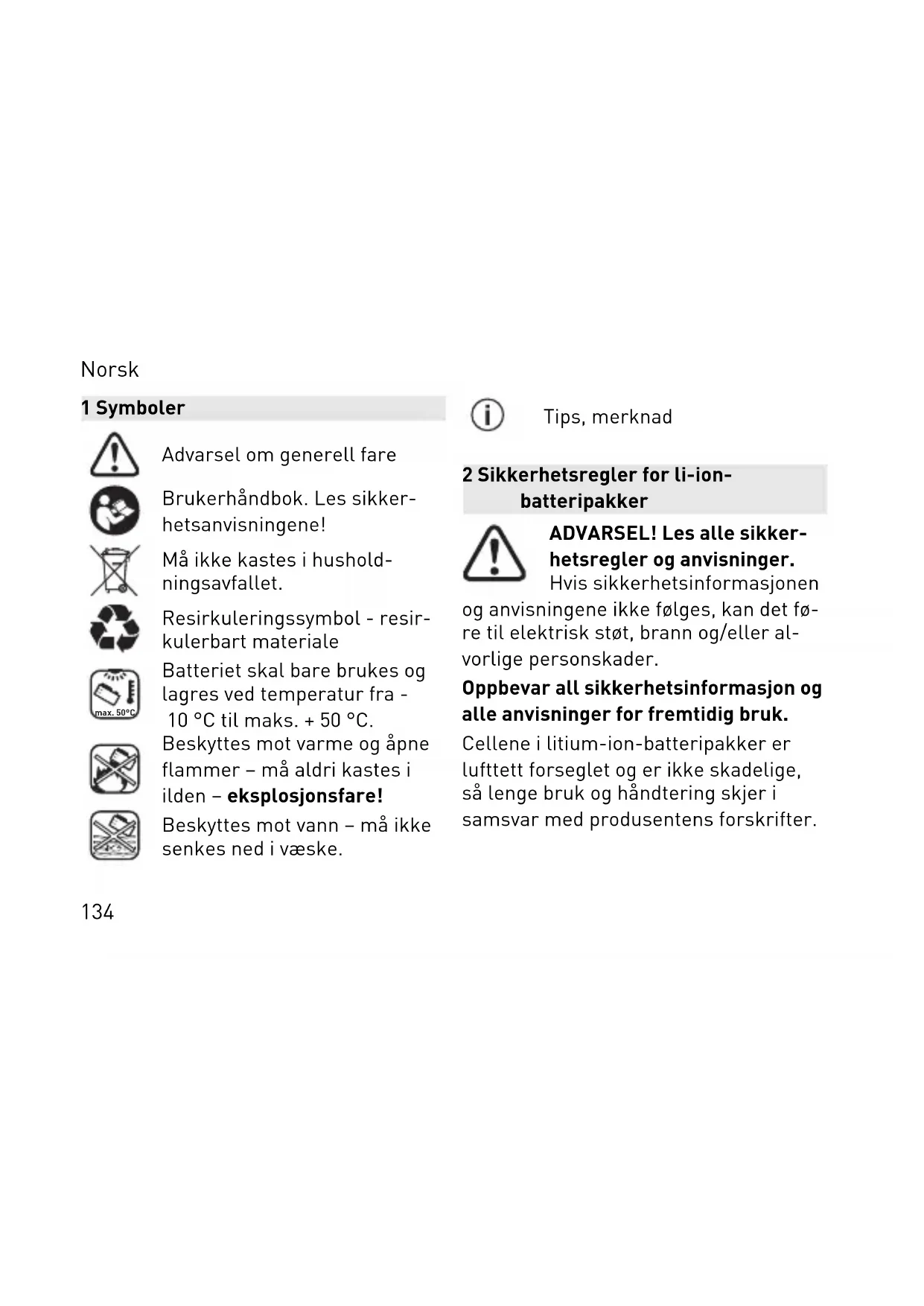 databeskyttelse El-værktøjet indeholder en chip, der automatisk gemmer maskin- og drifts data. De gemte data indeholder ingen direkte personoplysninger. Dataene kan udlæses kontaktløst med specielle apparater og anvendes ude lukkende af Festool med henblik på fejldiagnose, reparationer og håndte ring af garantikrav samt til kvalitetsfor Dansk 132bedring og videreudvikling af apparatet. Dataene anvendes ikke til andre formål uden kundens udtrykkelige tilladelse. Dansk 1331 Symboler Advarsel om generell fare Brukerhåndbok. Les sikker hetsanvisningene! Må ikke kastes i hushold ningsavfallet. Resirkuleringssymbol - resir kulerbart materiale max. 50°C Batteriet skal bare brukes og lagres ved temperatur fra - 10 °C til maks. + 50 °C. Beskyttes mot varme og åpne flammer – må aldri kastes i ilden – eksplosjonsfare! Beskyttes mot vann – må ikke senkes ned i væske. Tips, merknad 2 Sikkerhetsregler for li-ion- batteripakker ADVARSEL! Les alle sikker hetsregler og anvisninger. Hvis sikkerhetsinformasjonen og anvisningene ikke følges, kan det fø re til elektrisk støt, brann og/eller al vorlige personskader. Oppbevar all sikkerhetsinformasjon og alle anvisninger for fremtidig bruk. Cellene i litium-ion-batteripakker er lufttett forseglet og er ikke skadelige, så lenge bruk og håndtering skjer i samsvar med produsentens forskrifter. Norsk 134– Utladede batterier skal håndteres med forsiktighet. Batteripakker kan utgjøre en fare fordi de kan forårsa ke en veldig høy kortslutningsstrøm. Selv om det kan virke som om li-ion- batteripakkene er utladet, vil de aldri være fullstendig utladet. – Unngå fysiske slag/påvirkning. Slag fra gjenstander og gjenstander som trenger inn, kan skade batteriene. Dette kan føre til lekkasjer, varmeut vikling, røykutvikling, brann eller ek splosjoner i batteripakkene. – Når batteripakken ikke brukes, må du holde den unna metallgjenstander (f.eks. spiker, nøkler, binders o.l.) som kan kortslutte kontaktene. Kort slutning mellom batterikontaktene kan forårsake forbrenninger eller brann. – Beskytt batteriet mot varme, inklu dert ild og langvarig opphold i sollys. Ild og temperaturer over 130 °C kan føre til eksplosjon. – Ikke åpne batteripakken. Åpning el ler endring av batteripakkene kan skade sikkerhetsinnretningene. Det te kan føre til varmeutvikling, røykut vikling, brann eller eksplosjoner i bat teripakkene. – Ikke senk batteripakker ned i væ sker, som (salt-)vann eller drikke. Kontakt med væsker kan skade bat teripakkene. Dette kan føre til varme utvikling, røykutvikling, brann eller eksplosjoner i batteripakkene. Ikke Norsk 135bruk batteripakken. Kontakt et autori sert Festool-verksted. – Batteripakken må kun lades med la dere som er anbefalt av produsenten (se bildet). Ladere som er tiltenkt en bestemt type batteripakker, kan være brannfarlige hvis de brukes med an dre batteripakker. – Slukk aldri brennende li-ion-batteri er med vann! Bruk sand eller brann slukningsapparat. – Ved skader eller ikke forskriftsmes sig bruk av batteripakken kan det si ve ut damp. Dampen kan irritere luft veiene. Sørg for tilførsel av frisk luft og oppsøk lege ved ubehag. – Bruk batteripakken bare i kombina sjon med din Festool-enhet. Ellers vil ikke batteripakken være beskyttet mot farlig overbelastning. Bruk til an dre enheter kan medføre skader og brannfare. – Ved feilaktig bruk kan det lekke væ ske fra batteripakken. Unngå kontakt med slik væske. Ved utilsiktet kon takt må du skylle godt med vann. Dersom noen får batterivæske i øy nene, må du i tillegg kontakte lege. Batterivæskelekkasjer kan forårsake hudirritasjon eller forbrenninger. – Fra defekte batteripakker kan det renne ut væske som fukter gjenstan der i nærheten. Kontroller deler som dette gjelder. Delene rengjøres ved å tørke opp væsken med tørt kjøkken papir og skylle godt med rikelig med vann. Bruk beskyttelseshansker for å Norsk 136unngå kontakt med huden. Bytt ut de ler om nødvendig. – Ikke bruk skadde eller endrede bat teripakker. Skadde eller endrede bat teripakker kan ha uforutsigbare egen skaper, som igjen kan føre til brann, eksplosjoner eller personskader. – Ikke bruk skadde batteripakker. Slutt å bruke batteripakkene umid delbart dersom de viser tegn til unormale egenskaper, som luktut vikling, varme, misfarging eller de formasjoner. Ved fortsatt bruk kan batteripakkene utvikle varme og røyk, antennes eller eksplodere. – Batteripakken må ikke åpnes, tryk kes sammen, overopphetes (over 80 °C) eller brennes. Hvis ikke denne advarselen tas til følge, medfører det fare for forbrenning og brann. Følg anvisningene fra produsenten. 3 Tekniske data Batteripakke BP 18 Li Frekvens 2402– 2480 MHz Ekvivalent isotro pisk utstrålt effekt (EIRP) < 10 dBm Norsk 137Vekt BP 18 Li 3,1 Ergo I 0,4 kg BP 18 Li 3,1 CI 0,4 kg BP 18 Li 5,2 ASI 0,7 kg BP 18 Li 6,2 ASI 0,7 kg BP 18 Li 4,0 HPC-ASI 0,6 kg Ytterligere tekniske data finnes på mer keplaten på batteripakken. 4 Tiltenkt bruk Batteripakker er egnet for bruk med batteridrevne elektroverktøy fra Festool og angitte Festool-ladere (se bildet). Batteripakken er egnet for automatisk inn-/utkobling av støvsugeren. 5 Apparatets deler [1-1] Knapp for kapasitetsindikator [1-2] Kapasitetsindikator [1-3] Bluetooth