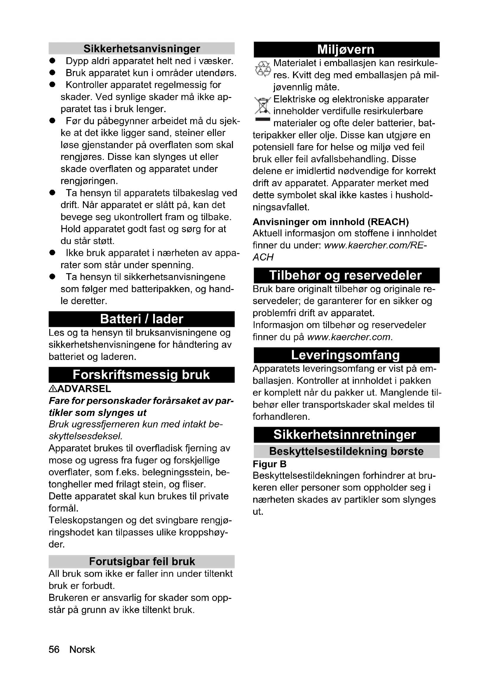 Figur K Stille inn rengjøringshode Du kan justere vinkelen på rengjøringsho- det. Apparatet har følgende innstillingsmu- ligheter: Advarsel mot objekter som slynges ut. Hold andre personer unna ar- beidsområdet. Bruk egnet hørselsvern og ver- nebrille ved drift av apparatet. Beskytt apparatet mot regn og vannsprut. For brukere som er opp til 177 cm høye. For brukere som er høyere enn 178 cm. For bruk under gjenstander, f.eks. en benk. Rotasjonsretning for åpning av dekslet til børstebåndet. Rotasjonsretning for lukking av dekslet til børstebåndet. For brukere som er opp til 177 cm høye.58 Norsk