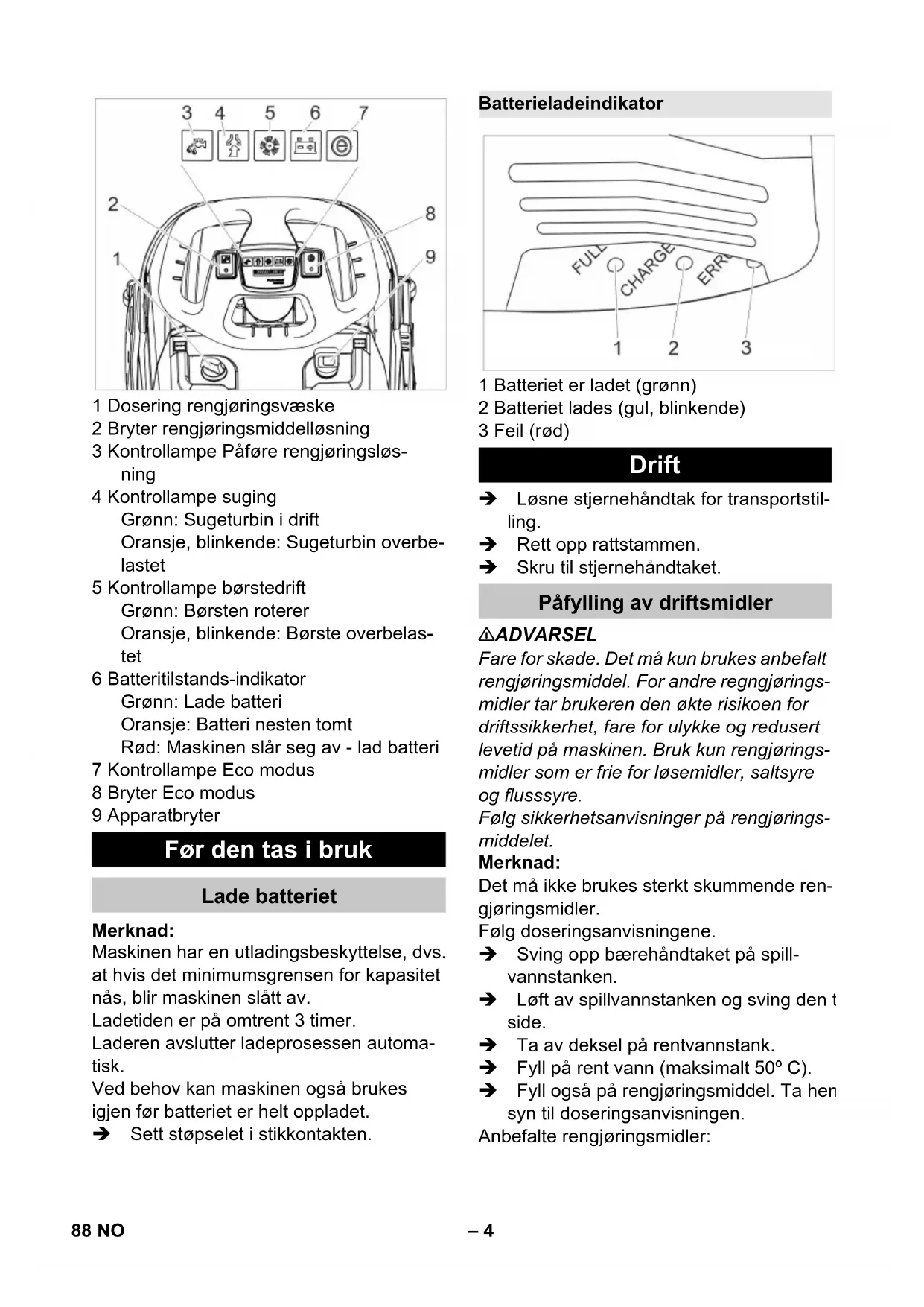 dB(A) 84 83DA– 10 Hermed erklærer vi, at den nedenfor nævn- te maskine i design og konstruktion og i den af os i handlen bragte udgave overholder de gældende grundlæggende sikkerheds- og sundhedskrav i EU-direktiverne. Ved ændringer af maskinen, der foretages uden forudgående aftale med os, mister denne erklæring sin gyldighed. Underskriverne handler på bestyrelsens vegne og med dennes fuldmagt. Dokumentationsbefuldmægtiget: S. Reiser Alfred Kärcher SE & Co. KG Alfred-Kärcher-Straße 28-40 71364 Winnenden (Germany) Tel.: +49 7195 14-0 Fax: +49 7195 14-2212 Winnenden, 2021/02/01 EU- overensstemmelseserklæring Produkt: Skuresugningsmaskine Type: 1.783-xxx Gældende EU-direktiver 2006/42/EF (+2009/127/EF) 2014/30/EU 2011/65/EU 2014/53/EU (TCU) Anvendte harmoniserede standarder EN 60335–1 EN 60335–2–72 EN 60335-2-29 EN 55012: 2007 + A1: 2009 EN 55014-1:2006 + A1: 2009 + A2:2011 EN 55014–2: 1997 + A1: 2001 + A2: 2008 EN 61000–3–2: 2014 EN 61000–3–3: 2013 EN 61000–6–2: 2005 EN 62233: 2008 EN IEC 63000: 2018 Anvendte tyske standarder TCU EN 301 511 V12.5.1 EN 300 440 V2.1.1 EN 300 328 V2.2.2 EN 300 330 V2.1.1 Chairman of the Board of Management Director Regulatory Affairs & Certification 84 DA– 1 Før første gangs bruk av appa- ratet, les denne originale bruks- anvisningen, følg den og oppbevar den for senere bruk eller for overlevering til neste eier. Før maskinen tas i bruk for første gang, må du lese nøye gjennom denne bruksanvis- ningen og følge vedlagte brosjyre med sik- kerhetsanvisninger for gulvskuremaskiner, 5.956-251.0 몇 ADVARSEL Ikke bruk maskinen i stigninger. Maskinen må først tas i bruk etter at be- holderen og alle deksler er satt på plass. FARE Anvisning om en umiddelbar truende fare som kan føre til store personskader eller til død. 몇 ADVARSEL Anvisning om en mulig farlig situasjon som kan føre til store personskader eller til død. 몇 FORSIKTIG Anvisning om en mulig farlig situasjon som kan føre til mindre personskader. OBS Anvisning om en mulig farlig situasjon som kan føre til materielle skader. Maskinen har innebygde litium-ione batteri- er. Disse er underlagt spesielle betingelser. Demontering. montering, og kontroll av de- fekte batterier skal kun foretas av Kärcher kundeservice eller en fagmann. Anvisninger om lagring og transport får du fra Kärcher kundeservice. FARE – Ombygging og endringer av maskinen er ikke tillatt. – Ikke åpne batteriet, det er fare for kort- slutning, i tillegg kan irriterende damper eller etsende væsker strømme ut. Ikke utsett batterier for direkte sol- lys, varme eller åpen ild, det består eksplosjonsfare. – Ladeapparatet skal ikke brukes i ek- splosjonsfarlige omgivelser. – Sørt for tilstrekkelig ventilasjon under ladingen. – Bruk ikke ladeapparat i skitten eller våt tilstand. – Man må ikke håndtere åpen flamme, lage gnister eller røyke i nærheten av et batteri eller i et batteriladerom. Eksplo- sjonsfare. 몇 ADVARSEL – Før all bruk skal maskinen og strømka- bel kontrolleres for skader. Skadede maskiner skal ikke brukes, skadede de- ler skal bare repareres av fagfolk. Hold barn borte fra batterier og batteri- lader. Ikke lad skadede batterier. Skadede batterier skal skiftes av Kärcher kunde- service. – Defekte batterier skal ikke kasetes i husholdningsavfallet, kontakt Kärcher kundeservice. – Unngå kontakt med væske som komm- mer ut av defekte batterier. Ved ufrivillig kontakt må du straks skylle bort væs- Innholdsfortegnelse Sikkerhetsanvisninger. . . . . . . NO 1 Funksjon . . . . . . . . . . . . . . . . . NO 2 Forskriftsmessig bruk . . . . . . . NO 2 Miljøvern . . . . . . . . . . . . . . . . . NO 2 Garanti . . . . . . . . . . . . . . . . . . NO 2 Tilbehør og reservedeler. . . . . NO 2 Betjeningselementer . . . . . . . . NO 3 Før den tas i bruk . . . . . . . . . . NO 4 Drift . . . . . . . . . . . . . . . . . . . . . NO 4 Stans av driften . . . . . . . . . . . . NO 6 Transport. . . . . . . . . . . . . . . . . NO 6 Lagring . . . . . . . . . . . . . . . . . . NO 6 Pleie og vedlikehold . . . . . . . . NO 6 Avfallshåndtering. . . . . . . . . . . NO 7 Feil . . . . . . . . . . . . . . . . . . . . . NO 7 Tilbehør. . . . . . . . . . . . . . . . . . NO 8 Tekniske data . . . . . . . . . . . . . NO 9 EU-samsvarserklæring . . . . . . NO 9 Sikkerhetsanvisninger Risikotrinn Anvisninger for batteri (oppladbart) og ladeapparat 85NO– 2 ken ved hjelp av vann. Ved kontakt med øynene skal du kontakte lege. 몇 FORSIKTIG – Denne bruksanvisningen skal alltid føl- ges. Følg lovpålagte retningslinjer om håndtering av batterier. – Nettspenningen må stemme overens med angitt spenning på typeskiltet på maskinen. – Ladeapparatet skal bare brukes til la- ding av godkjente batteripakker. – Det oppladbare batterier skal kun bru- kes sammen med denne maskinen, an- nen bruk er forbudt og farlig. Når sikkerhetsbryteren slippes vil børstene slås av. Slipesugemaskinen er beregnet for våtren- gjøring av jevne gulv. Den kan ved innstilling av vannmengden enkelt tilpasses en hver rengjøringsoppga- ve. En arbeidsbredde på 350 mm og frisk- og spillvanntank på 12 liter, muliggjør en effek- tiv rengjøring med lange arbeidsøkter. Batteriet kan lades ved hjelp av en innebyg- get batterilader i en 230 V stikkontakt. Bruk av denne maskinen må utelukkende være iht. det som er angitt i denne bruksan- visning. – Denne maskinen egner seg til industri- elt bruk, f.eks. i hoteller, skoler, syke- hus, fabrikker, butikker, kontorer og ut- leiefirmaer. – Maskinen må kun brukes til rengjøring av ikke fuktighetsømfintlige, plane gulv. – Dette apparatet er ment for bruk innen- dørs. – Maskinen er ikke egnet til rengjøring av frosne gulv (f.eks. i kjølerom). – Til maskinen må det kun brukes origi- nalt tilbehør og originale reservedeler. Materialet i emballasjen kan resirku- leres. Ikke kast emballasjen i hus- holdningsavfallet, men lever den inn til re