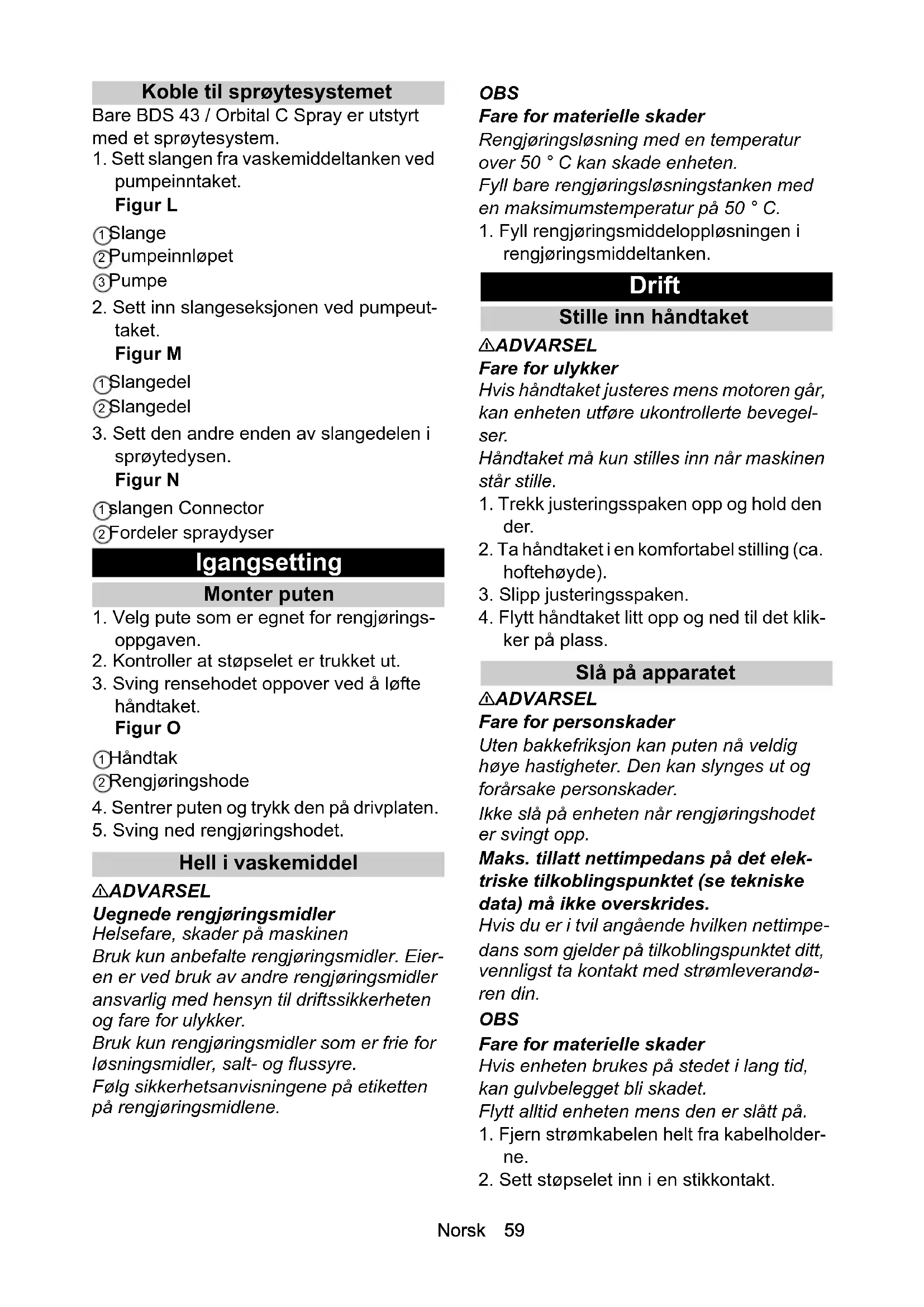 - EU-samsvarserklæring Norsk 57 Apparatet må ikke brukes utendørs. Apparatet skal ikke brukes i korrosive omgivelser. Apparatet skal aldri brukes i eksplo- sjonsutsatte omgivelser. Bruk apparatet kun på overflater med en maksimal gradient, som spesifisert i delen "Tekniske data". I kontakten på apparatet skal det kun kobles til tilbehør som er oppført i kapit- let "Tilbehør". Sikkerhetsanvisninger Før maskinen tas i bruk for første gang, må du lese nøye gjennom denne bruksveiled- ningen og følge vedlagte brosjyre med sik- kerhetsanvisninger for diskmaskiner, nr. 5.956-251.0. Symboler på apparatet Forbrenningsfare Enkelte deler av enheten blir varme under drift. Ikke berør deler merket slik før de har kjølt seg ned. Sikkerhetsinnretninger 몇 FORSIKTIG Manglende eller endrede sikkerhetsinn- retninger Sikkerhetsinnretningene tjener til din egen sikkerhet. Du må aldri forandre eller omgå sikkerhets- innretninger. Låseknapp Enheten kan ikke startes hvis ikke opp- låsningsknappen er trykket. Miljøvern Materialet i emballasjen kan resirkule- res. Kvitt deg med emballasjen på mil- jøvennlig måte. Elektriske og elektroniske apparater inneholder verdifulle resirkulerbare materialer og ofte deler batterier, bat- teripakker eller olje. Disse kan utgjøre en potensiell fare for helse og miljø ved feil bruk eller feil avfallsbehandling. Disse delene er imidlertid nødvendige for korrekt drift av apparatet. Apparater merket med dette symbolet skal ikke kastes i hushold- ningsavfallet. Anvisninger om innhold (REACH) Aktuell informasjon om stoffene i innholdet finner du under: www.kaercher.com/RE- ACH Tilbehør og reservedeler Bruk bare originalt tilbehør og originale re- servedeler; de garanterer for en sikker og problemfri drift av apparatet. Informasjon om tilbehør og reservedeler finner du på www.kaercher.com. Tilbehør Leveringsomfang Kontroller at innholdet i pakken er komplett når du pakker ut. Manglende tilbehør eller transportskader skal meldes til forhandle- ren. Betjeningselementer Figur A 1 Tilt justeringsspak 2 Doseringsspak rengjøringsløsning 3 PÅ/AV-spak 4 Låseknapp 5 Strømkabel med strømstøpsel Betegnelse Bestil- lingsnr. Pute, rød 6.369-470.0 Pute, grønn 6.369-472.0 Pute, svart 6.369-473.0 Pute, blå 6.369-471.0 Pute, panser, 5 stk. 6.905-098.0 Pad SPP 6.371-344.0 Poleringspute, hvit 6.369-469.0 Poleringspute, med naturlig hår 6.371-149.0 Poleringspute, med lett korn 6.371-081.0 Diamantpute, grønn, 5 stk 6.371-238.0 Diamantpute, hvit, 5 stk 6.371-256.0 Diamantpute, gul, 5 stk 6.371-257.0 Pute, mikrofiber 6.371-346.0 Pute, melamin, 2 stk 6.371-345.0 Tank BDS 43 / Orbital C 5.051-992.058 Norsk 6 Typeskilt 7 Kabelkrok, dreibar 8 Håndtak 9 Rengjøringsmiddeltank 10 Håndtak 11 Rengjøringshode 12 Bryter spray * 13 Klemskrue * 14 Dyse p. 61