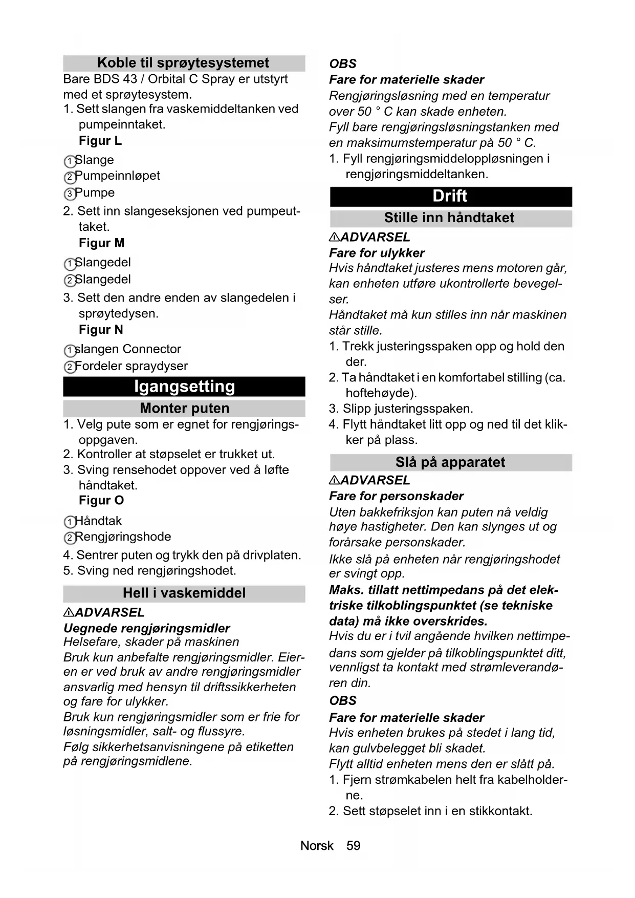 Bistand ved feil 몇 ADVARSEL Fare for personskader Enheten kan starte uventet. Sørg for å trekke strømpluggen ut av kon- takten før du begynner å jobbe på enheten.Norsk 61 Ved funksjonsfeil som ikke kan utbedres ved hjelp av følgende informasjon, venn- ligst kontakt kundeservice. Utilfredsstillende rengjøringsresultat Bytt skitten pute. Bytt ut slitt pute. Kontroller det anvendte rengjørings- middelet er egnet til denne bruken. Kontroller om den anvendte puten er eg- net til denne bruken. Enheten vibrerer sterkt Kontroller den sentrale plasseringen av puten på drivplaten. Sjekk festet på puten. Puten roterer ikke Kontroller om fremmedlegemer blokke- rer platens drivplate. Fjern fremmedle- gemer hvis nødvendig. Sett støpselet inn i stikkontakten. Bare med BDS 43/Orbital C spray Sprøytesystemet sprayer ikke eller sprøyter ikke nok Påfyll vaskemiddeltanken. Rengjør filteret i vaskemiddelstanken. Rengjør dysene. Garanti Vår ansvarlige salgsorganisasjon for det enkelte land har utgitt garantibetingelsene som gjelder i det aktuelle landet. Eventuelle feil på apparatet repareres gratis i garantiti- den dersom disse kan føres tilbake til mate- rial- eller produksjonsfeil. Ved behov for garantireparasjoner, vennligst henvend deg med kjøpskvitteringen til din forhandler eller nærmeste autoriserte kundeservice. (Se adresse på baksiden) Tekniske data Unntaksgrunn i henhold til forordning (EU) 2019/1781 vedlegg I avsnitt 2 (12): j) Med forbehold om tekniske endringer. EU-samsvarserklæring Vi erklærer herved at maskinen beskrevet nedenfor på grunn av design og konstruk- sjon, samt i versjonen som vi har markeds- ført, oppfyller de relevante grunnleggende helse- og sikkerhetskravene i EU-direktive- BDS 43/Or- bital C BDS 43/Or- bital C Spray Effektspesifikasjoner apparat Spenning V 220-