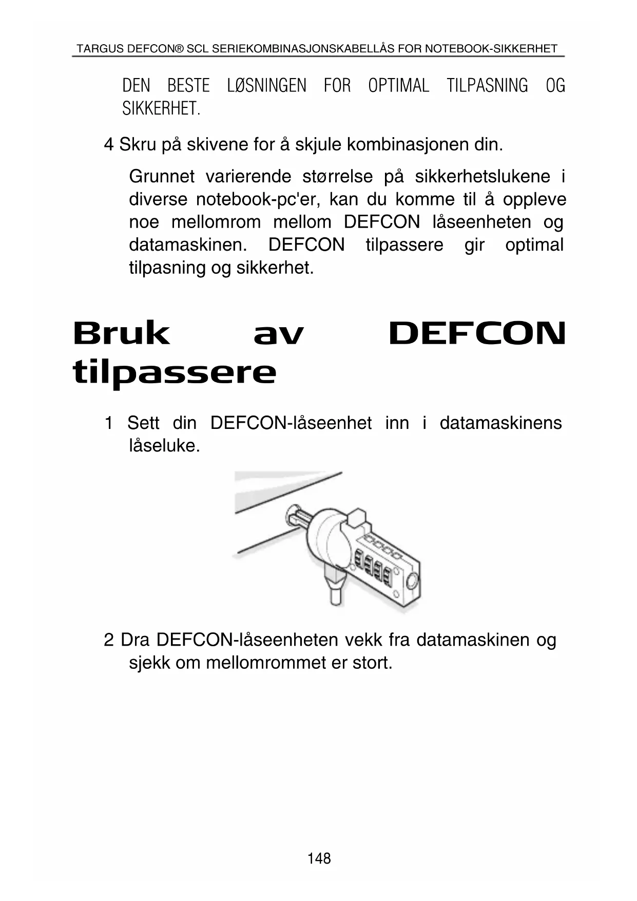 NOTEBOOK- SIKKERHET Introduksjon Takk for at du kjøpte Targus DEFCON® SCL seriekombinasjonskabellåsen for notebook-sikkerhet. DEFCON SCL hjelper deg med å beskytte din verdifulle notebook-pc fra tyveri med en firesifret seriekombinasjonslås. Forhåndsinnstilt kombinasjonslås eliminerer behovet for nøkler og gjør det umulig å nullstille kombinasjonen din. I tillegg til denne brukerguiden, inneholder pakken: