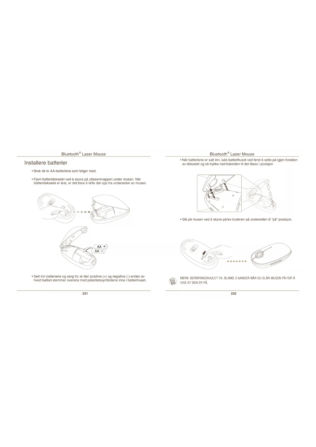 KAN VARIERE I HENHOLD TIL VERSJONEN AV DIN BLUETOOTH-ENHETSDRIVER. Før du kan begynne å bruke din Bluetooth-mus, må du først utføre noen innledende installasjonstrinn. Når det gjenstår 60 minutter med strøm, vil et rødt varsellys lyse i 8 sekunder. Når det gjenstår bare 30 minutter med strøm, vil det røde varsellyset blinke vedvarende. Bruke musen Bluetooth-programvare: Mac