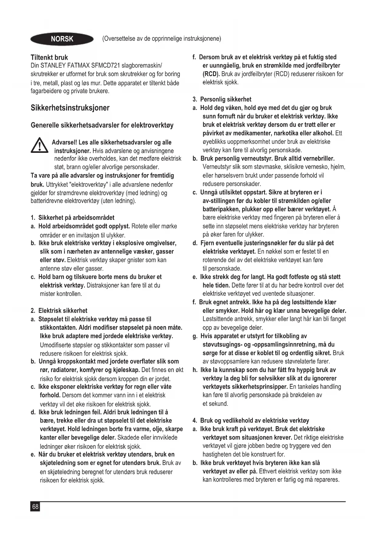 Bruk hørselvern når du bruker skruverktøy med slag. Å bli utsatt for støy kan forårsake hø selstap. Ytterligere sikkerhetsinstruksjoner for batterier og ladere Batterier u Forsøk aldri å åpne av noen årsak. u Ikke utsett batteriene for vann. u Ikke oppbevar det på steder hvor temperaturen kan komme over 40 °C. u Lad bare ved temperaturer mellom 10 og 40 °C. u Bruk bare laderen som følger med apparatet. u Følg instruksene som nnes i avsnittet „Miljøvern“ når du skal kaste batterier. Ladere u STANLEY FATMAX-laderen skal bare brukes til å lade batteriet i apparatet som laderen kom sammen med. Andre batterier kan sprekke og føre til personskade og materiell skade. u Prøv aldri å lade ikke-oppladbare batterier. u Skift ut defekte ledninger umiddelbart. u Ikke utsett laderen for vann. u Ikke åpne laderen. u Ikke stikk gjenstander eller ngre inn i laderen.