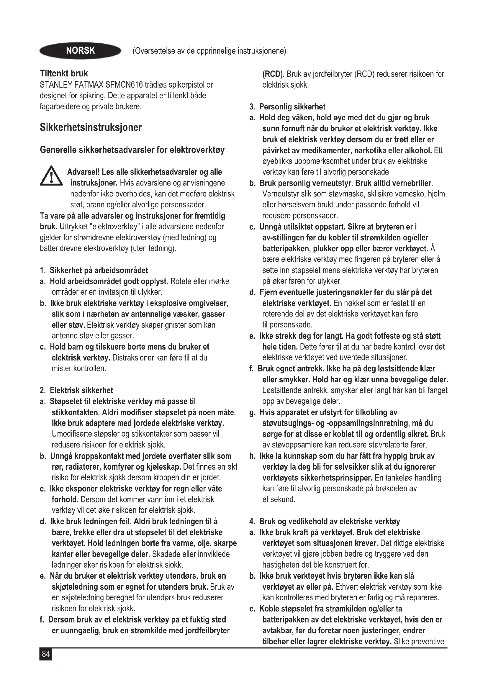 Advarsel! For å redusere skaderisikoen, les bruksanvisningen. Advarsel! Brukeren må bruke vernebriller og hørselvern for å redusere risikoen for skade. Forsiktig: Ikke se direkte på lampen når den er på.87 (Oversettelse av de opprinnelige instruksjonene) NORSK Hold hendene og kroppsdeler unna det nære arbeidsområdet. Arbeidslysene fungerer også som indikator for lavt batteri og fastklemt spiker, i tillegg til å belyse arbeidsområdet. Ytterligere sikkerhetsinstruksjoner for batterier og ladere Batterier u Forsøk aldri å åpne av noen årsak. u Ikke utsett batteriet for vann. u Oppbevar ikke på steder der temperaturen kan overskride 40 °C. u Lad bare ved temperaturer mellom 10 °C og 40 °C. u Følg instruksene som nnes i avsnittet „Miljø“ når du skal kaste batterier. u Ikke skad eller deformer batteripakken ved punktering eller støt, da dette kan føre til risiko for personskade og brann. u Ikke lad skadede batterier. u Under ekstreme forhold kan batterilekkasje forekomme. Hvis du oppdager væske på batteriene, må du tørke den forsiktig av med en klut. Unngå kontakt med huden. u Hvis væsken kommer i kontakt med huden eller øynene, følger du instruksjonene nedenfor. Advarsel! Batterivæsken kan føre til personskade eller skade på eiendom. Ved hudkontakt skyller du umiddelbart med vann. Hvis huden blir rød eller irritert eller smerter inntreffer, søk øyeblikkelig medisinsk hjelp. Hvis væsken kommer i kontakt med øynene, skyller du umiddelbart med rent vann og søker øyeblikkelig medisinsk hjelp. Ladere u STANLEY FATMAX-laderen skal bare brukes til å lade batteriet i apparatet som laderen kom sammen med. Andre batterier kan sprekke og føre til personskade og materiell skade. u Prøv aldri å lade ikke-oppladbare batterier. u Skift ut defekte ledninger umiddelbart. u Ikke utsett laderen for vann. u Ikke åpne laderen. u Ikke stikk noe ned i laderen Symboler på laderen