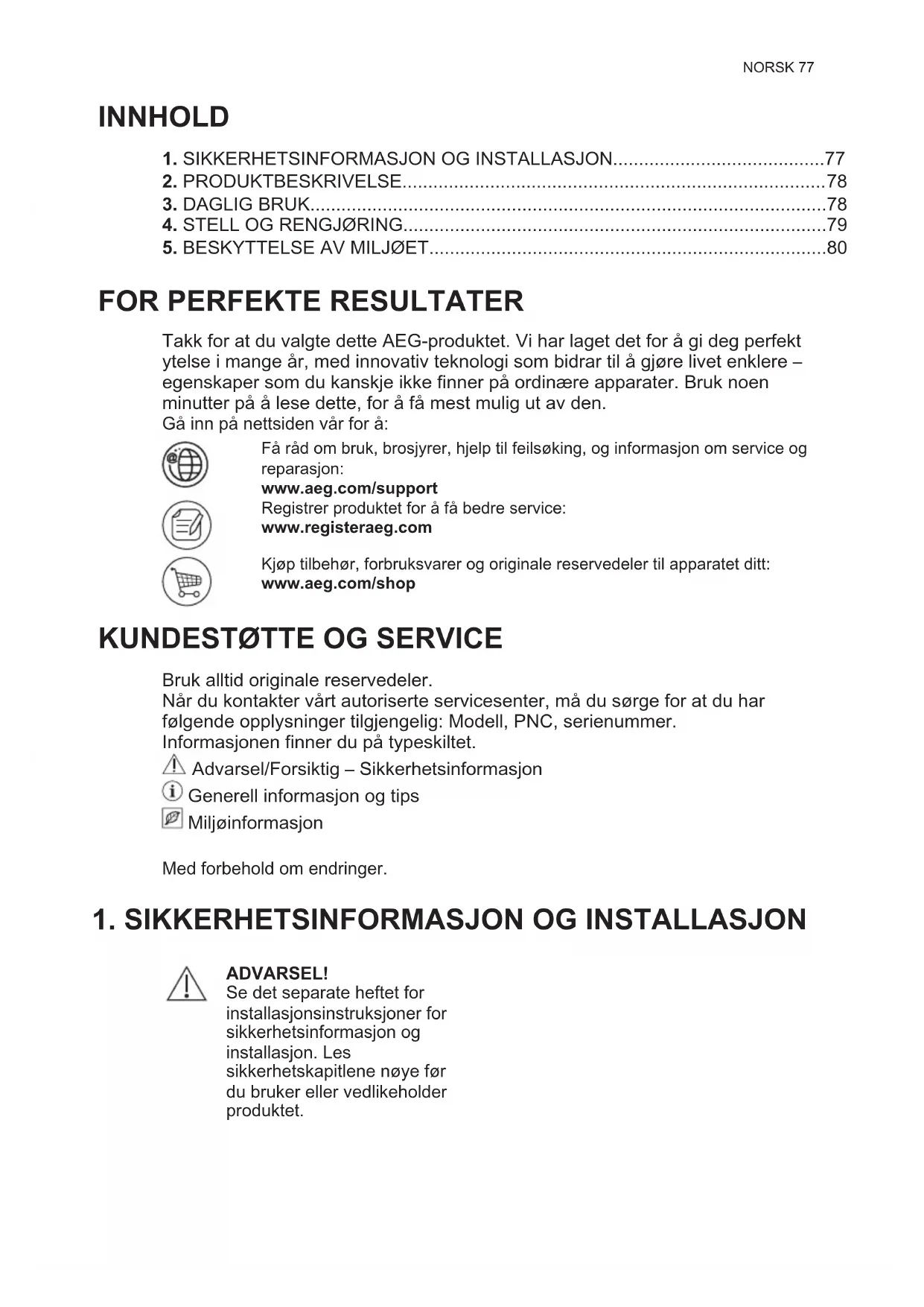 Takk for at du valgte dette AEG-produktet. Vi har laget det for å gi deg perfekt ytelse i mange år, med innovativ teknologi som bidrar til å gjøre livet enklere – egenskaper som du kanskje ikke finner på ordinære apparater. Bruk noen minutter på å lese dette, for å få mest mulig ut av den. Gå inn på nettsiden vår for å: Få råd om bruk, brosjyrer, hjelp til feilsøking, og informasjon om service og reparasjon: www.aeg.com/support Registrer produktet for å få bedre service: www.registeraeg.com Kjøp tilbehør, forbruksvarer og originale reservedeler til apparatet ditt: www.aeg.com/shop