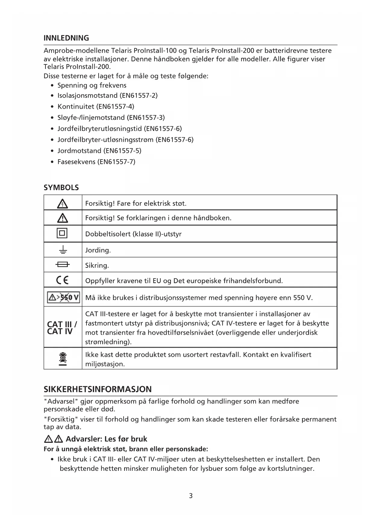 INNLEDNINGAmprobe-modellene Telaris ProInstall-100 og Telaris ProInstall-200 er batteridrevne testere av elektriske installasjoner. Denne håndboken gjelder for alle modeller. Alle figurer viser Telaris ProInstall-200.Disse testerne er laget for å måle og teste følgende:• Spenning og frekvens• Isolasjonsmotstand (EN61557-2)• Kontinuitet (EN61557-4)• Sløyfe-/linjemotstand (EN61557-3)• Jordfeilbryterutløsningstid (EN61557-6)• Jordfeilbryter-utløsningsstrøm (EN61557-6)• Jordmotstand (EN61557-5)• Fasesekvens (EN61557-7)SYMBOLS Forsiktig! Fare for elektrisk støt. Forsiktig! Se forklaringen i denne håndboken. Dobbeltisolert (klasse II)-utstyr Jording. Sikring. Oppfyller kravene til EU og Det europeiske frihandelsforbund.Må ikke brukes i distribusjonssystemer med spenning høyere enn 550 V.CAT III / CAT IVCAT III-testere er laget for å beskytte mot transienter i installasjoner av fastmontert utstyr på distribusjonsnivå; CAT IV-testere er laget for å beskytte mot transienter fra hovedtilførselsnivået (overliggende eller underjordisk strømledning). Ikke kast dette produktet som usortert restavfall. Kontakt en kvalifisert miljøstasjon. SIKKERHETSINFORMASJON "Advarsel" gjør oppmerksom på farlige forhold og handlinger som kan medføre personskade eller død."Forsiktig" viser til forhold og handlinger som kan skade testeren eller forårsake permanent tap av data. W Advarsler: Les før bruk For å unngå elektrisk støt, brann eller personskade:• Ikke bruk i CAT III- eller CAT IV-miljøer uten at beskyttelseshetten er installert. Den beskyttende hetten minsker muligheten for lysbuer som følge av kortslutninger.4