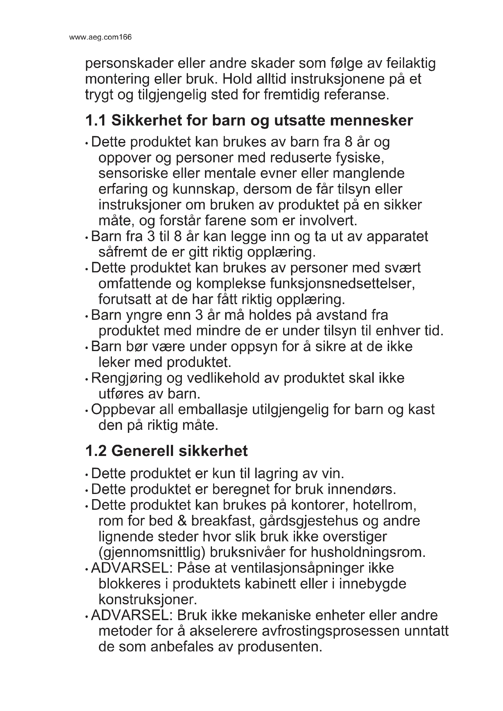 ADVARSEL! Se kapitlene som omhandler sikkerhet. www.aeg.com1768.1 Generelle advarsler FORSIKTIG! Trekk støpselet ut av stikkontakten før du foretar enhver rengjøring av skapet. Dette produktet inneholder hydrokarboner i kjølekretsen. Vedlikehold må derfor bare utføres av autoriserte serviceteknikere. Tilbehøret og delene til prduktet er ikke egnet for vask i oppvaskmaskin.