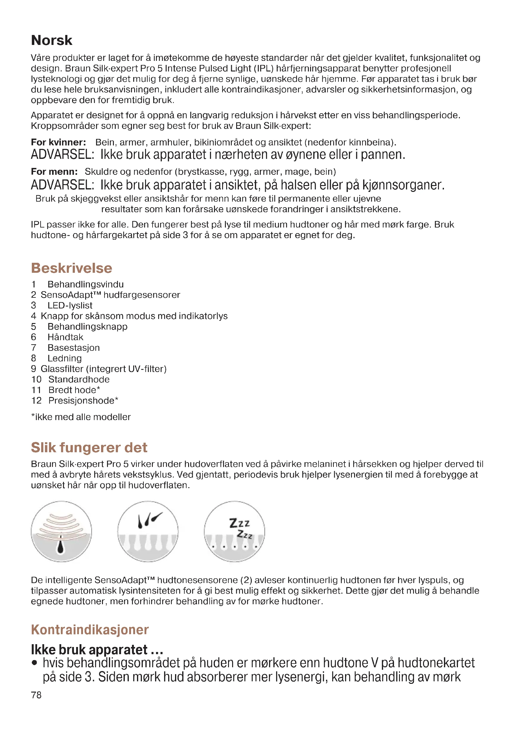 skjegg/ansiktshår for menn. Det anbefales ikke å bruke dette apparatet på områder hvor det finnes dermale fyllstoffer. Må ikke brukes mer enn én gang i uken på samme område. Det kan oppstå skade i huden etter langvarig eller gjentakende behandling på ett sted. 91840600_Victoria2_PL5_Euro1.indd 7991840600_Victoria2_PL5_Euro1.indd 79 13.01.21 10:0413.01.21 10:0480 Sikkerhet for øynene Ikke se direkte inn i glassfilteret (9) eller forsøk å slå på apparatet hvis det er rettet mot øynene. For å beskytte dine egne og andres øyne, aktiveres apparatet kun når begge hudtonesensorene berører huden. Dersom apparatet på noe tidspunkt aktiveres UTEN AT begge sensorene er i kontakt med huden, må du straks AVBRYTE bruken av apparatet og kontakte forhandleren. Hvis instruksjonene ikke følges, kan det føre til skader på øynene (som potensielt kan føre til synstap) eller skader på huden. Beskytt øynene mot eksponering. Ikke bruk apparatet over øyelokkene eller nært øynene. Forholdsregler
