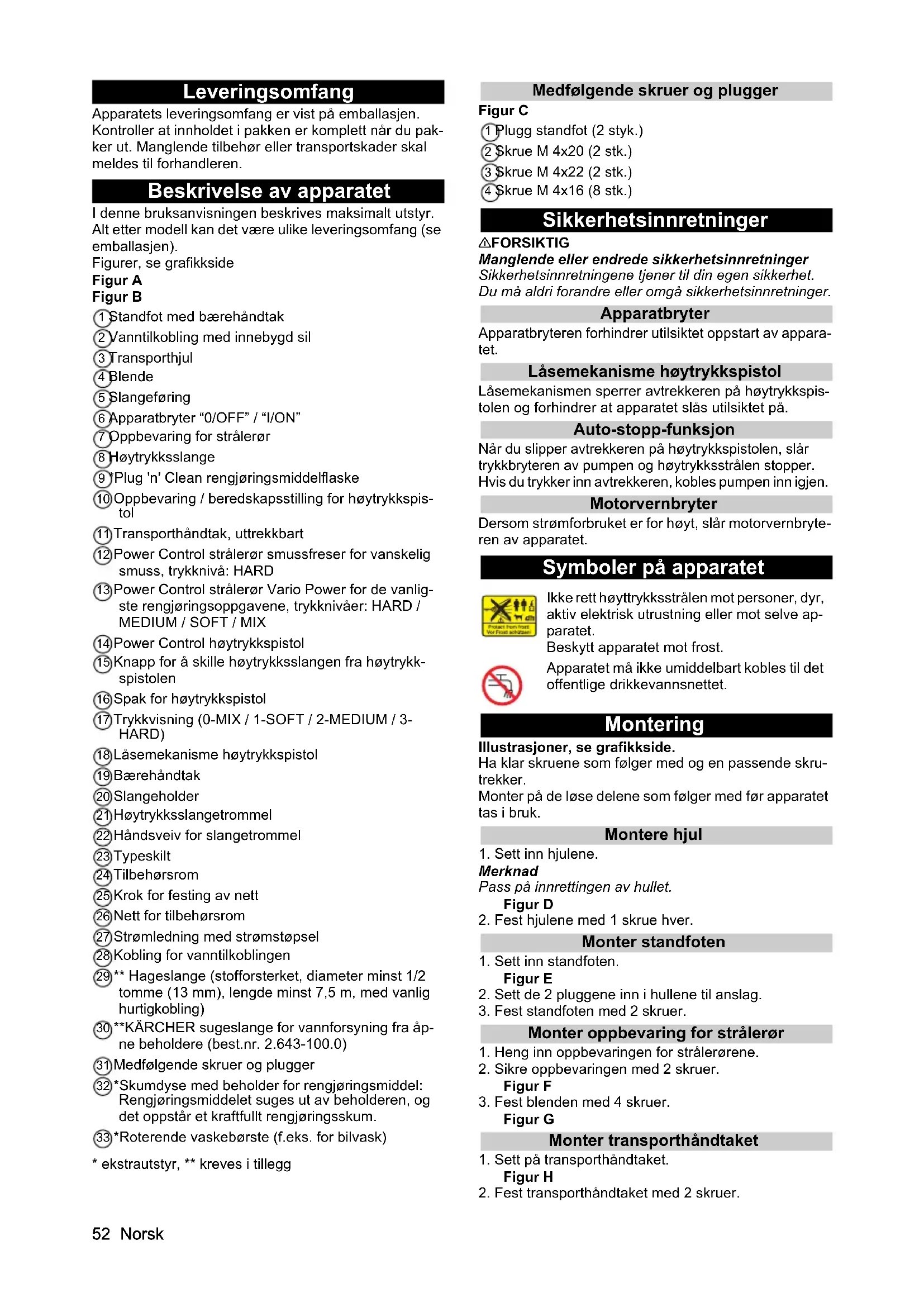 • EU-samsvarserklæring Chairman of the Board of Management Director Regulatory Affairs & Certification H. Jenner S. Reiser52 Norsk Leveringsomfang Apparatets leveringsomfang er vist på emballasjen. Kontroller at innholdet i pakken er komplett når du pak- ker ut. Manglende tilbehør eller transportskader skal meldes til forhandleren. Beskrivelse av apparatet I denne bruksanvisningen beskrives maksimalt utstyr. Alt etter modell kan det være ulike leveringsomfang (se emballasjen). Figurer, se grafikkside Figur A Figur B 1 Standfot med bærehåndtak 2 Vanntilkobling med innebygd sil 3 Transporthjul 4 Blende 5 Slangeføring 6 Apparatbryter “0/OFF” / “I/ON” 7 Oppbevaring for strålerør 8 Høytrykksslange 9 *Plug 'n' Clean rengjøringsmiddelflaske 10 Oppbevaring / beredskapsstilling for høytrykkspis- tol 11 Transporthåndtak, uttrekkbart 12 Power Control strålerør smussfreser for vanskelig smuss, trykknivå: HARD 13 Power Control strålerør Vario Power for de vanlig- ste rengjøringsoppgavene, trykknivåer: HARD / p. 56