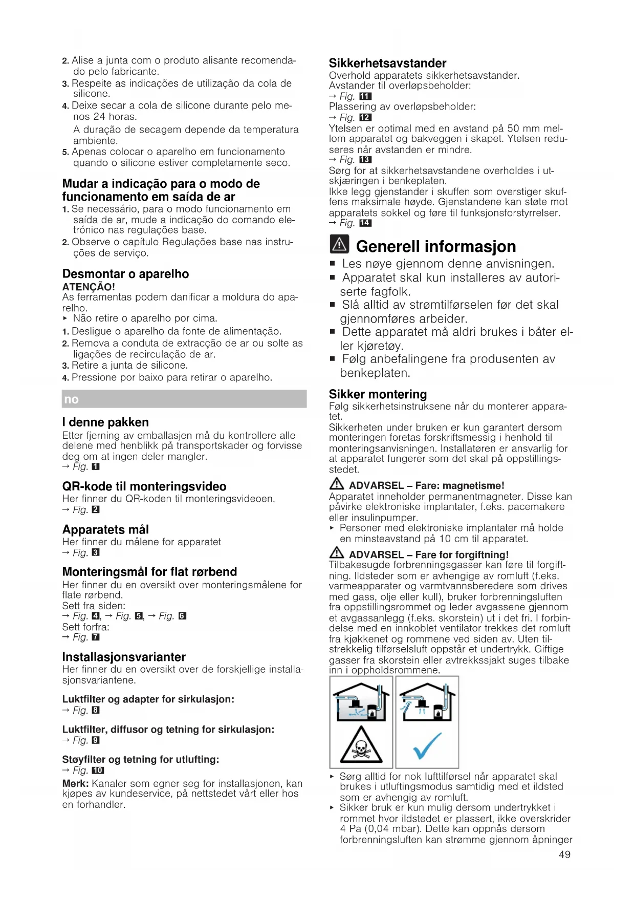 Generell informasjon ¡ Les nøye gjennom denne anvisningen. ¡ Apparatet skal kun installeres av autori- serte fagfolk. ¡ Slå alltid av strømtilførselen før det skal gjennomføres arbeider. ¡ Dette apparatet må aldri brukes i båter el- ler kjøretøy. ¡ Følg anbefalingene fra produsenten av benkeplaten. Sikker montering Følg sikkerhetsinstruksene når du monterer appara- tet. Sikkerheten under bruken er kun garantert dersom monteringen foretas forskriftsmessig i henhold til monteringsanvisningen. Installatøren er ansvarlig for at apparatet fungerer som det skal på oppstillings- stedet. ADVARSEL‒Fare: magnetisme! Apparatet inneholder permanentmagneter. Disse kan påvirke elektroniske implantater, f.eks. pacemakere eller insulinpumper. ▶ Personer med elektroniske implantater må holde en minsteavstand på 10cm til apparatet. ADVARSEL‒Fare for forgiftning! Tilbakesugde forbrenningsgasser kan føre til forgift- ning. Ildsteder som er avhengige av romluft (f.eks. varmeapparater og varmtvannsberedere som drives med gass, olje eller kull), bruker forbrenningsluften fra oppstillingsrommet og leder avgassene gjennom et avgassanlegg (f.eks. skorstein) ut i det fri. I forbin- delse med en innkoblet ventilator trekkes det romluft fra kjøkkenet og rommene ved siden av. Uten til- strekkelig tilførselsluft oppstår et undertrykk. Giftige gasser fra skorstein eller avtrekkssjakt suges tilbake inn i oppholdsrommene. ▶ Sørg alltid for nok lufttilførsel når apparatet skal brukes i utluftingsmodus samtidig med et ildsted som er avhengig av romluft. ▶ Sikker bruk er kun mulig dersom undertrykket i rommet hvor ildstedet er plassert, ikke overskrider 4Pa (0,04mbar). Dette kan oppnås dersom forbrenningsluften kan strømme gjennom åpninger50 som ikke kan lukkes, som f.eks. i dører, vinduer, i forbindelse med en murkasse for tilførsels-/utblås- ningsluft eller ved hjelp av andre tekniske tiltak. Bare en murkasse for tilførsels-/utblåsningsluft er alene ikke tilstrekkelig for å sikre at grenseverdien overholdes. ▶ Du bør uansett rådføre deg med ansvarlig skorsteinsfeiemester som kan bedømme husets tilførsels- og avtrekksluft og foreslå et passende til- tak for ventilasjonen. ▶ Dersom apparatet utelukkende brukes i sirkula- sjonsdrift, er det ingen begrensninger. ADVARSEL‒Brannfare! Fettavleiringer i fettfilteret kan antennes. ▶ Aldri bruk åpen flamme i nærheten av apparatet (f.eks. ved flambering). ▶ Apparatet må kun installeres i nærheten av ildsted for fast brensel (f.eks. ved eller kull) dersom det finnes et lukket deksel som ikke kan tas av. Det må ikke forekomme gnistsprut. ADVARSEL‒Fare for personskade! Endringer på elektriske eller mekaniske komponen- ter er farlige og kan føre til feilfunksjon. ▶ Gjennomfør ingen endringer på elektriske eller mekaniske komponenter. Deler som er tilgjengelige under montering, kan ha skarpe kanter og føre til kuttskader. ▶ Bruk vernehansker Apparatet er tungt. ▶ Det kreves 2 personer når apparatet skal flyttes. ▶ Bruk bare egnede hjelpemidler. ADVARSEL‒Kvelningsfare! Barn kan få emballasjen over hodet eller vikle seg inn i den og kveles. ▶ Hold emballasjen borte fra barn. ▶ Barn må ikke få leke med emballasjen. ADVARSEL‒Fare for forgiftning! Tilbakesugde forbrenningsgasser kan føre til forgift- ning. ▶ Avtrekksluften må ikke ledes inn i en røyk- eller avgasskanal som er i bruk. ▶ Avtrekksluften må ikke ledes inn i en sjakt som brukes til utlufting av rom med ildsted. ▶ Dersom avtrekksluften skal føres igjennom en røyk- eller avgasskanal som ikke er i bruk, må det først innhentes tillatelse fra brannvesenet. Tilbakesugde forbrenningsgasser kan føre til forgift- ning. ▶ Dersom en ventilator installeres sammen med et romluftavhengig ildsted, må strømtilførselen til ven- tilatoren utstyres med en egnet sikkerhetsbryter. Informasjon om den elektriske tilkoblingen For å koble apparatet til strømmen på en sikker måte må du følge disse anvisningene. ADVARSEL‒Fare for elektrisk støt! Det må være mulig å koble apparatet fra strømnettet til enhver tid. Apparatet må kun kobles til en for- skriftsmessig montert stikkontakt. ▶ I henhold til kravene i overspenningskategori III og i henhold til regelverket må det monteres en fler- polet skillebryter i den faste elektriske installasjo- nen. ▶ Den permanente el-installasjonen må kun utføres av elektriker. Vi anbefaler å installere en jordfeil- bryter (FI-bryter) i apparatets strømforsyningskrets. ¡ Ikke la tilkoblingsledningen komme i knekk eller klem, og hold den unna skarpe kanter. ¡ Legg tilkoblingsledningen slik at den ikke kommer borti det varme apparathuset. ¡ Bruk kun den ledningen som følger med appara- tet, eller en ledning levert av teknisk kundeservice. ¡ Dette apparatet oppfyller EU-reglene om radiostøy. ¡ Apparatet er i beskyttelsesklasse 1. Derfor må det kun kobles til en jordet stikkontakt. ¡ Produsenten tar ikke ansvar for driftsfeil eller mu- lige skader grunnet mangelfull elektrisk installa- sjon. Klargjør den elektriske tilkoblingen Forutsetning:Det er kun opplært kundeserviceper- sonale som skal utføre arbeider inne i apparatet eller bytte strømkabelen.