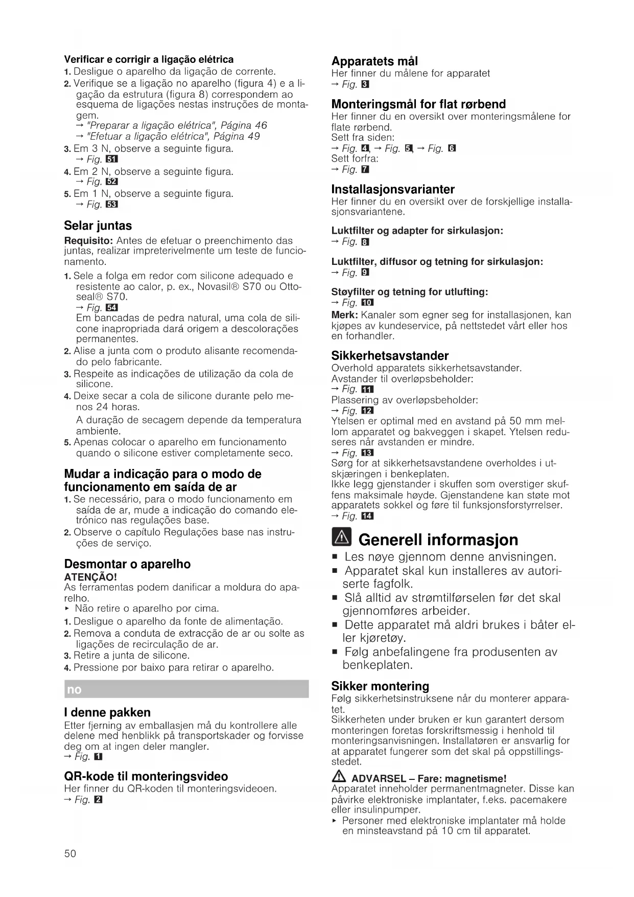 Generell informasjon ¡ Les nøye gjennom denne anvisningen. ¡ Apparatet skal kun installeres av autori- serte fagfolk. ¡ Slå alltid av strømtilførselen før det skal gjennomføres arbeider. ¡ Dette apparatet må aldri brukes i båter el- ler kjøretøy. ¡ Følg anbefalingene fra produsenten av benkeplaten. Sikker montering Følg sikkerhetsinstruksene når du monterer appara- tet. Sikkerheten under bruken er kun garantert dersom monteringen foretas forskriftsmessig i henhold til monteringsanvisningen. Installatøren er ansvarlig for at apparatet fungerer som det skal på oppstillings- stedet. ADVARSEL‒Fare: magnetisme! Apparatet inneholder permanentmagneter. Disse kan påvirke elektroniske implantater, f.eks. pacemakere eller insulinpumper. ▶ Personer med elektroniske implantater må holde en minsteavstand på 10cm til apparatet.51 ADVARSEL‒Fare for forgiftning! Tilbakesugde forbrenningsgasser kan føre til forgift- ning. Ildsteder som er avhengige av romluft (f.eks. varmeapparater og varmtvannsberedere som drives med gass, olje eller kull), bruker forbrenningsluften fra oppstillingsrommet og leder avgassene gjennom et avgassanlegg (f.eks. skorstein) ut i det fri. I forbin- delse med en innkoblet ventilator trekkes det romluft fra kjøkkenet og rommene ved siden av. Uten til- strekkelig tilførselsluft oppstår et undertrykk. Giftige gasser fra skorstein eller avtrekkssjakt suges tilbake inn i oppholdsrommene. ▶ Sørg alltid for nok lufttilførsel når apparatet skal brukes i utluftingsmodus samtidig med et ildsted som er avhengig av romluft. ▶ Sikker bruk er kun mulig dersom undertrykket i rommet hvor ildstedet er plassert, ikke overskrider 4Pa (0,04mbar). Dette kan oppnås dersom forbrenningsluften kan strømme gjennom åpninger som ikke kan lukkes, som f.eks. i dører, vinduer, i forbindelse med en murkasse for tilførsels-/utblås- ningsluft eller ved hjelp av andre tekniske tiltak. Bare en murkasse for tilførsels-/utblåsningsluft er alene ikke tilstrekkelig for å sikre at grenseverdien overholdes. ▶ Du bør uansett rådføre deg med ansvarlig skorsteinsfeiemester som kan bedømme husets tilførsels- og avtrekksluft og foreslå et passende til- tak for ventilasjonen. ▶ Dersom apparatet utelukkende brukes i sirkula- sjonsdrift, er det ingen begrensninger. ADVARSEL‒Brannfare! Fettavleiringer i fettfilteret kan antennes. ▶ Aldri bruk åpen flamme i nærheten av apparatet (f.eks. ved flambering). ▶ Apparatet må kun installeres i nærheten av ildsted for fast brensel (f.eks. ved eller kull) dersom det finnes et lukket deksel som ikke kan tas av. Det må ikke forekomme gnistsprut. ADVARSEL‒Fare for personskade! Endringer på elektriske eller mekaniske komponen- ter er farlige og kan føre til feilfunksjon. ▶ Gjennomfør ingen endringer på elektriske eller mekaniske komponenter. Deler som er tilgjengelige under montering, kan ha skarpe kanter og føre til kuttskader. ▶ Bruk vernehansker Apparatet er tungt. ▶ Det kreves 2 personer når apparatet skal flyttes. ▶ Bruk bare egnede hjelpemidler. ADVARSEL‒Kvelningsfare! Barn kan få emballasjen over hodet eller vikle seg inn i den og kveles. ▶ Hold emballasjen borte fra barn. ▶ Barn må ikke få leke med emballasjen. ADVARSEL‒Fare for forgiftning! Tilbakesugde forbrenningsgasser kan føre til forgift- ning. ▶ Avtrekksluften må ikke ledes inn i en røyk- eller avgasskanal som er i bruk. ▶ Avtrekksluften må ikke ledes inn i en sjakt som brukes til utlufting av rom med ildsted. ▶ Dersom avtrekksluften skal føres igjennom en røyk- eller avgasskanal som ikke er i bruk, må det først innhentes tillatelse fra brannvesenet. Tilbakesugde forbrenningsgasser kan føre til forgift- ning. ▶ Dersom en ventilator installeres sammen med et romluftavhengig ildsted, må strømtilførselen til ven- tilatoren utstyres med en egnet sikkerhetsbryter. Informasjon om den elektriske tilkoblingen For å koble apparatet til strømmen på en sikker måte må du følge disse anvisningene. ADVARSEL‒Fare for elektrisk støt! Det må være mulig å koble apparatet fra strømnettet til enhver tid. Apparatet må kun kobles til en for- skriftsmessig montert stikkontakt. ▶ I henhold til kravene i overspenningskategori III og i henhold til regelverket må det monteres en fler- polet skillebryter i den faste elektriske installasjo- nen. ▶ Den permanente el-installasjonen må kun utføres av elektriker. Vi anbefaler å installere en jordfeil- bryter (FI-bryter) i apparatets strømforsyningskrets. ¡ Ikke la tilkoblingsledningen komme i knekk eller klem, og hold den unna skarpe kanter. ¡ Legg tilkoblingsledningen slik at den ikke kommer borti det varme apparathuset. ¡ Bruk kun den ledningen som følger med appara- tet, eller en ledning levert av teknisk kundeservice. ¡ Dette apparatet oppfyller EU-reglene om radiostøy. ¡ Apparatet er i beskyttelsesklasse 1. Derfor må det kun kobles til en jordet stikkontakt. ¡ Produsenten tar ikke ansvar for driftsfeil eller mu- lige skader grunnet mangelfull elektrisk installa- sjon. Klargjør den elektriske tilkoblingen Forutsetning:Det er kun opplært kundeserviceper- sonale som skal utføre arbeider inne i apparatet eller bytte strømkabelen.