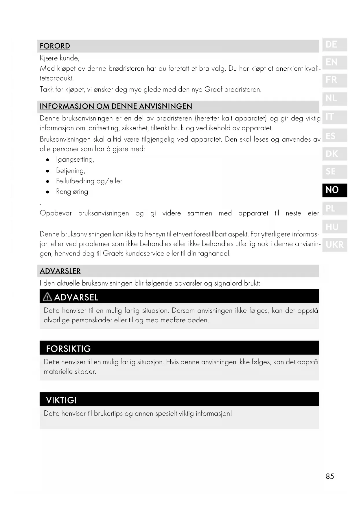 UKR og til og med døden. ● Sammenlign tilkoblingsinformasjonen (spenning og frekvens) på types- kiltet med den for strømnettet før du kobler til apparatet. Disse opplys- ningene må samsvare, slik at apparatet ikke blir skadet. ● Forsikre deg om at strømkabelen ligger som den skal. Enheten kan falle av arbeidsflaten hvis den blir fanget på kabelen. ● Pakningsmaterialer skal ikke brukes til å leke med. Det er fare for kvel- ning. ● Bruk aldri apparatet i nærheten av en varmekilde. ● Bruk aldri apparatet utendørs og oppbevar det på et tørt sted. ● Støpselet må fjernes fra stikkontakten, etter hver bruk og før hver reng- jøring. ● Trekk ut støpselet før hver rengjøring. ● La apparatet avkjøles før hver rengjøring. ● Ikke bruk aggressive eller skurende rengjøringsmidler, og heller ikke løsemidler. ● Ikke skrap av vanskelige tilsmussinger med harde gjenstander. ● Pass på at det ikke slippes ut væske til apparatets innside. ● Brødslissene skal ikke dekkes til, det er brannfare. ● Brød kan brenne. Bruk derfor ikke brødristeren i nærheten av eller un- der lett antennelige materialer, slik som f.eks. gardiner. ● Pass på at lift-tasten alltid kan bevege seg fritt, ellers kan brødristeren ikke slå seg av automatis, da lift-tasten holdes fast elektromagnetisk. ● Grip aldri ned brødslissen med fingrene. ● Ikke stikk noen gjenstander i metall, plast eller lignende materialer inn i brødslissen. ● Bruk aldri apparatet uten smuleskuff.. ● Bruk apparatet kun i oppreist tilstand, ta aldri apparatet i bruk når det ligger på siden eller oppned. ● Hvis ristegodset klemmes fast, trekk ut støpselet og la apparatet kjøle seg ned og ta forsikrig ut ristegodset. Pass på at du ikke berører var- meelementene.88 ● Tøm smuleskuffen regelmessig. FARE PÅ GRUNN AV ELEKTRISK STRØM ADVARSEL Kontakt med spenningsførende ledninger eller komponenter er livsfarlig! Overhold følgende sikkerhetsanvisninger for å unngå en fare på grunn av elektrisk strøm: ● Ikke bruk apparatet hvis strømledningen eller støpselet er skadet. ● Få i så fall en ny strømledning installert av Graefs kundeservice eller en autorisert fagper- son før videre bruk av apparatet. ● Huset på apparatet må ikke under noen omstendigheter åpnes. Hvis spenningsførende tilkoblinger berøres og den elektriske og mekaniske oppbygningen forandres, er det fare for elektrisk støt. ● Berør aldri deler som står under spenning. Dette kan føre til elektrisk støt og til og med døden. TILTENKT BRUK Dette apparatet er ikke beregnet til kommersiell bruk. Dette apparatet er kun beregnet til bruk i private husholdninger og lignende områder, slik som f.eks.: ● På medarbeiderkjøkken i butikker og på kontorer ● I landbruksvirksomheter ● Av gjester ved hoteller, moteller og andre boinnretninger ● Ved frokostpensjonater. VIKTIG! Skal kun brukes i husholdningslignende bruk! Annen bruk eller bruk utover dette regnes som ikke-formålsbestemt bruk. FORSIKTIG Hvis apparatet ikke brukes som beregnet, kan det oppstå farlige situasjoner. ● Bruk kun apparatet til beregnet formål. ● Fremgangsmåtene som er beskrevet i denne bruksanvisningen, må overholdes. Krav av enhver type på grunn av skader som er oppstått ved ikke-formålsbestemt bruk, uteluk- kes. Risikoen overtas av operatøren alene. GARANTIBEGRENSNING Alle tekniske opplysninger, data og anvisninger for installasjon, drift og vedlikehold som finnes i denne bruksanvisningen, er nyeste standard ved trykking og er gitt med hensyn til være tidligere erfaringer og kunnskaper etter beste viten.89