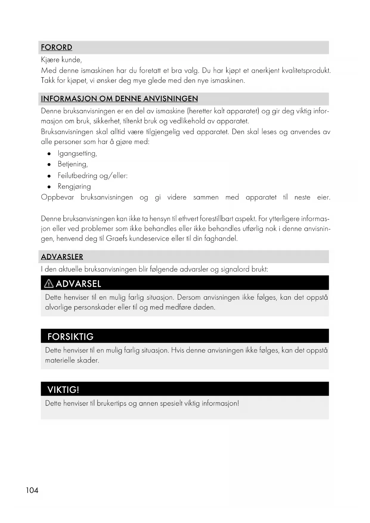 Denne bruksanvisningen er en del av ismaskine (heretter kalt apparatet) og gir deg viktig infor- masjon om bruk, sikkerhet, tiltenkt bruk og vedlikehold av apparatet. Bruksanvisningen skal alltid være tilgjengelig ved apparatet. Den skal leses og anvendes av alle personer som har å gjøre med: ● Igangsetting, ● Betjening, ● Feilutbedring og/eller: ● Rengjøring Oppbevar bruksanvisningen og gi videre sammen med apparatet til neste eier. Denne bruksanvisningen kan ikke ta hensyn til ethvert forestillbart aspekt. For ytterligere informas- jon eller ved problemer som ikke behandles eller ikke behandles utførlig nok i denne anvisnin- gen, henvend deg til Graefs kundeservice eller til din faghandel. ADVARSLER I den aktuelle bruksanvisningen blir følgende advarsler og signalord brukt: ADVARSEL Dette henviser til en mulig farlig situasjon. Dersom anvisningen ikke følges, kan det oppstå alvorlige personskader eller til og med medføre døden. FORSIKTIG Dette henviser til en mulig farlig situasjon. Hvis denne anvisningen ikke følges, kan det oppstå materielle skader. VIKTIG! Dette henviser til brukertips og annen spesielt viktig informasjon!105