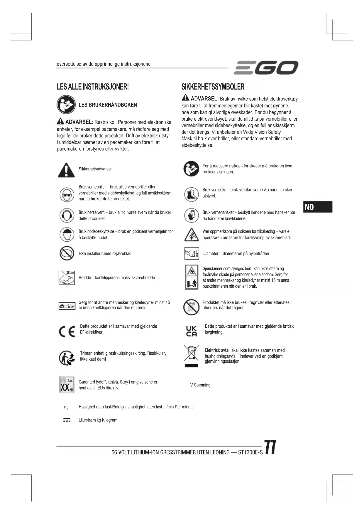 ◾ Fjern batteripakken fra trimmeren når den ikke er i bruk. ◾ Rengjør verktøyet grundig før lagring. ◾ Lagre enheten tørt og godt ventilert, låst inne eller høyt oppe, og utilgjengelig for barn. Ikke oppbevar enheten på eller nær gjødsel, bensin eller andre kjemikalier. Beskytt miljøet Elektrisk utstyr, batteriladere og batterier / oppladbare batterier må ikke kastes i husholdningsavfallet! Ta med dette produktet til autorisert gjenvinning, og gjør det tilgjengelig for separat innsamling. Elektriske verktøy må returneres til et egnet resirkuleringsanlegg.56 VOLT LITHIUM-ION GRESSTRIMMER UTEN LEDNING — ST1300E-S82