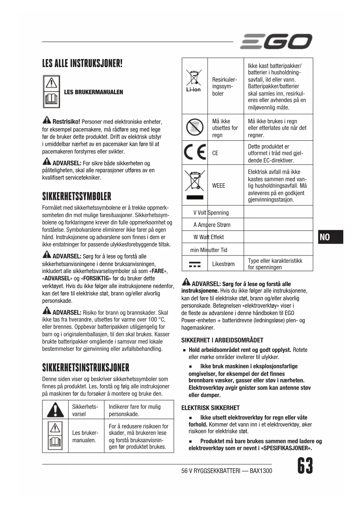 LES ALLE INSTRUKSJONER! LES BRUKERMANUALEN Restrisiko! Personer med elektroniske enheter, for eksempel pacemakere, må rådføre seg med lege før de bruker dette produktet. Drift av elektrisk utstyr i umiddelbar nærhet av en pacemaker kan føre til at pacemakeren forstyrres eller svikter. ADVARSEL: For sikre både sikkerheten og påliteligheten, skal alle reparasjoner utføres av en kvalisert servicetekniker. SIKKERHETSSYMBOLER Formålet med sikkerhetssymbolene er å trekke oppmerk-somheten din mot mulige faresituasjoner. Sikkerhetssym-bolene og forklaringene krever din fulle oppmerksomhet og forståelse. Symbolvarslene eliminerer ikke farer på egen hånd. Instruksjonene og advarslene som finnes i dem er ikke erstatninger for passende ulykkesforebyggende tiltak. ADVARSEL: Sørg for å lese og forstå alle sikkerhetsanvisningene i denne bruksanvisningen, inkludert alle sikkerhetsvarselsymboler så som «FARE», «ADVARSEL» og «FORSIKTIG» før du bruker dette verktøyet. Hvis du ikke følger alle instruksjonene nedenfor, kan det føre til elektriske støt, brann og/eller alvorlig personskade. ADVARSEL: Risiko for brann og brannskader. Skal ikke tas fra hverandre, utsettes for varme over 100 °C, eller brennes. Oppbevar batteripakken utilgjengelig for barn og i originalemballasjen, til den skal brukes. Kasser brukte batteripakker omgående i samsvar med lokale bestemmelser for gjenvinning eller avfallsbehandling. SIKKERHETSINSTRUKSJONER Denne siden viser og beskriver sikkerhetssymboler som finnes på produktet. Les, forstå og følg alle instruksjoner på maskinen før du forsøker å montere og bruke den.Sikkerhets-varselIndikerer fare for mulig personskade.Les bruker-manualen.For å redusere risikoen for skader, må brukeren lese og forstå bruksanvisnin-gen før produktet brukes. Li-ion Resirkuler-ingssym-bolerIkke kast batteripakker/batterier i husholdning-savfall, ild eller vann. Batteripakker/batterier skal samles inn, resirkul-eres eller avhendes på en miljøvennlig måte.Må ikke utsettes for regn Må ikke brukes i regn eller etterlates ute når det regner. Dette produktet er utformet i tråd med gjel-dende EC-direktiver. WEEE Elektrisk avfall må ikke kastes sammen med van-lig husholdningsavfall. Må avleveres på en godkjent gjenvinningsstasjon.V Volt SpenningA Ampere StrømW Watt Effektmin Minutter TidLikestrømType eller karakteristikk for spenningen ADVARSEL: Sørg for å lese og forstå alle instruksjonene. Hvis du ikke følger alle instruksjonene, kan det føre til elektriske støt, brann og/eller alvorlig personskade. Betegnelsen «elektroverktøy» viser i de este av advarslene i denne håndboken til EGO Power-enheten + batteridrevne (ledningsløse) plen- og hagemaskiner.