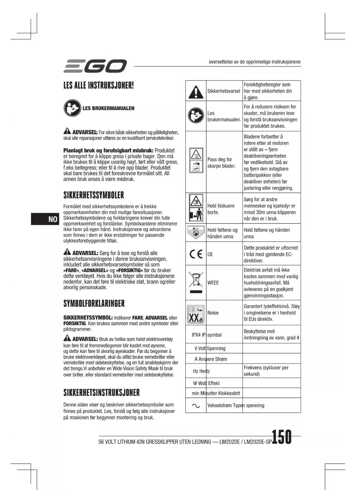 NoiseGarantert lydeffektnivå. Støy i omgivelsene er i henhold til EUs direktiv.IPX4 IP-symbolBeskyttelse mot inntrengning av vann, grad 4V Volt SpenningA Ampere StrømHz HertzFrekvens (sykluser per sekund)W Watt Effektmin Minutter KlokkeslettVekselstrøm Typen spenningoversettelse av de opprinnelige instruksjonene56 VOLT LITHIUM-ION GRESSKLIPPER UTEN LEDNING — LM2020E / LM2020E-SP 151