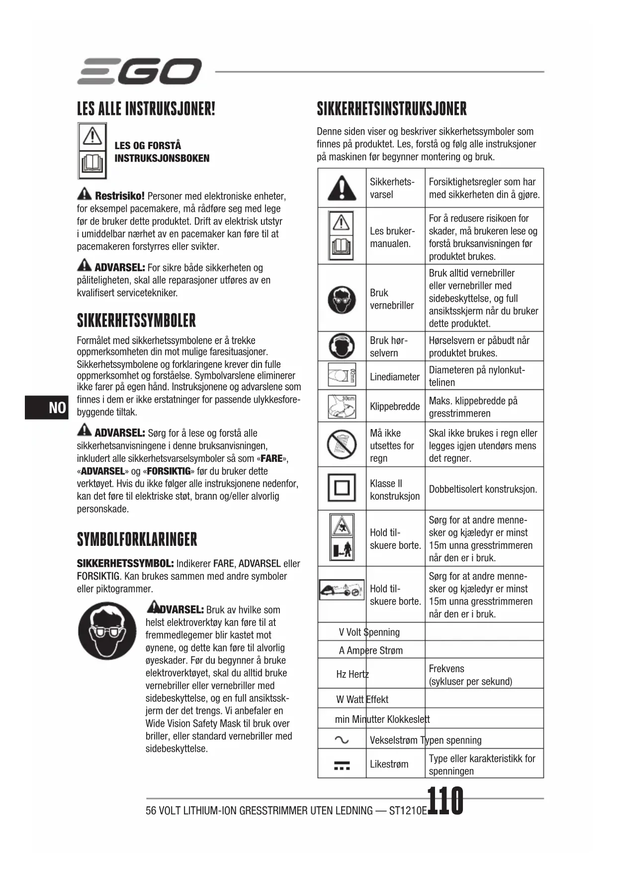 INSTRUKSJONSBOKEN Restrisiko! Personer med elektroniske enheter, for eksempel pacemakere, må rådføre seg med lege før de bruker dette produktet. Drift av elektrisk utstyr i umiddelbar nærhet av en pacemaker kan føre til at pacemakeren forstyrres eller svikter. ADVARSEL: For sikre både sikkerheten og påliteligheten, skal alle reparasjoner utføres av en kvalisert servicetekniker. SIKKERHETSSYMBOLER Formålet med sikkerhetssymbolene er å trekke oppmerksomheten din mot mulige faresituasjoner. Sikkerhetssymbolene og forklaringene krever din fulle oppmerksomhet og forståelse. Symbolvarslene eliminerer ikke farer på egen hånd. Instruksjonene og advarslene som nnes i dem er ikke erstatninger for passende ulykkesfore- byggende tiltak. ADVARSEL: Sørg for å lese og forstå alle sikkerhetsanvisningene i denne bruksanvisningen, inkludert alle sikkerhetsvarselsymboler så som «FARE», «ADVARSEL» og «FORSIKTIG» før du bruker dette verktøyet. Hvis du ikke følger alle instruksjonene nedenfor, kan det føre til elektriske støt, brann og/eller alvorlig personskade. SYMBOLFORKLARINGER SIKKERHETSSYMBOL: Indikerer FARE, ADVARSEL eller FORSIKTIG. Kan brukes sammen med andre symboler eller piktogrammer. ADVARSEL: Bruk av hvilke som helst elektroverktøy kan føre til at fremmedlegemer blir kastet mot øynene, og dette kan føre til alvorlig øyeskader. Før du begynner å bruke elektroverktøyet, skal du alltid bruke vernebriller eller vernebriller med sidebeskyttelse, og en full ansiktssk- jerm der det trengs. Vi anbefaler en Wide Vision Safety Mask til bruk over briller, eller standard vernebriller med sidebeskyttelse. SIKKERHETSINSTRUKSJONER Denne siden viser og beskriver sikkerhetssymboler som nnes på produktet. Les, forstå og følg alle instruksjoner på maskinen før begynner montering og bruk. Sikkerhets- varsel Forsiktighetsregler som har med sikkerheten din å gjøre. Les bruker- manualen. For å redusere risikoen for skader, må brukeren lese og forstå bruksanvisningen før produktet brukes. Bruk vernebriller Bruk alltid vernebriller eller vernebriller med sidebeskyttelse, og full ansiktsskjerm når du bruker dette produktet. Bruk hør- selvern Hørselsvern er påbudt når produktet brukes. Ø2mm Linediameter Diameteren på nylonkut- telinen Klippebredde Maks. klippebredde på gresstrimmeren Må ikke utsettes for regn Skal ikke brukes i regn eller legges igjen utendørs mens det regner. Klasse II konstruksjon Dobbeltisolert konstruksjon. Hold til- skuere borte. Sørg for at andre menne- sker og kjæledyr er minst 15m unna gresstrimmeren når den er i bruk. 15m Hold til- skuere borte. Sørg for at andre menne- sker og kjæledyr er minst 15m unna gresstrimmeren når den er i bruk. V Volt Spenning A Ampere Strøm Hz Hertz Frekvens (sykluser per sekund) W Watt Effekt min Minutter Klokkeslett Vekselstrøm Typen spenning Likestrøm Type eller karakteristikk for spenningen56 VOLT LITHIUM-ION GRESSTRIMMER UTEN LEDNING — ST1210E