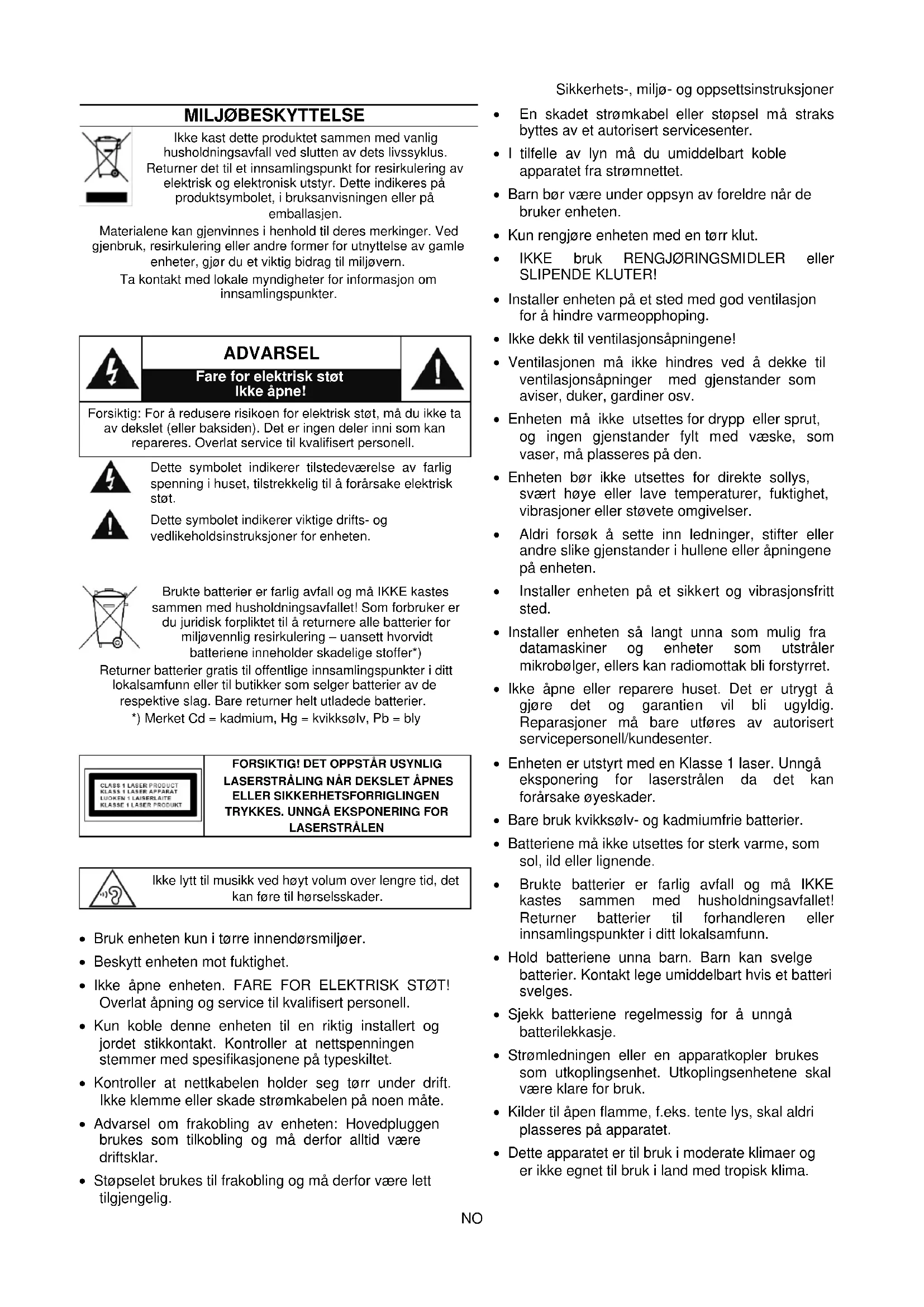 Bruk enheten kun i tørre innendørsmiljøer. Beskytt enheten mot fuktighet. Ikke åpne enheten. FARE FOR ELEKTRISK STØT! Overlat åpning og service til kvalifisert personell. Kun koble denne enheten til en riktig installert og jordet stikkontakt. Kontroller at nettspenningen stemmer med spesifikasjonene på typeskiltet. Kontroller at nettkabelen holder seg tørr under drift. Ikke klemme eller skade strømkabelen på noen måte. Advarsel om frakobling av enheten: Hovedpluggen brukes som tilkobling og må derfor alltid være driftsklar. Støpselet brukes til frakobling og må derfor være lett tilgjengelig. En skadet strømkabel eller støpsel må straks byttes av et autorisert servicesenter. I tilfelle av lyn må du umiddelbart koble apparatet fra strømnettet. Barn bør være under oppsyn av foreldre når de bruker enheten. Kun rengjøre enheten med en tørr klut. IKKE bruk RENGJØRINGSMIDLER eller SLIPENDE KLUTER! Installer enheten på et sted med god ventilasjon for å hindre varmeopphoping. Ikke dekk til ventilasjonsåpningene! Ventilasjonen må ikke hindres ved å dekke til ventilasjonsåpninger med gjenstander som aviser, duker, gardiner osv. Enheten må ikke utsettes for drypp eller sprut, og ingen gjenstander fylt med væske, som vaser, må plasseres på den. Enheten bør ikke utsettes for direkte sollys, svært høye eller lave temperaturer, fuktighet, vibrasjoner eller støvete omgivelser. Aldri forsøk å sette inn ledninger, stifter eller andre slike gjenstander i hullene eller åpningene på enheten. Installer enheten på et sikkert og vibrasjonsfritt sted. Installer enheten så langt unna som mulig fra datamaskiner og enheter som utstråler mikrobølger, ellers kan radiomottak bli forstyrret. Ikke åpne eller reparere huset. Det er utrygt å gjøre det og garantien vil bli ugyldig. Reparasjoner må bare utføres av autorisert servicepersonell/kundesenter. Enheten er utstyrt med en Klasse 1 laser. Unngå eksponering for laserstrålen da det kan forårsake øyeskader. Bare bruk kvikksølv- og kadmiumfrie batterier. Batteriene må ikke utsettes for sterk varme, som sol, ild eller lignende. Brukte batterier er farlig avfall og må IKKE kastes sammen med husholdningsavfallet! Returner batterier til forhandleren eller innsamlingspunkter i ditt lokalsamfunn. Hold batteriene unna barn. Barn kan svelge batterier. Kontakt lege umiddelbart hvis et batteri svelges. Sjekk batteriene regelmessig for å unngå batterilekkasje. Strømledningen eller en apparatkopler brukes som utkoplingsenhet. Utkoplingsenhetene skal være klare for bruk. Kilder til åpen flamme, f.eks. tente lys, skal aldri plasseres på apparatet. Dette apparatet er til bruk i moderate klimaer og er ikke egnet til bruk i land med tropisk klima.CD9250