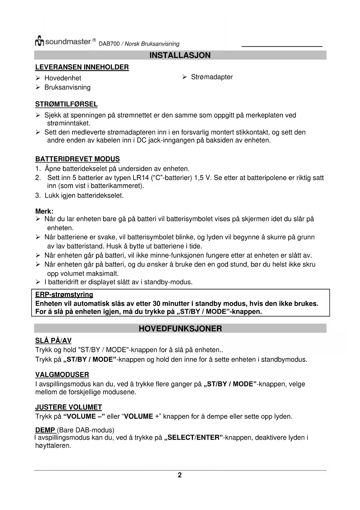 Merk: ➢ Når du lar enheten bare gå på batteri vil batterisymbolet vises på skjermen idet du slår på enheten. ➢ Når batteriene er svake, vil batterisymbolet blinke, og lyden vil begynne å skurre på grunn av lav batteristand. Husk å bytte ut batteriene i tide. ➢ Når enheten går på batteri, vil ikke minne-funksjonen fungere etter at enheten er slått av. ➢ Når enheten går på batteri, og du ønsker å bruke den en god stund, bør du helst ikke skru opp volumet maksimalt. ➢ I batteridrift er displayet slått av i standby-modus. ERP-strømstyring Enheten vil automatisk slås av etter 30 minutter i standby modus, hvis den ikke brukes. For å slå på enheten igjen, må du trykke på „ST/BY / MODE”-knappen. HOVEDFUNKSJONER