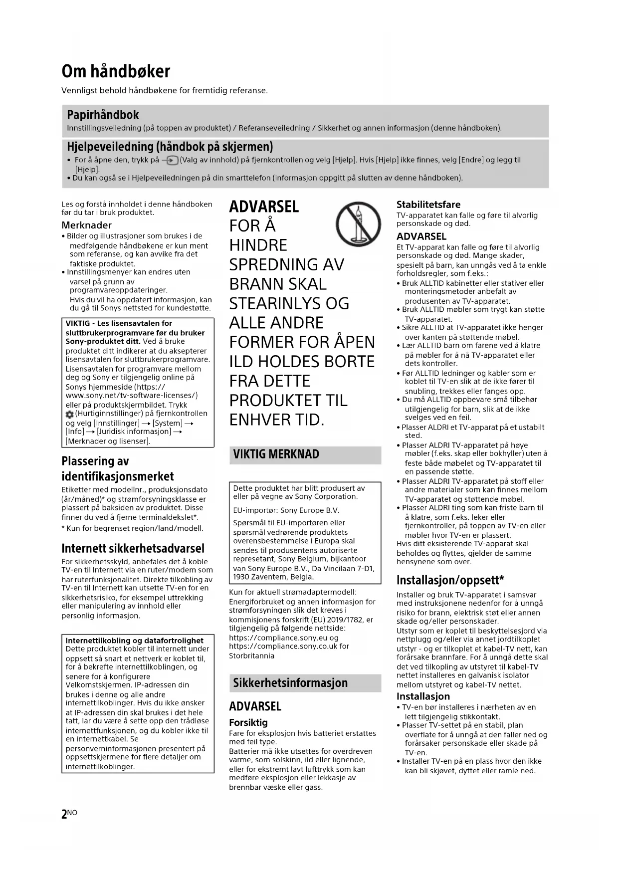 FRA DETTE PRODUKTET TIL ENHVER TID. Kun for aktuell strømadaptermodell:Energiforbruket og annen informasjon for strømforsyningen slik det kreves i kommisjonens forskrift (EU) 2019/1782, er tilgjengelig på følgende nettside: https://compliance.sony.eu og https://compliance.sony.co.uk for Storbritannia ADVARSEL Forsiktig Fare for eksplosjon hvis batteriet erstattes med feil type.Batterier må ikke utsettes for overdreven varme, som solskinn, ild eller lignende, eller for ekstremt lavt lufttrykk som kan medføre eksplosjon eller lekkasje av brennbar væske eller gass. Stabilitetsfare TV-apparatet kan falle og føre til alvorlig personskade og død. ADVARSEL Et TV-apparat kan falle og føre til alvorlig personskade og død. Mange skader, spesielt på barn, kan unngås ved å ta enkle forholdsregler, som f.eks.:• Bruk ALLTID kabinetter eller stativer eller monteringsmetoder anbefalt av produsenten av TV-apparatet.• Bruk ALLTID møbler som trygt kan støtte TV-apparatet.• Sikre ALLTID at TV-apparatet ikke henger over kanten på støttende møbel.• Lær ALLTID barn om farene ved å klatre på møbler for å nå TV-apparatet eller dets kontroller.• Før ALLTID ledninger og kabler som er koblet til TV-en slik at de ikke fører til snubling, trekkes eller fanges opp.• Du må ALLTID oppbevare små tilbehør utilgjengelig for barn, slik at de ikke svelges ved en feil.• Plasser ALDRI et TV-apparat på et ustabilt sted.• Plasser ALDRI TV-apparatet på høye møbler (f.eks. skap eller bokhyller) uten å feste både møbelet og TV-apparatet til en passende støtte.• Plasser ALDRI TV-apparatet på stoff eller andre materialer som kan finnes mellom TV-apparatet og støttende møbel.• Plasser ALDRI ting som kan friste barn til å klatre, som f.eks. leker eller fjernkontroller, på toppen av TV-en eller møbler hvor TV-en er plassert.Hvis ditt eksisterende TV-apparat skal beholdes og flyttes, gjelder de samme hensynene som over. Installasjon/oppsett* Installer og bruk TV-apparatet i samsvar med instruksjonene nedenfor for å unngå risiko for brann, elektrisk støt eller annen skade og/eller personskader.Utstyr som er koplet til beskyttelsesjord via nettplugg og/eller via annet jordtilkoplet utstyr - og er tilkoplet et kabel-TV nett, kan forårsake brannfare. For å unngå dette skal det ved tilkopling av utstyret til kabel-TV nettet installeres en galvanisk isolator mellom utstyret og kabel-TV nettet. Installasjon