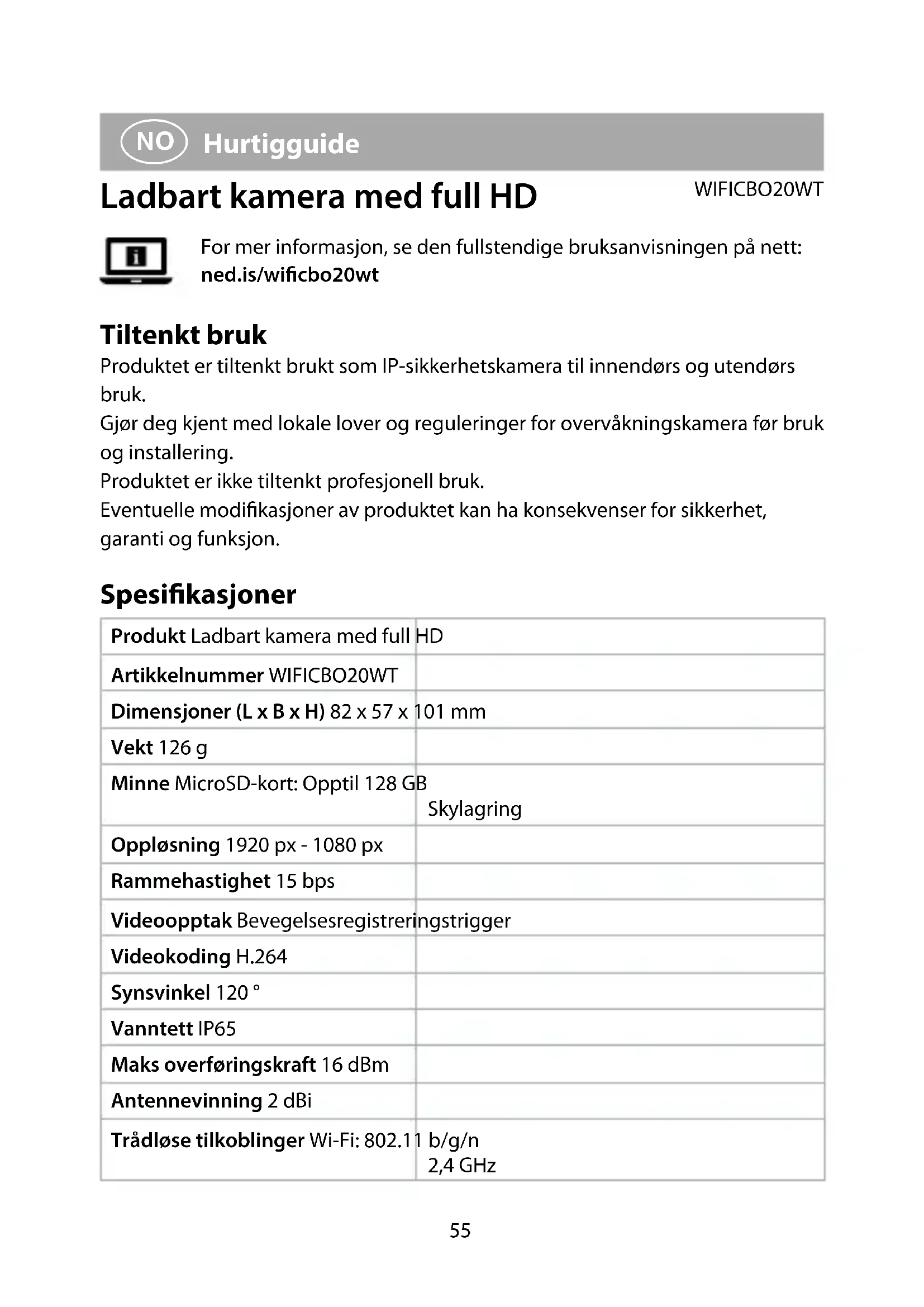 WIFICBO20WT - Overvåkingskamera NEDIS - Gratis bruksanvisning og manual